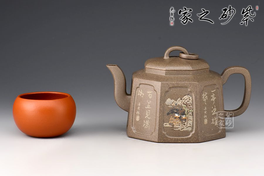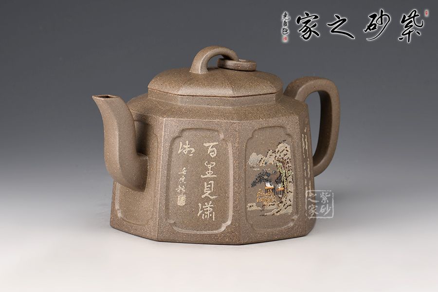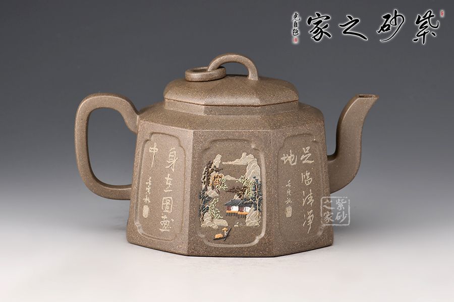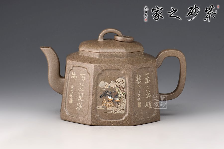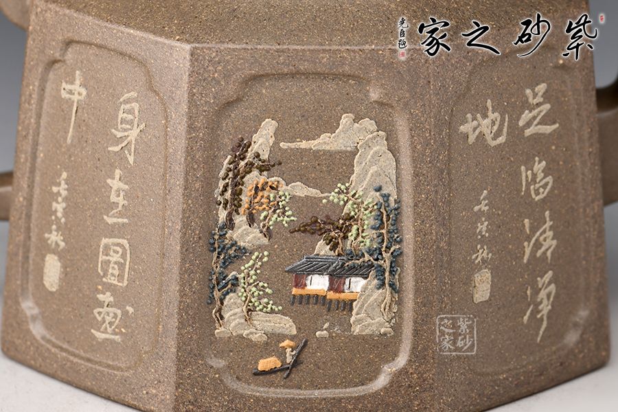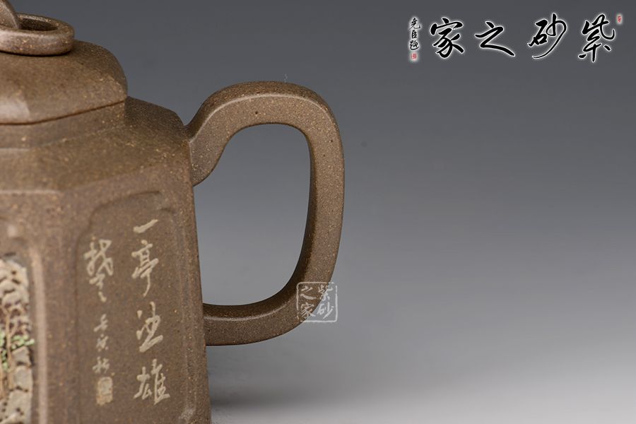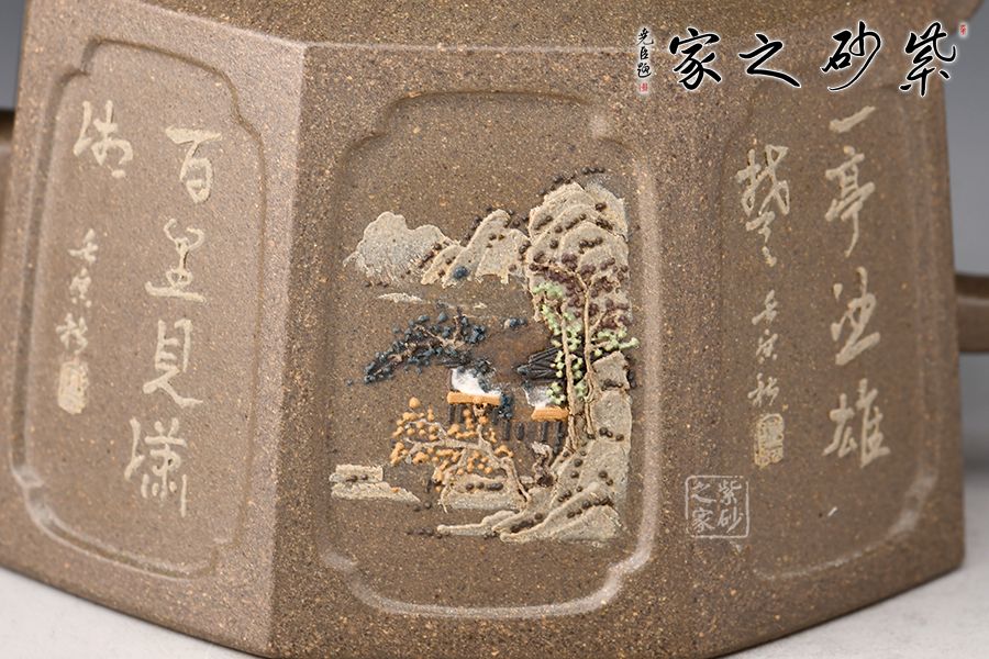半鈕八方,每面都由兩片泥片合成然后進行挖空,刻詩畫于壺身,再現(xiàn)文人風(fēng)骨。