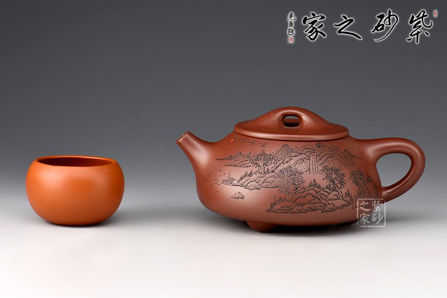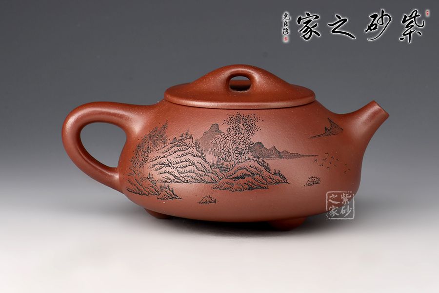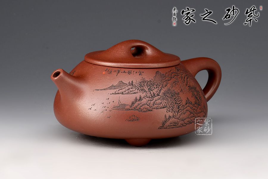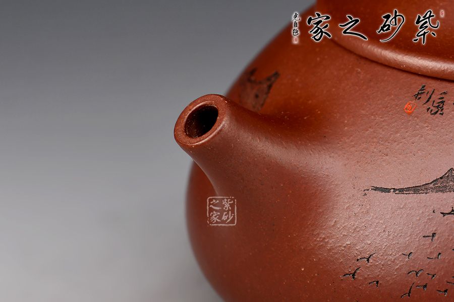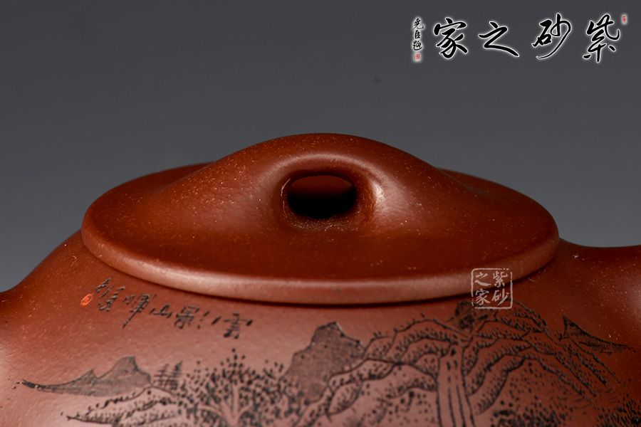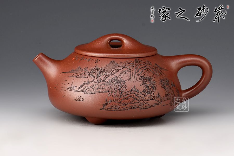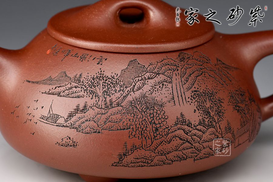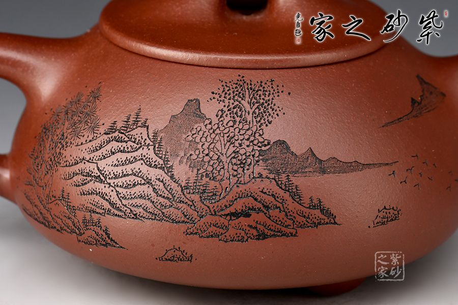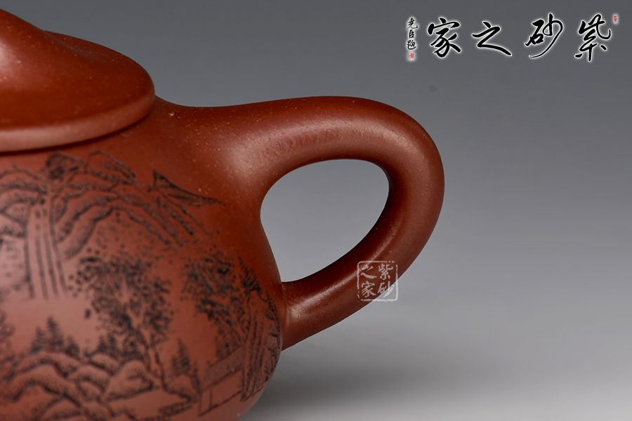 此壺為作者摹古而作,以景舟石瓢為型,龍血砂作胎,全手工精制而成,泥色溫潤(rùn)古雅,造型簡(jiǎn)約大方。壺身呈八字造型,豐潤(rùn)飽滿,曲線柔和流暢,平壓蓋、橋鈕,拿取自如,直流簡(jiǎn)而有力,出水順暢,壺把上豐下斂,與壺身之型形成和諧的美學(xué)效果,底部三乳足給人以輕靈而穩(wěn)重之感。整器比例精湛,骨肉亭勻,氣韻充沛。刻繪山水之景,賞用藏皆可!