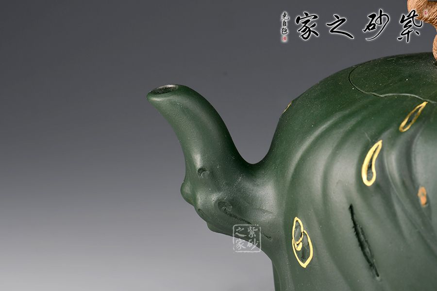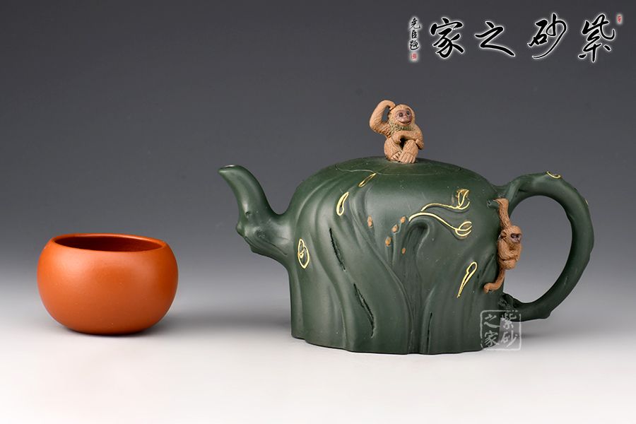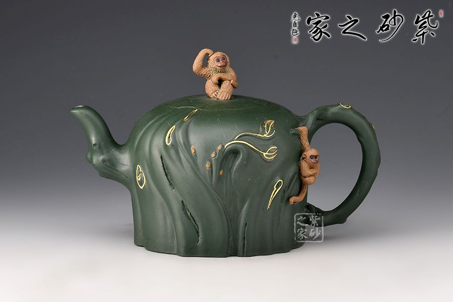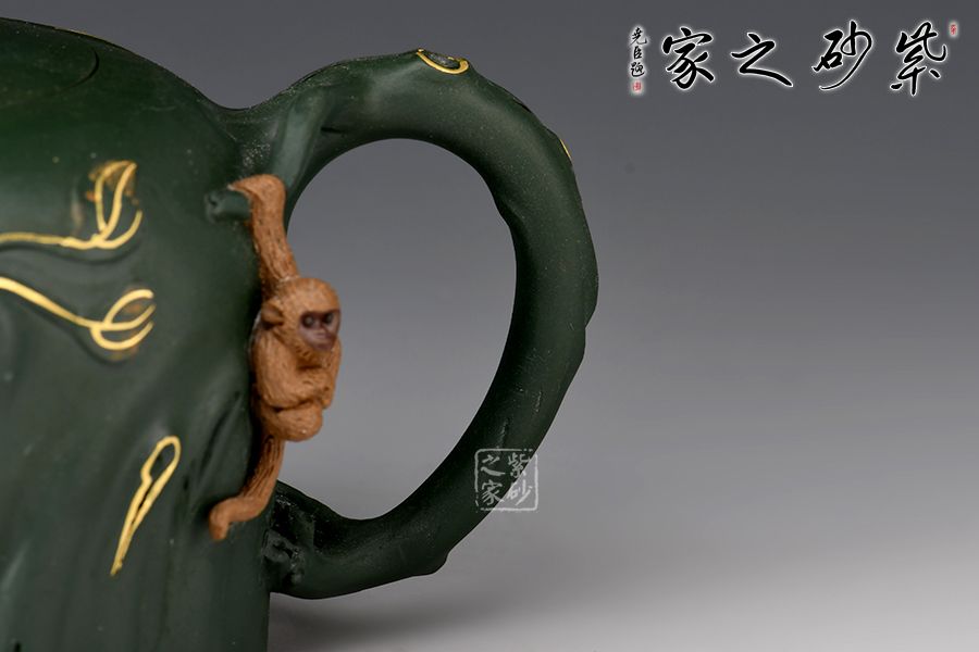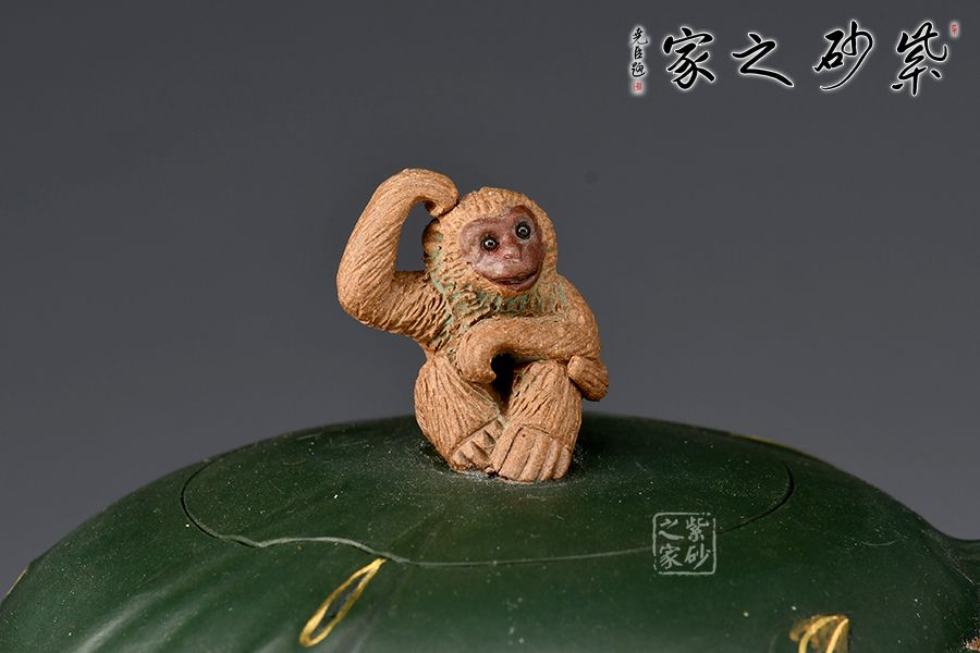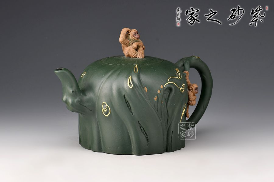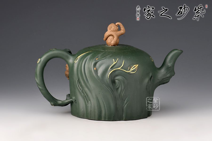 壺身以樹樁為形、把、鈕以樹枝隨形捏制,形態(tài)逼真,生動自然;節(jié)疤的處理很是精致;嵌蓋設(shè)計氣密性好,壺鈕雕塑設(shè)計,一只小猴子活靈活現(xiàn),眺望遠(yuǎn)方。整器仿生形象,注重細(xì)節(jié),生動自然,值得推薦!