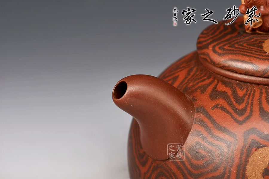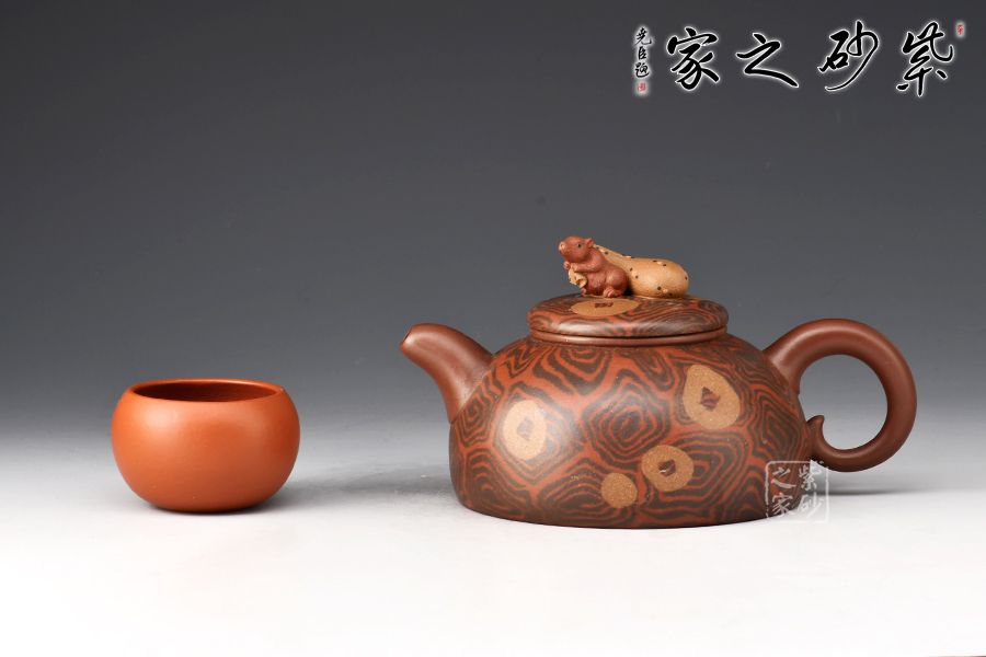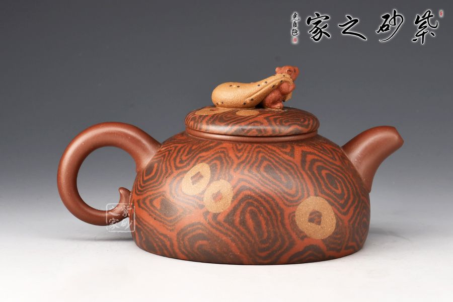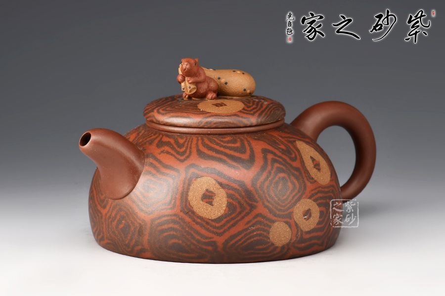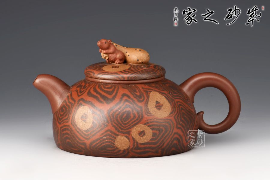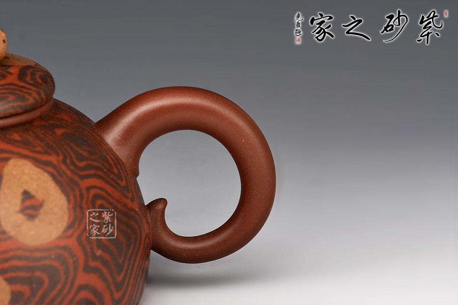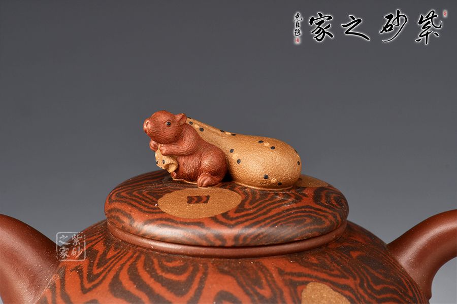 壺身就是一個(gè)工整的半球型,平整的底部和圓滑的外觀展現(xiàn)了紫砂的工藝美感,油畫般的絞泥工藝,層次感豐富。壓蓋造型飽滿,滴鈕以“鼠”為裝飾,寓意鼠你有錢,招財(cái)納福。一彎嘴和圈把曲直相對,嘴的線條粗重霸氣,圈把卻柔和溫婉。整壺寓意極佳,自用/送禮佳器。