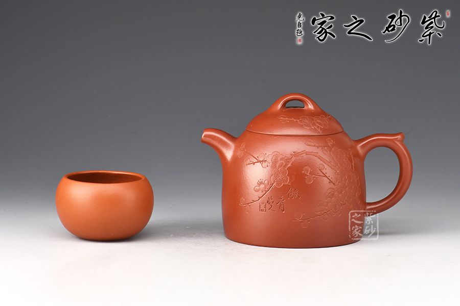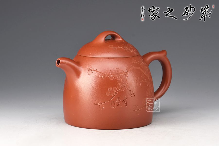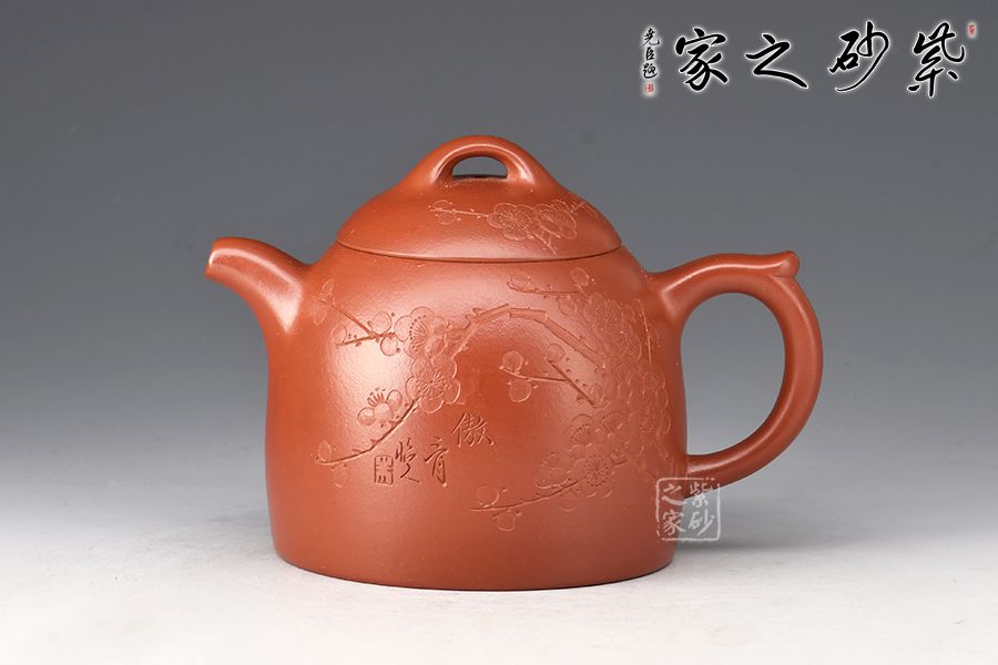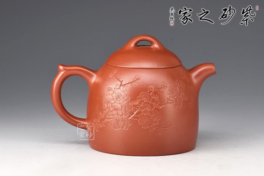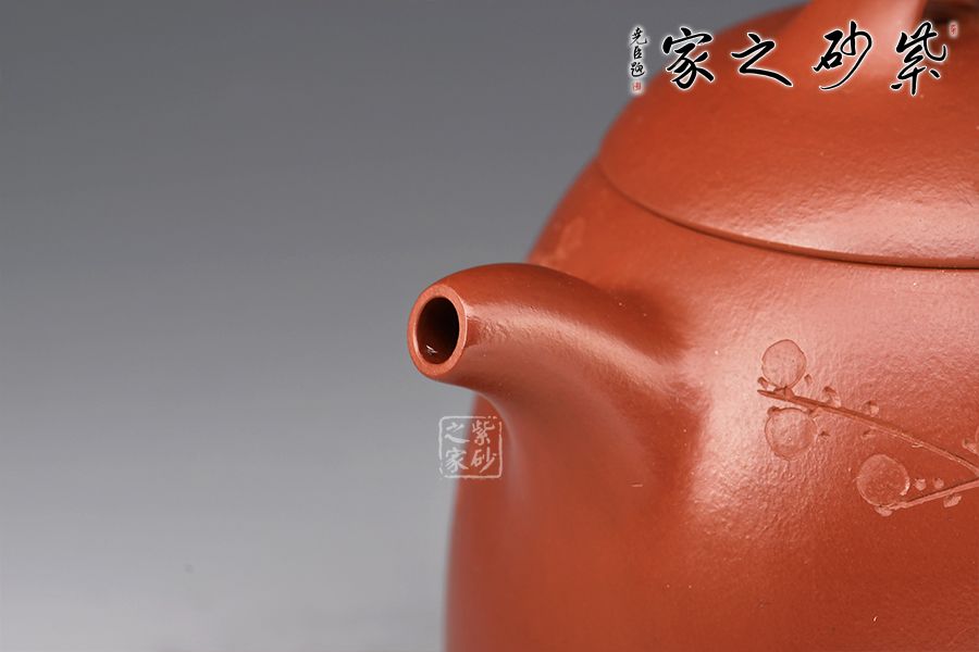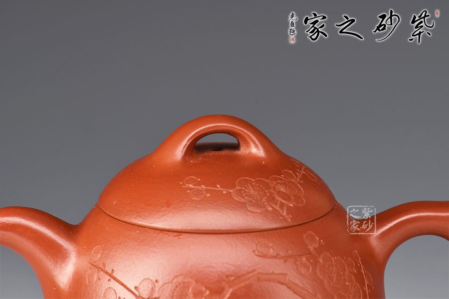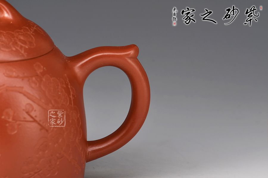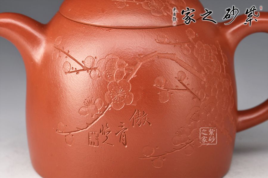 壺身若秤砣之形,高聳挺立,自下至上逐漸收斂,截蓋上下渾然一體,線條自然流暢。一彎流短而挺拔,出水爽利,環(huán)形飛把不矯不揚,儒雅端莊。器身由梅王朱炳浩愛女朱芊芊陶刻梅花,兩位名家精工臻品,值以收藏品賞。
