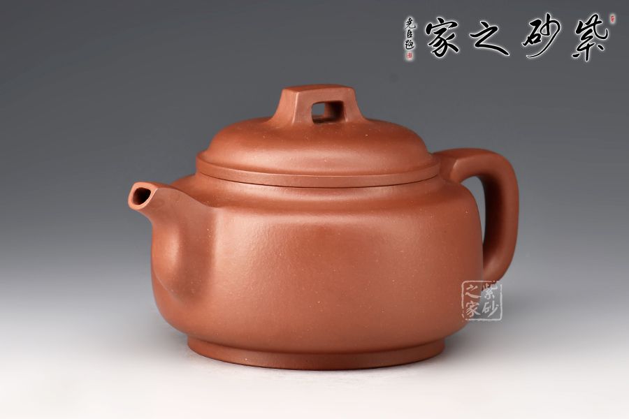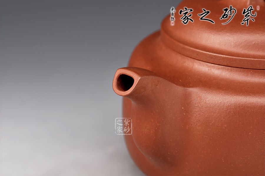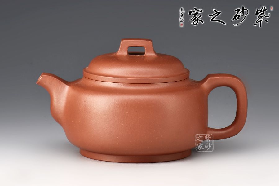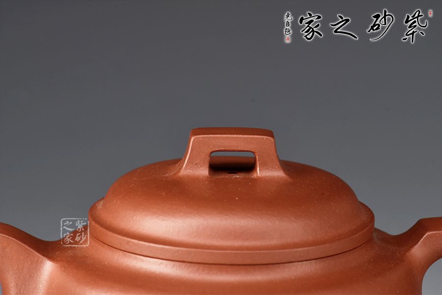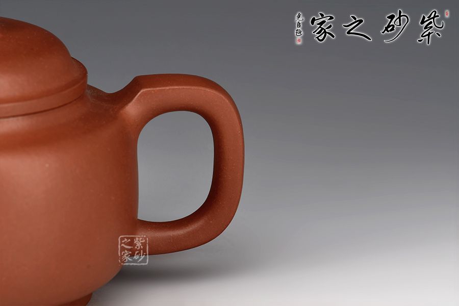 該壺端莊穩(wěn)重、比例協(xié)調(diào)、結(jié)構(gòu)嚴謹。壺身線條流暢,圓潤飽滿。壓蓋設(shè)計嚴絲合縫,拱形橋鈕挺拔壺身。方嘴,方把,和諧有力整壺線條挺括,折角交代清晰。壺底有一圓盤接底,增添了整個壺的穩(wěn)重之感。
