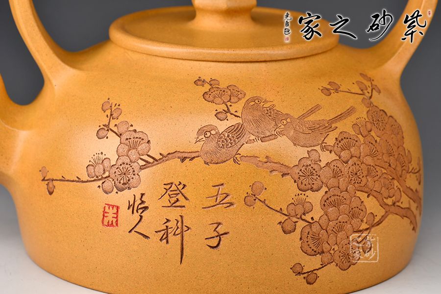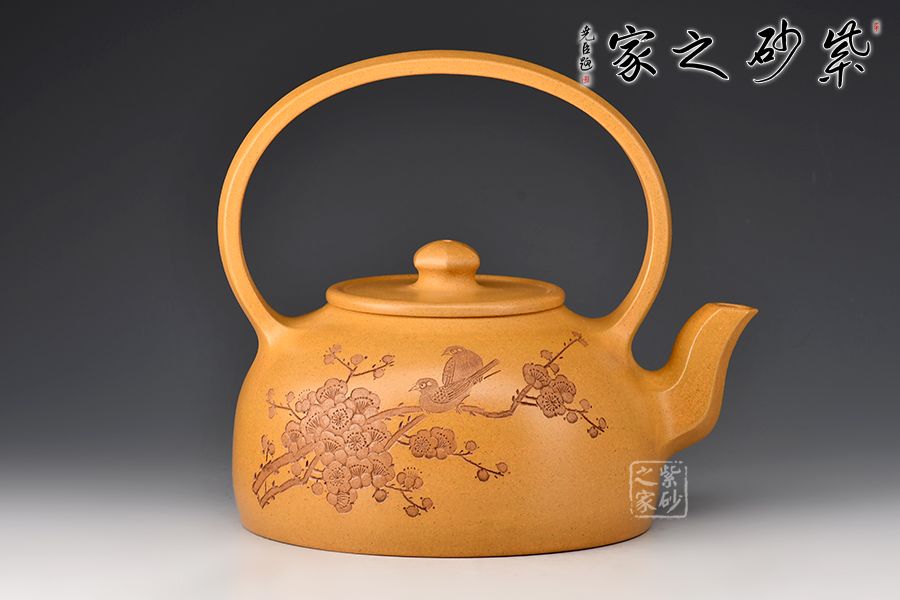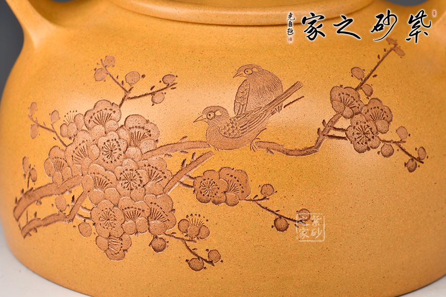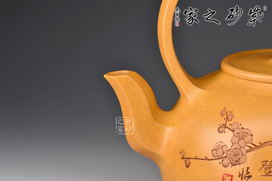 大彬提梁壺是經(jīng)典器型,流、鈕六方,流口外方內(nèi)圓,圓蓋板踏實(shí)沉穩(wěn),闊朗的寬柄提梁與飽滿(mǎn)碩大的壺身虛實(shí)結(jié)合。壺身由梅王朱炳浩愛(ài)女朱芊芊刻繪梅枝,若有若無(wú)的香氣飄然而至。整壺做工精細(xì),渾若天成,賞用皆宜,值得收藏。