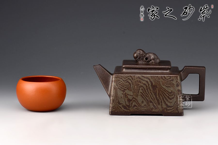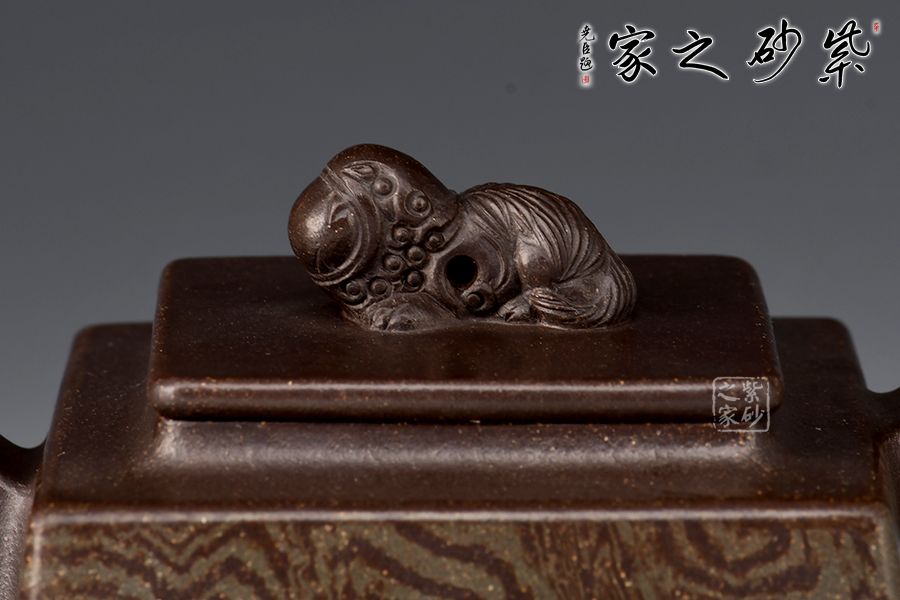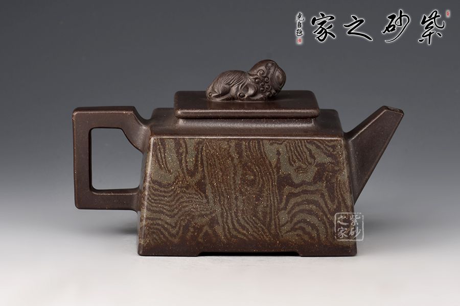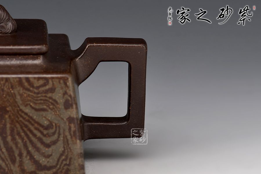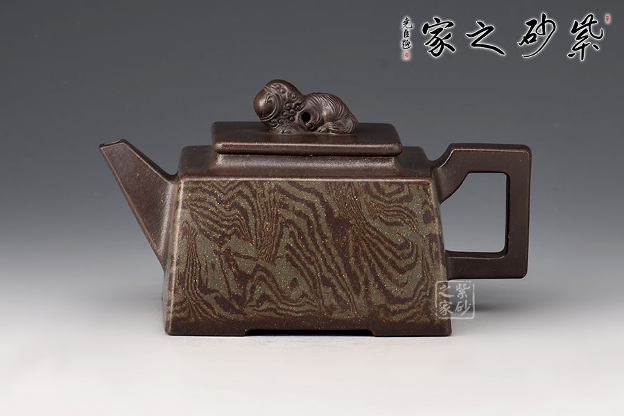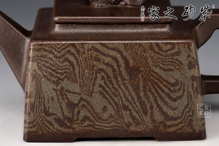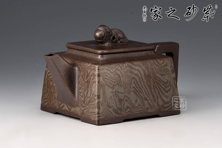 《富貴靈珠》以方斗為原型,器型簡潔明快,此壺四方基底,下寬上窄,使此壺具備方壺穩(wěn)重剛強的優(yōu)點,又不流于呆板單調;壺鈕與把更加入曲線變化與虛實空間對應,全器表現(xiàn)出剛柔并濟的美感,足見作者已掌握制壺精髓,能于不變中求變,正是對制壺者最大的考驗,作品表現(xiàn)出堅實陽剛之氣;此壺壺頸平緩流下,壺肩四面采用了絞泥的裝飾手法,紋理清晰渾厚,均勻而又發(fā)散,極有韻味;最特別的是,此壺的壺鈕是以上古瑞獸貔貅為形,貔貅有招財辟邪的功用,寓意吉祥,此貔貅口含靈珠,送財送福,故名“富貴靈珠”。