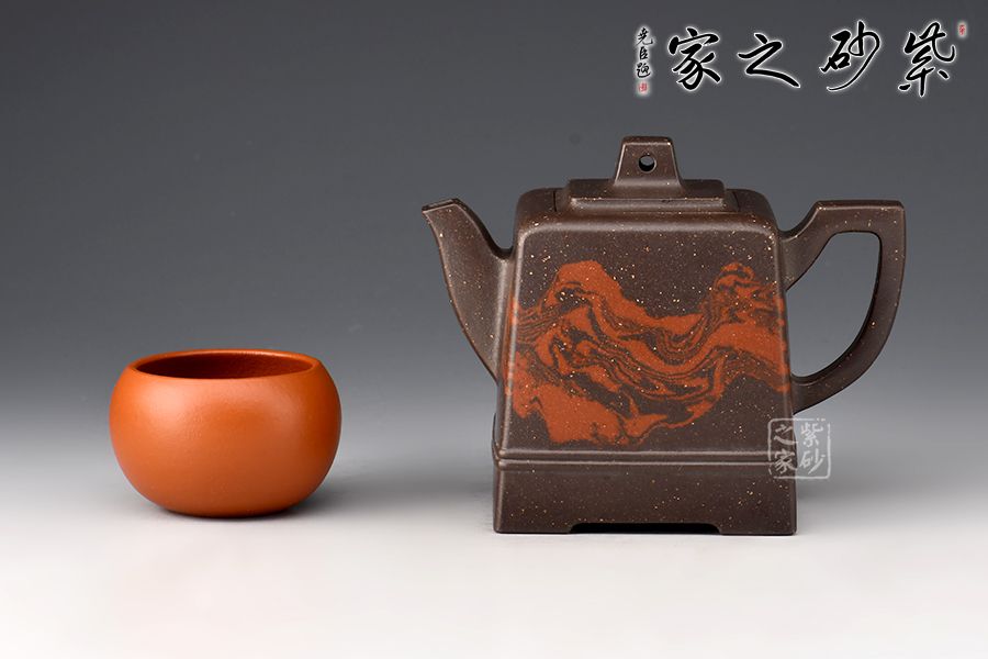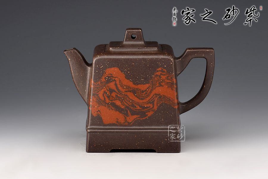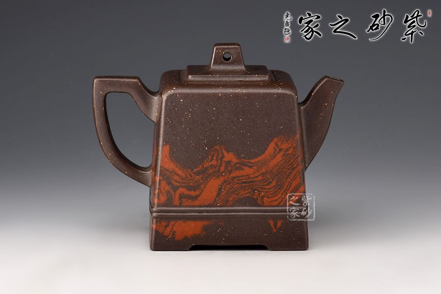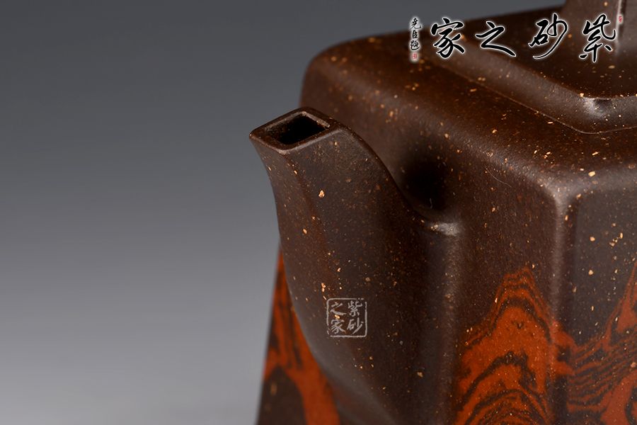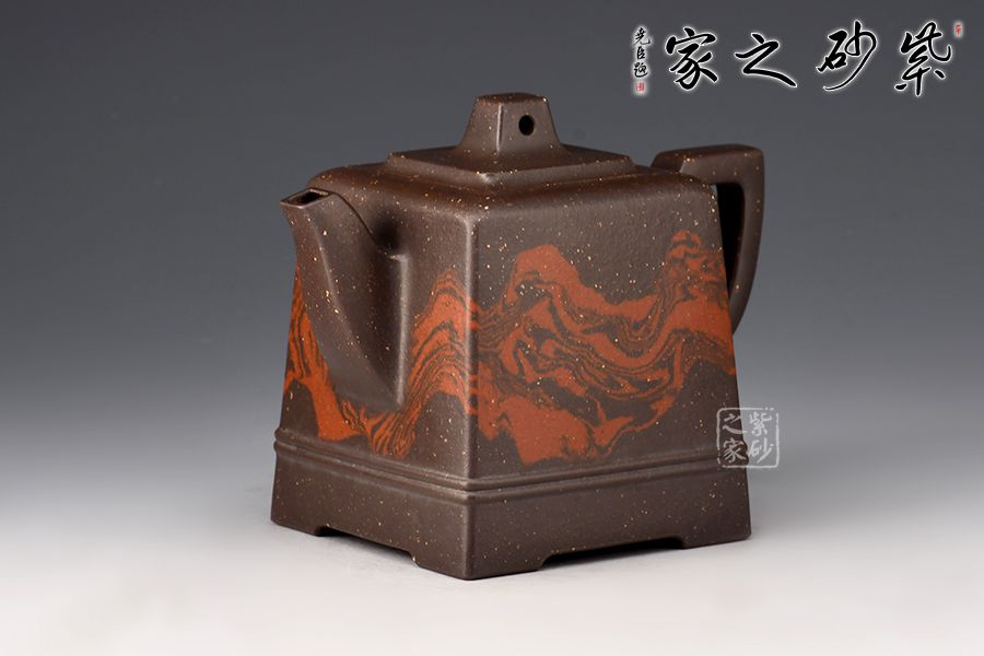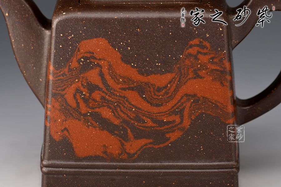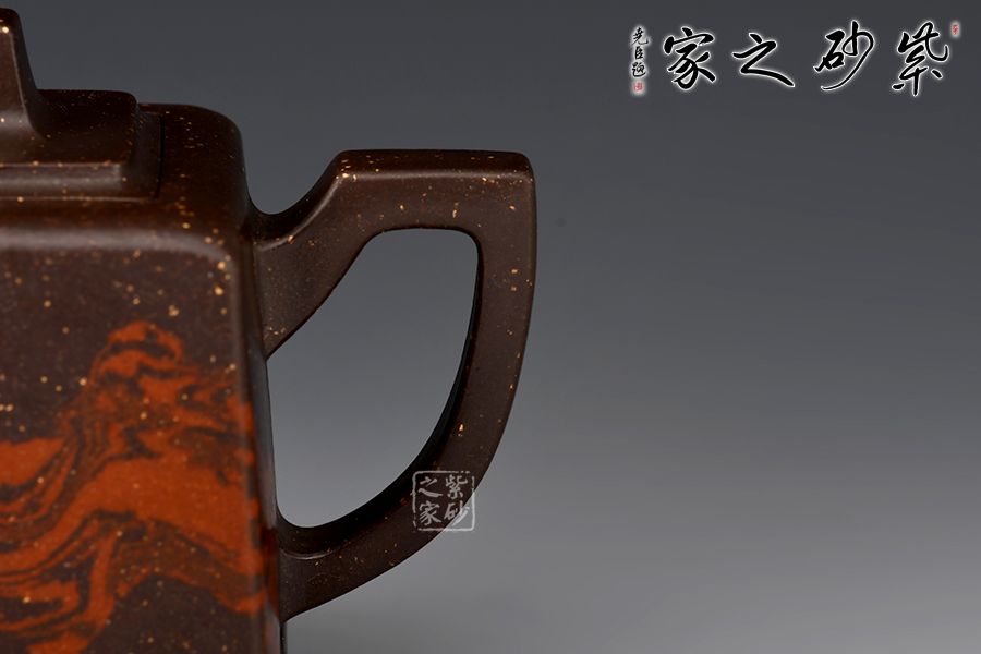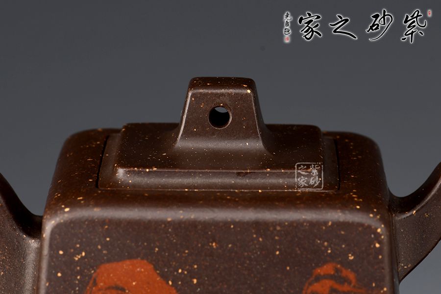此壺大氣周正,線面調(diào)和,品相端和,工藝精巧;這款作品線面挺括平正,輪廓線條分明,平穩(wěn)莊重,達(dá)到了方器方中求變,口蓋劃一,壺蓋內(nèi)嵌,剛?cè)嵯喾Q的最高境界, 以明朗有力的線條帶給人干凈利落的快感,梯形方鈕,鈕孔圓潤,造型精致;壺身高聳直挺,壺把跨度極大,壺嘴蜿蜒上翹,出水有勁;絞泥裝飾逼真美觀,如流光溢彩,美不勝收,極有韻味。