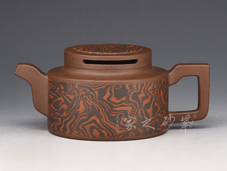 紫砂絞泥是采用兩種或兩種以上不同顏色的紫砂泥,經(jīng)人工揉合、按壓、層疊、鑲嵌等多種手法絞和而成,再通過拍打泥片,并按要求切割泥片、鑲接泥片, 直至打 好身筒,這樣便在壺身上形成不規(guī)則卻十分自然和諧的紋飾圖案,如天際流云、似雨后彩虹;如湖光山色、似大漠原野等等,這些雖在小小的壺面上呈現(xiàn)出虛虛實實的圖象,卻能以小見大地營造出亦真亦幻、自然天成的意境,這正是紫砂絞泥具有的裝飾性。