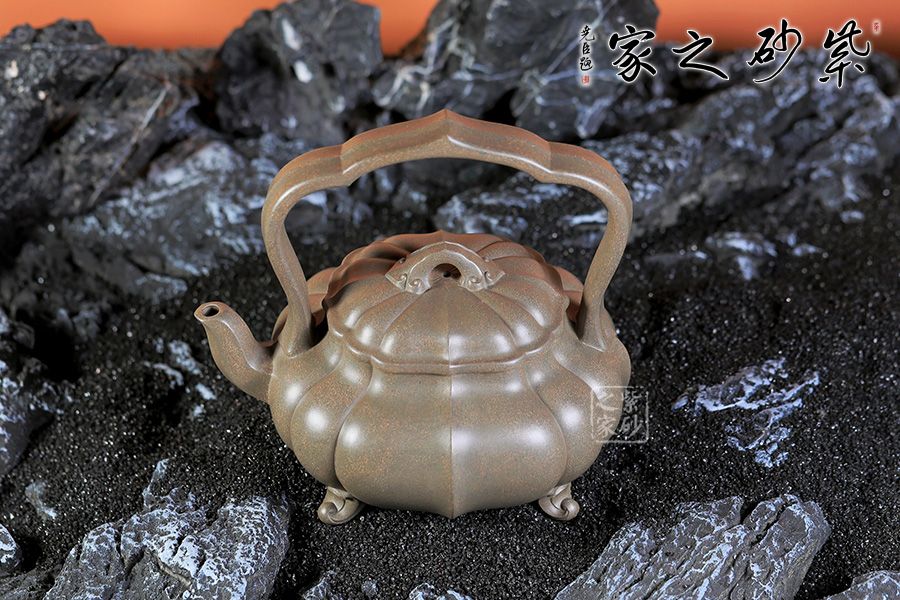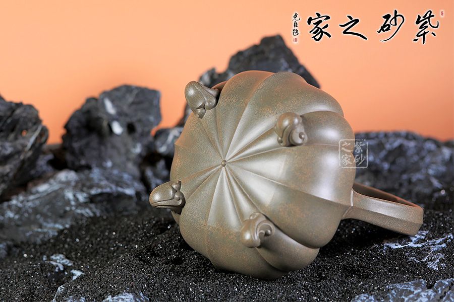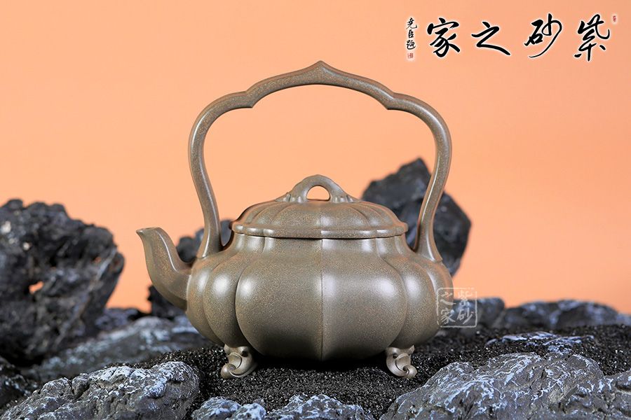 此壺是筋紋提梁壺式,對稱的提梁似僧人合掌,三彎流上有多條棱線凸起,卷花式三足托起扁圓壺體。壺體上陰陽紋路間隔,凹凸有致,極具張力。壺蓋凸起上有棱線與壺體線條相互銜接,貫通一氣。橋形鈕與壺面連接處有卷花紋理裝飾,與三足相似,上下呼應(yīng)。