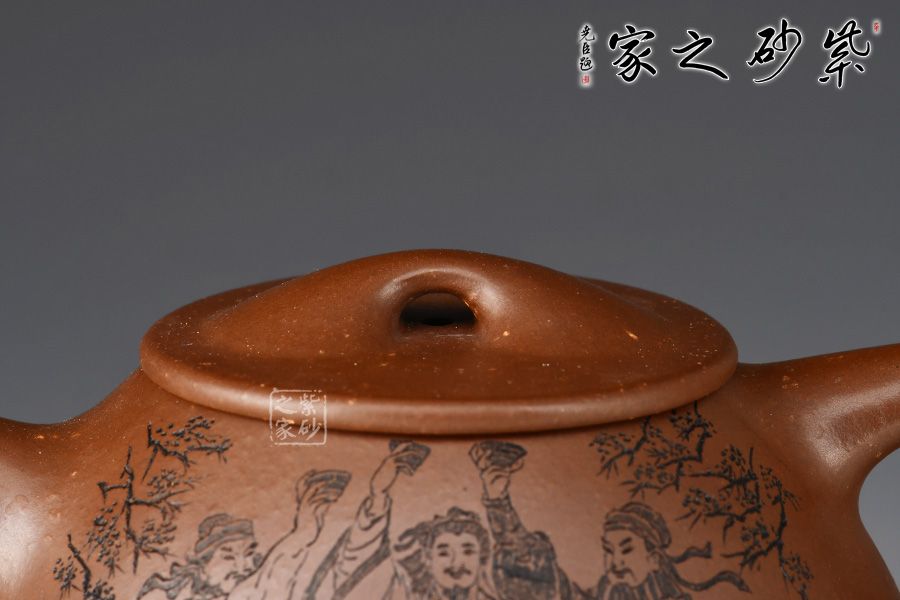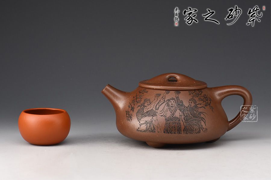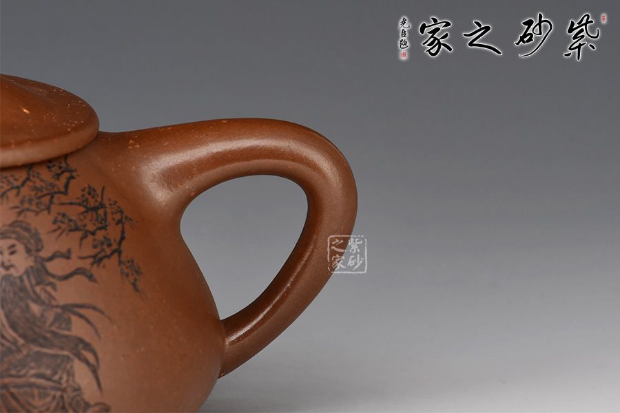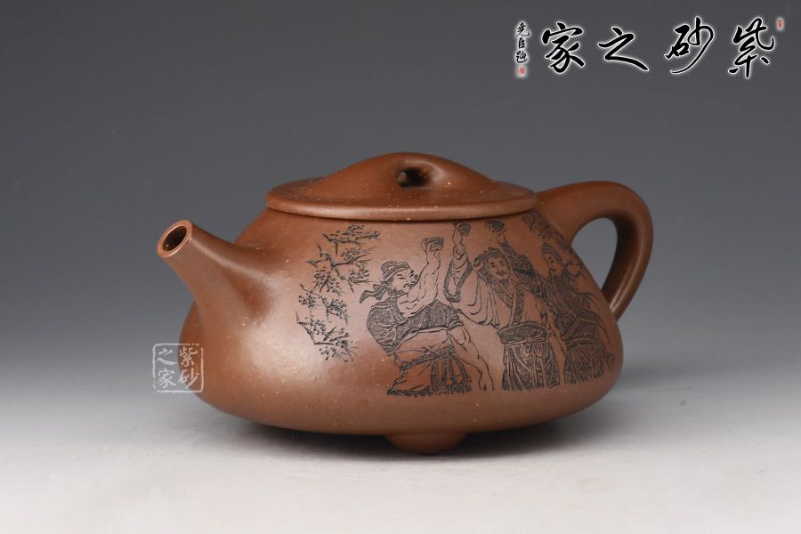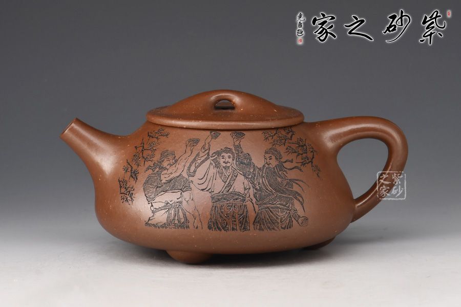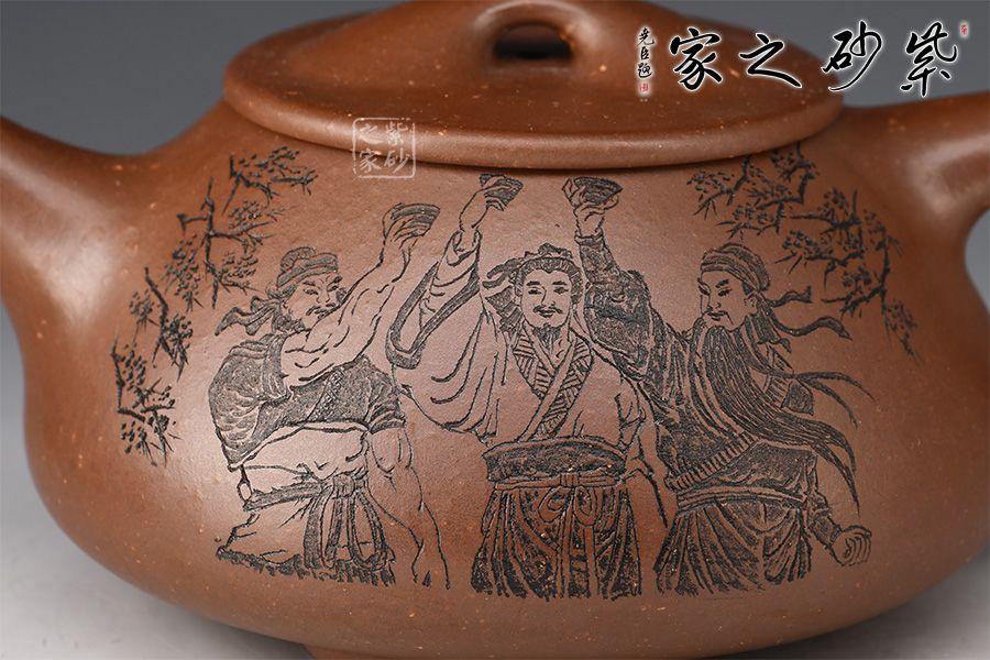 此壺以原礦紫泥作胎,泥色溫潤古樸,上手舒適。整體形體端秀,骨力勁挺,直流、倒三角把胥出有力,出水爽利。壺身刻《桃園三結(jié)義》之圖景,三人舉酒結(jié)義,對天盟誓的場景栩栩如生,把志同道合、拯救蒼生的萬丈豪情刻畫得淋漓盡致。