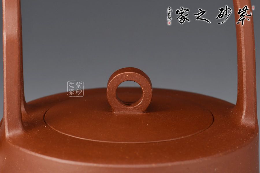 此壺不拘于傳統(tǒng),但又不脫離傳統(tǒng),壺身短矮,嵌蓋設(shè)計,子母線絲嚴(yán)合縫,壺鈕特別,為一個飽滿的圓圈形,與提梁形成虛實空間相呼應(yīng),立體效果豐富。