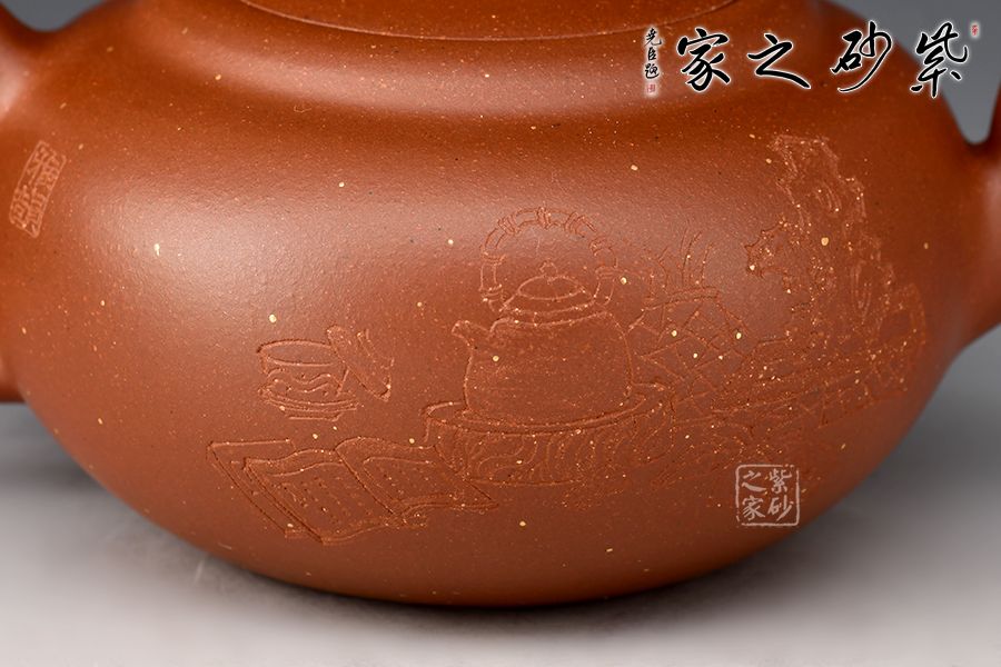 這把壺就顯得更加匠心獨(dú)運(yùn)。壺身撒金裝飾,如雪花飄落,別有一番清趣。