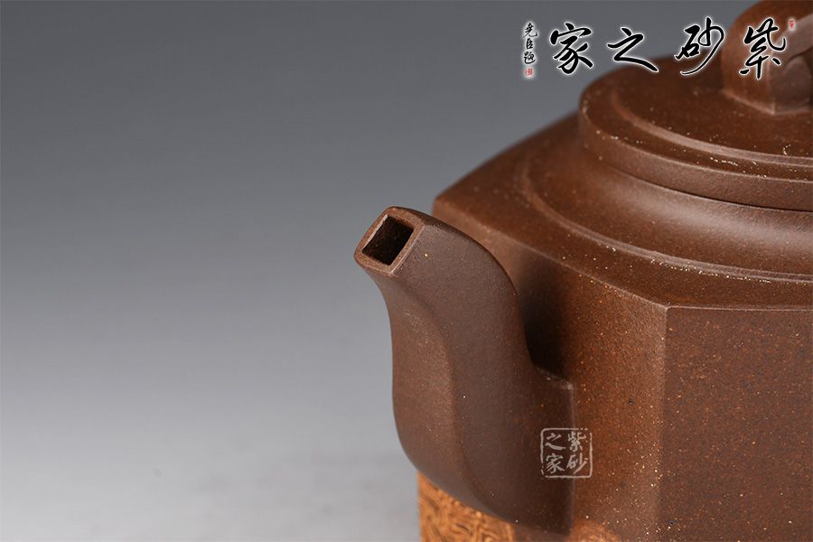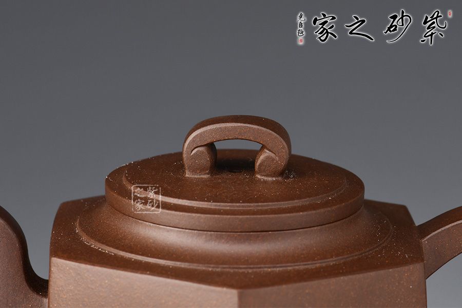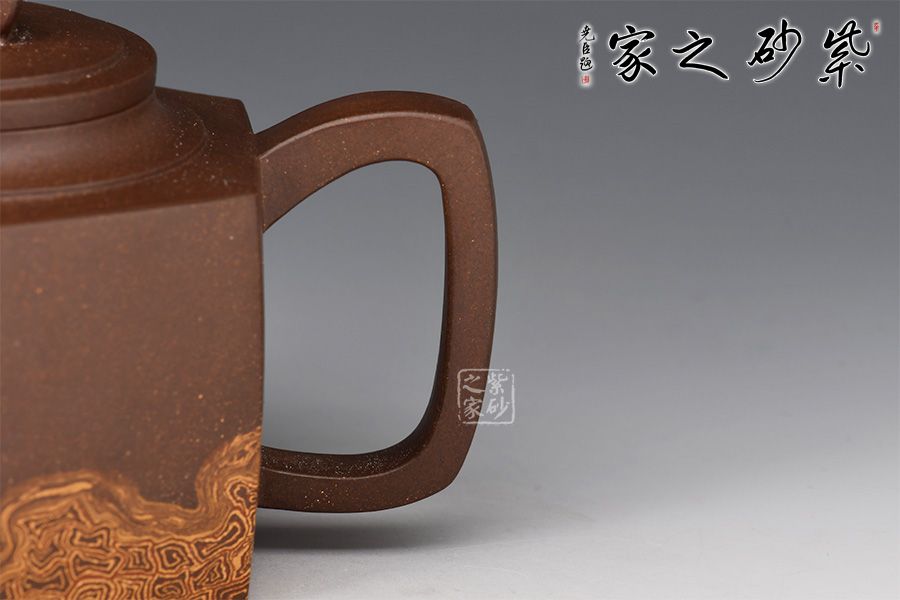 壺身以六面幾何圖形組合而成,線條挺恬有力,過渡銜接流暢自然,增添了紫砂壺的動態(tài)美,是一款經(jīng)典的紫砂方器造型。