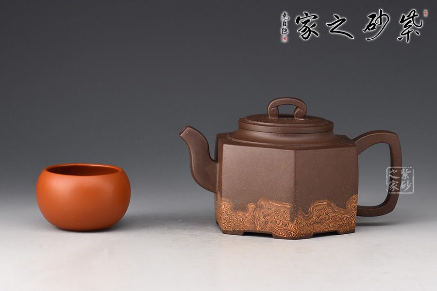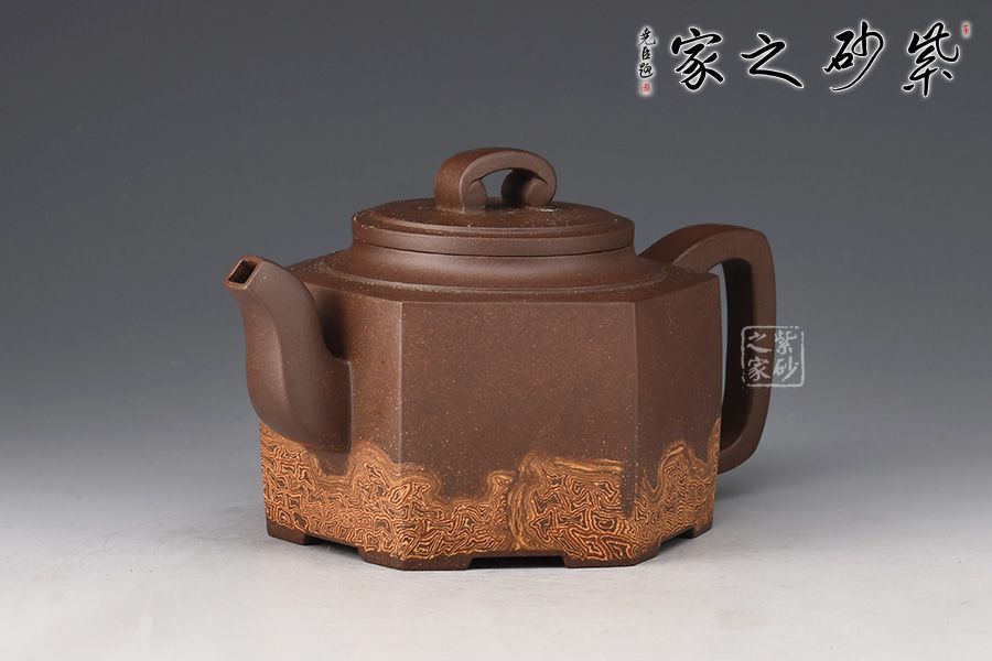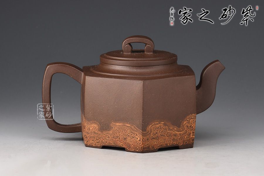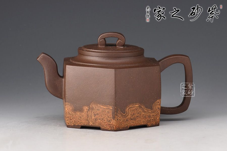 觀此壺,可見其壺身、蓋、流、把皆以六方取形,形成和諧統(tǒng)一之勢,整體猶如一氣呵成,工藝嚴謹規(guī)整。其中,如意為鈕,寓意吉祥。壺底絞泥裝飾,神秘夢幻,非常有收藏價值...