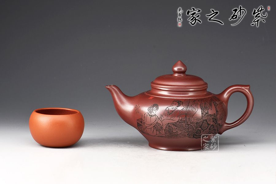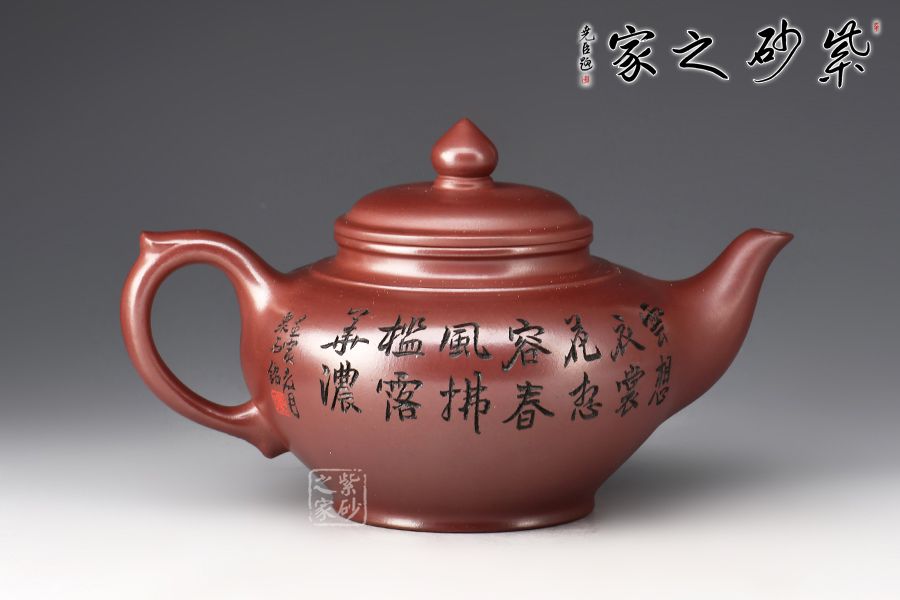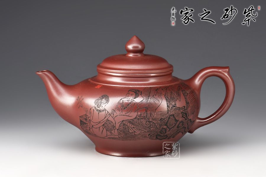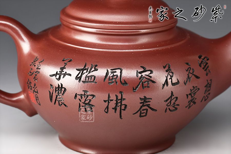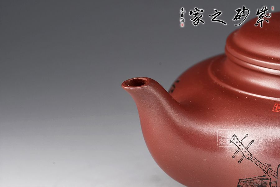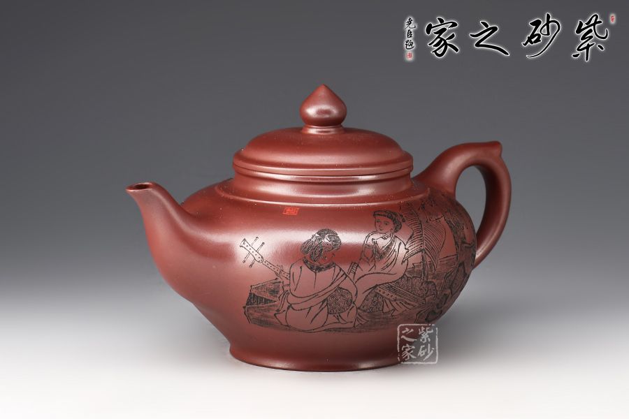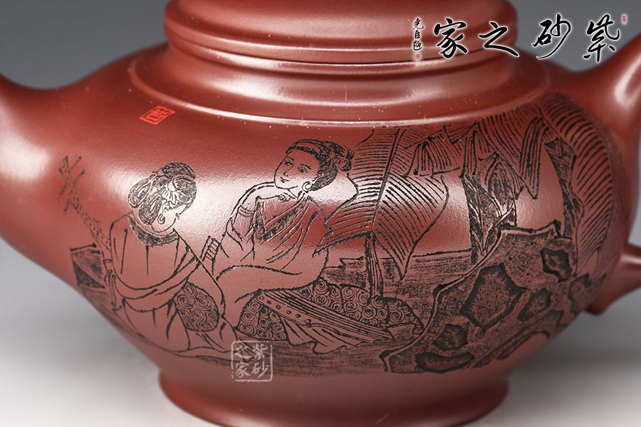 笑櫻作為傳統(tǒng)壺型之一,流傳甚廣,深受壺友所喜愛;夏瑞娟老師的這款笑櫻壺,線條比例恰到好處,將笑櫻壺的魅力展現(xiàn)無遺; 壺身飽滿,從中間向上下兩邊收斂,壺蓋微微隆起,口與蓋咬合甚是緊密,云肩線清晰爽利,大氣,流與把張力十足;壺身由泉石刻繪美女撫琴圖,反面配以詩句:云想衣裳花想容,春風(fēng)拂檻露華濃。好詩好畫好壺,您值得擁有!