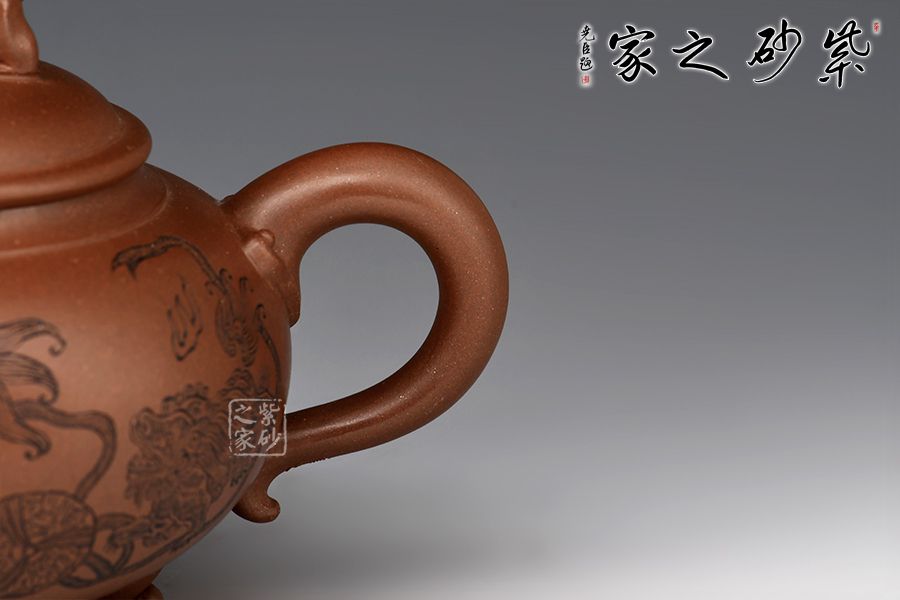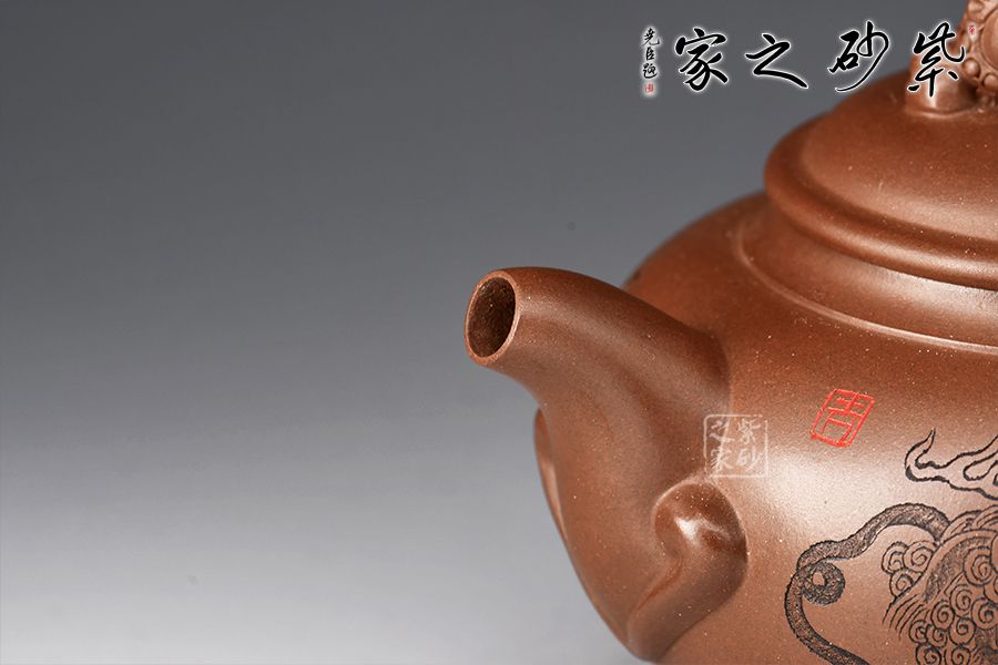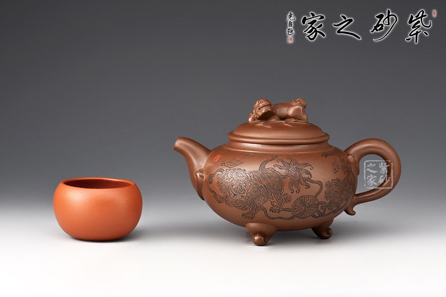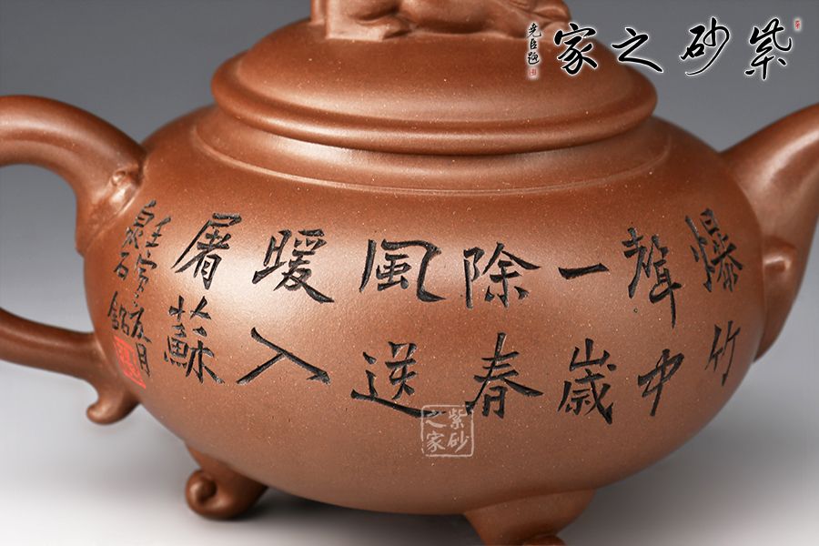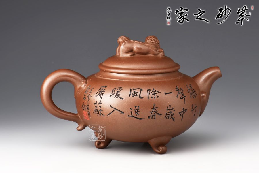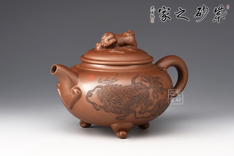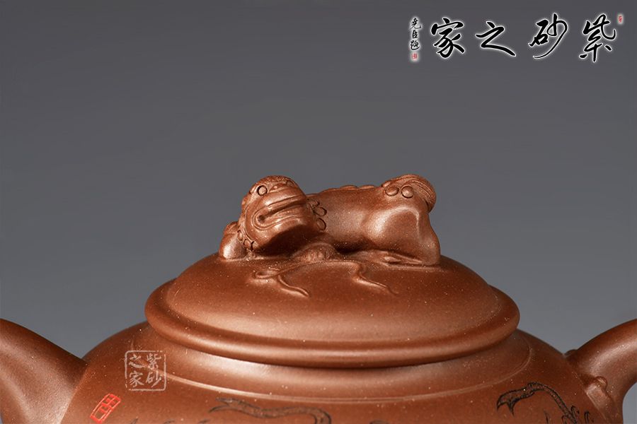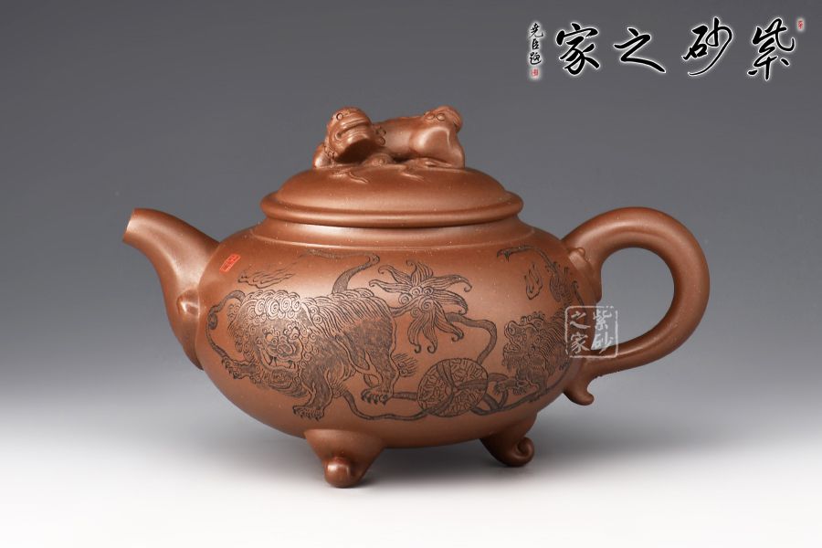 此壺是一款經(jīng)典老壺型,曾被不同的老師所演繹,造型沉穩(wěn)大方,工藝精湛,壺身飽滿猶如一個(gè)聚寶盆,將財(cái)富好運(yùn)盡收里面!壺鈕為獅子雕塑,眼神可愛(ài)調(diào)皮,壺身裝飾為獅子滾繡球,寓意好運(yùn)連連,反面刻繪:爆竹聲中一歲除,春風(fēng)送暖入屠蘇,將春節(jié)的喜氣洋洋刻畫(huà)在此壺上,底部三足使整壺氣韻飽滿,上下貫通!好壺好寓意,值得入手!