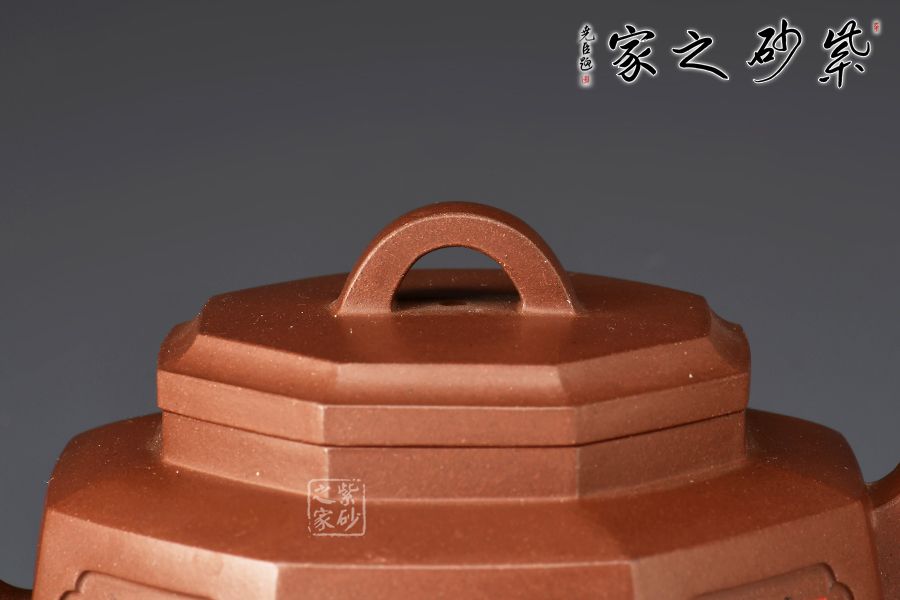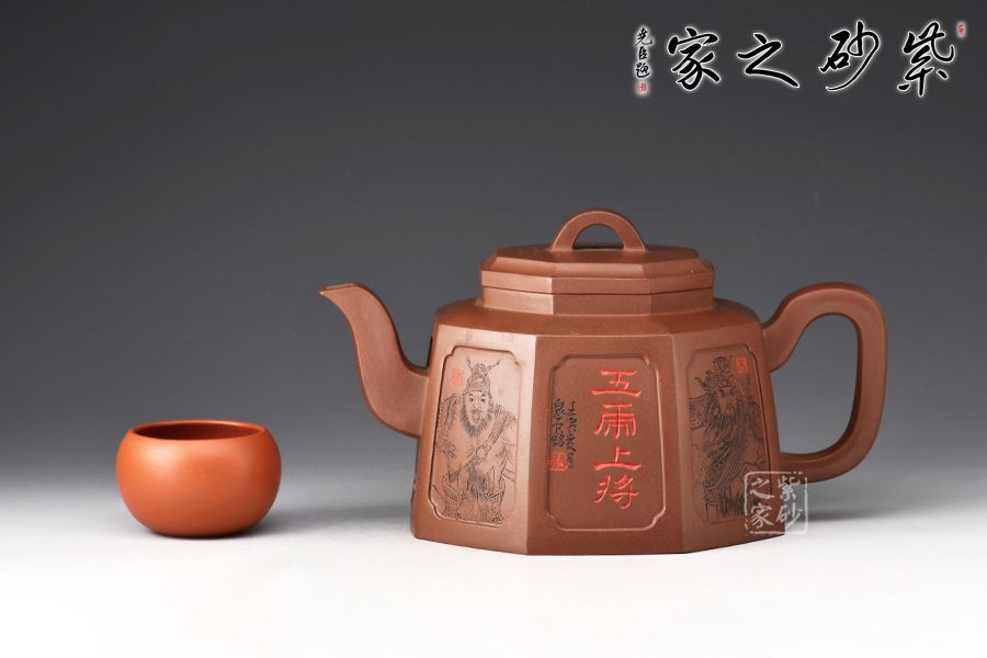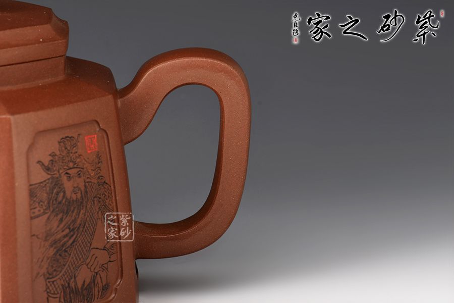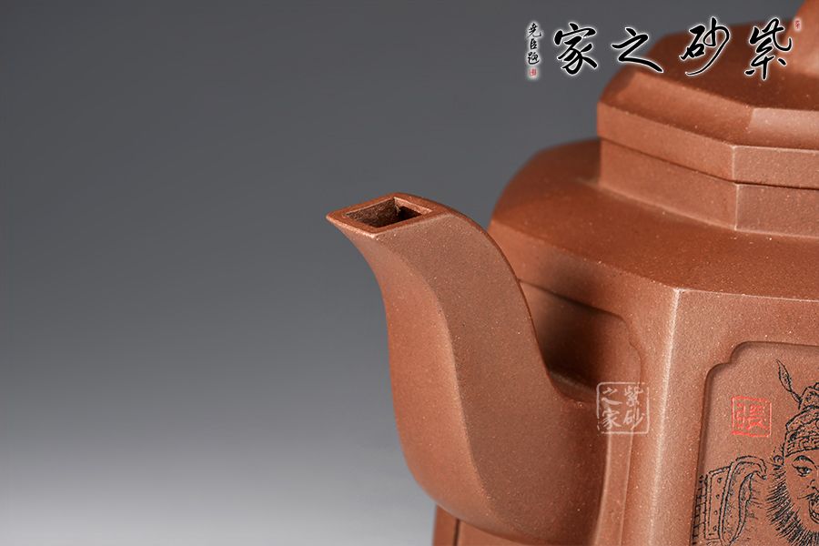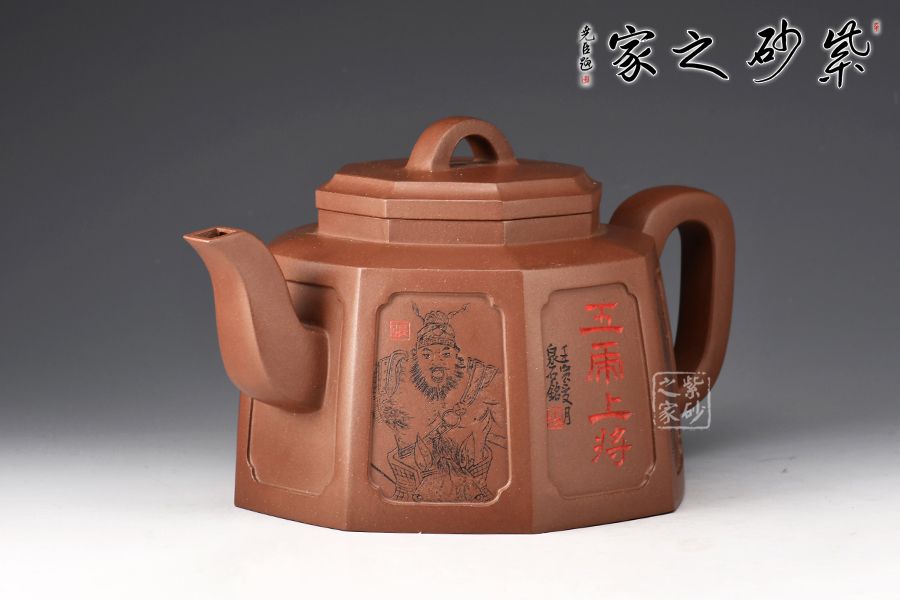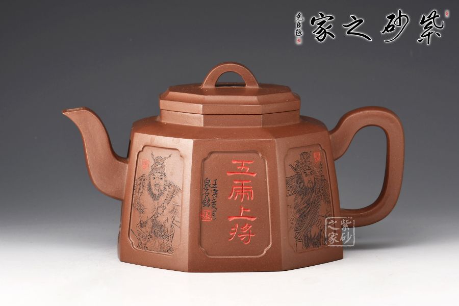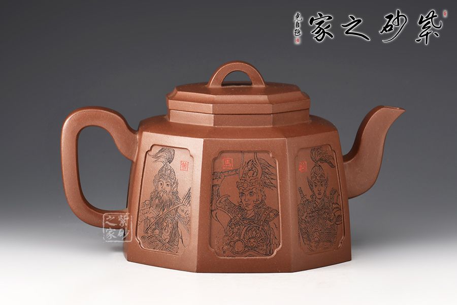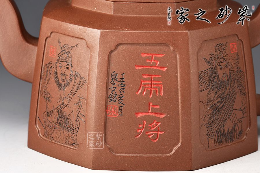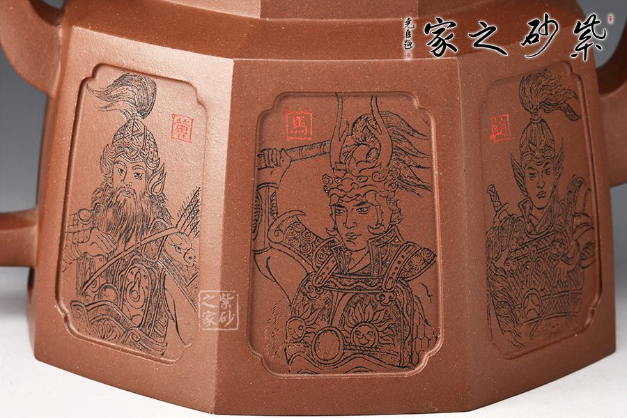 此壺為八方器型,線面挺括平整,輪廓線條分明,給人干凈利落、明快挺秀之感。壺肩口蓋配結(jié)合緊密,又能任意轉(zhuǎn)換,彎流、方把鑲在壺的兩側(cè),與八方體的壺身交相輝映,一種磅礴的氣勢就隱隱從中散發(fā)出來,壺身刻繪蜀漢五位名將:關(guān)羽、張飛、趙云、馬超、黃忠。歷史文化內(nèi)涵濃厚!