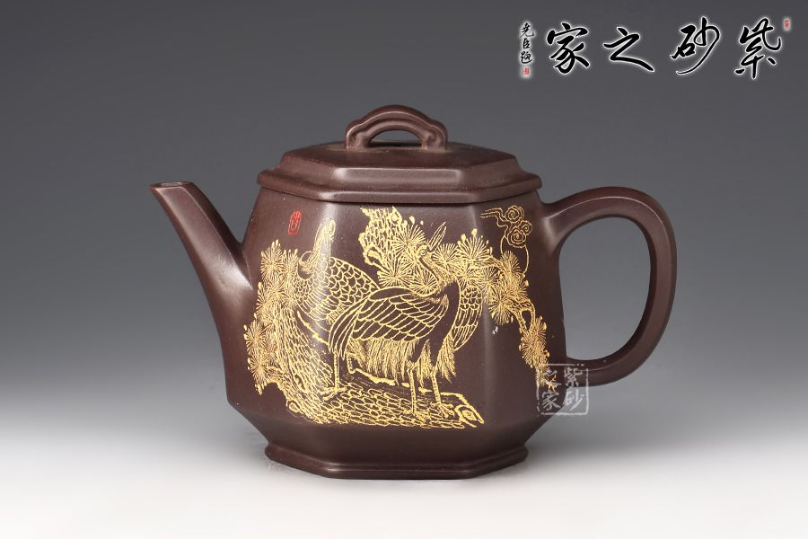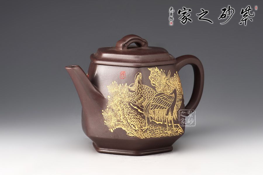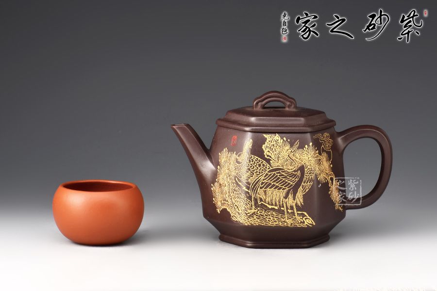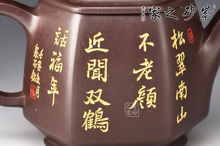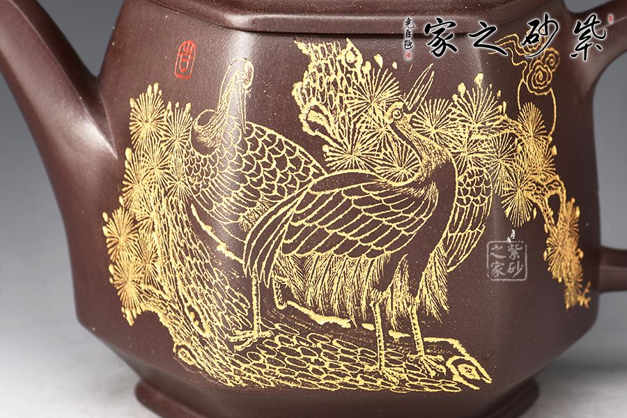 整壺內(nèi)斂低調(diào)的色澤、方正的壺型,造型謙和有感,極適春日品茗。正面刻繪松鶴圖,反面刻繪“松翠南山不老顏,近聞雙鶴話福年”,兩兩相結(jié)合,更添韻味。