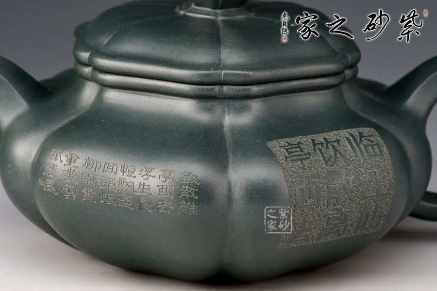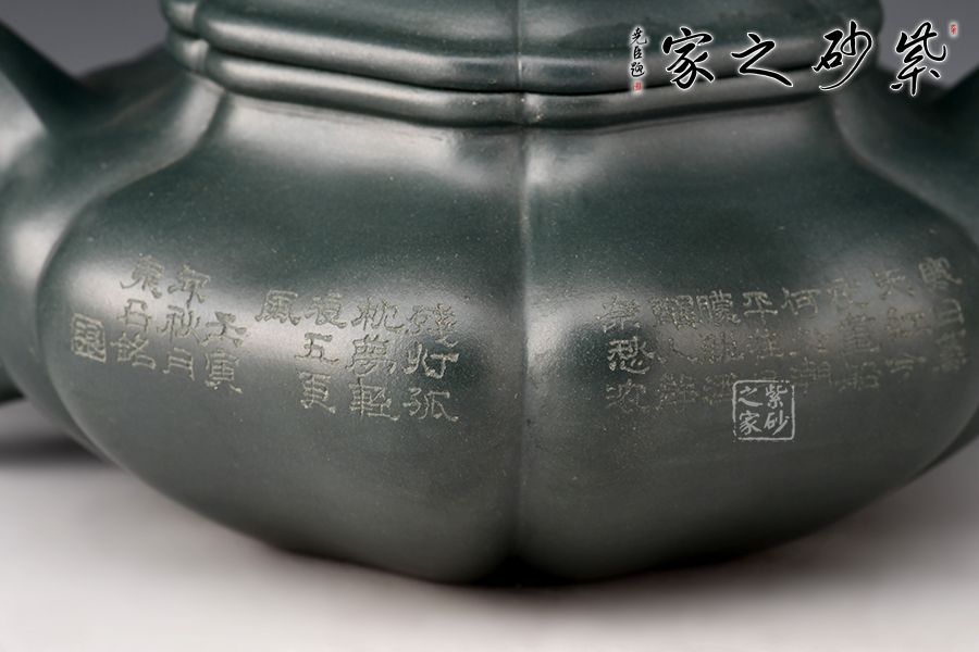 葵仿古壺是紫砂筋囊器的傳統(tǒng)作品。這款壺型,將光素的仿古壺升華成了葵花式箸紋壺。在圓仿古壺的基礎(chǔ)上,加了筋囊、塊面轉(zhuǎn)折的手法??鹿乓粤饪隇閳D案,嘴、把、蓋也都用筋紋起線,整個(gè)壺的造型協(xié)調(diào)統(tǒng)一。壺身刻繪《臨江仙 飲散離亭西去》,富有文化底蘊(yùn)。