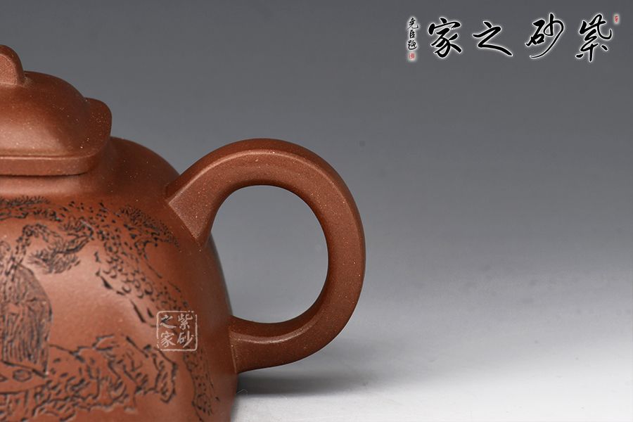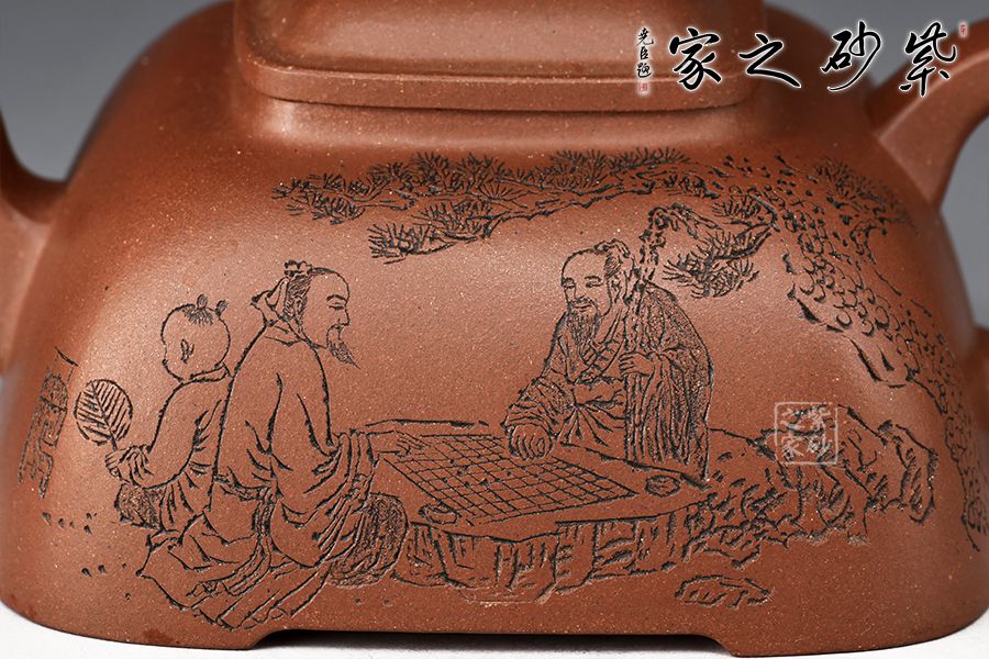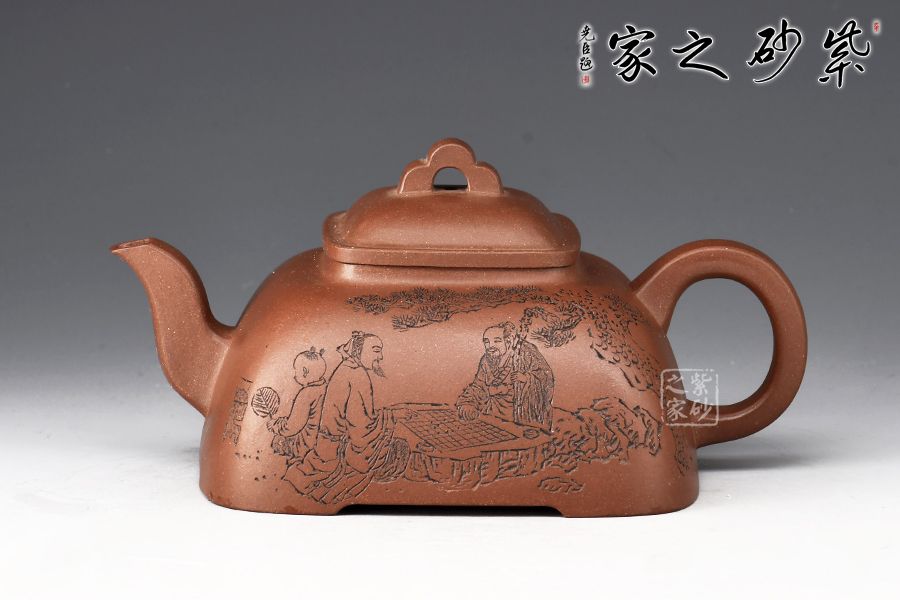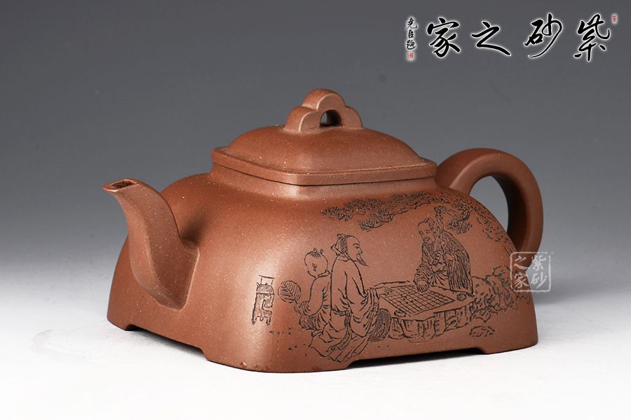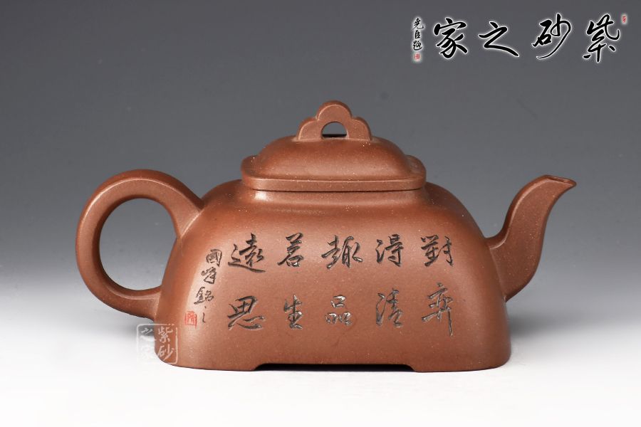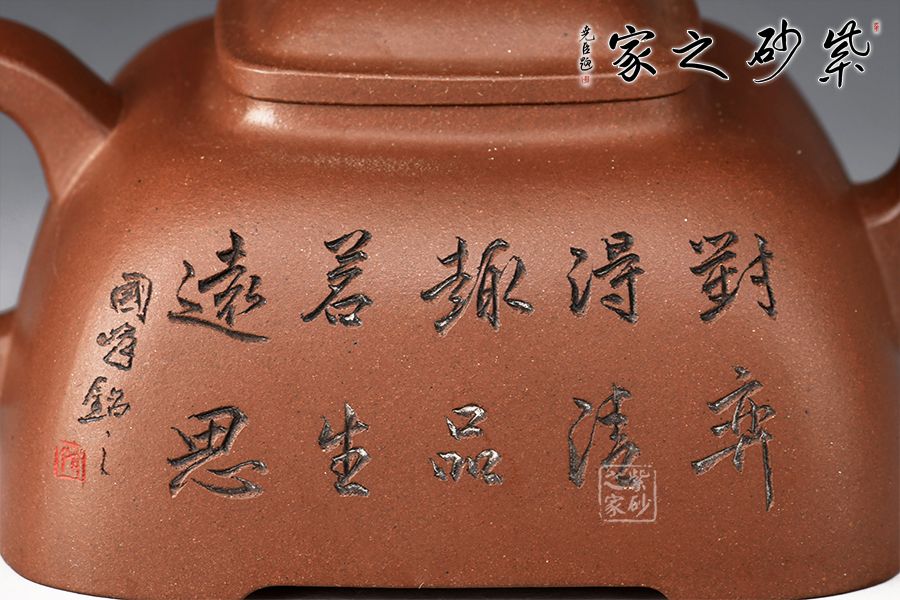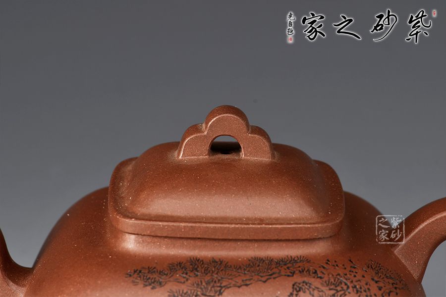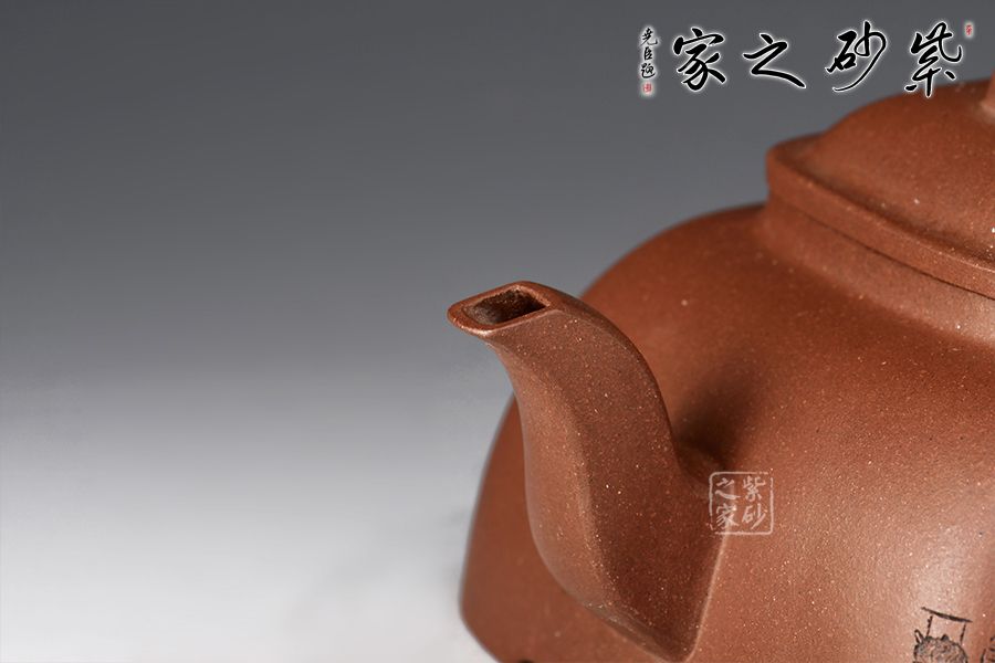 此壺壺型古拙典雅,壺把拿捏舒適。壺形底方肩渾,下寬上收,穩(wěn)重而雅致。至頸項與口沿交接處再度渾方,壓蓋嚴絲合縫,祥云壺鈕,寓意吉祥。四方足托空壺體,呈虛空感,流二彎順胥,圈把與壺身協(xié)調(diào)一致。線面流暢,菱角清晰而圓渾,適宜把玩。線條處理干凈利索,精工細作,嚴謹而不失古韻,值得擁有。