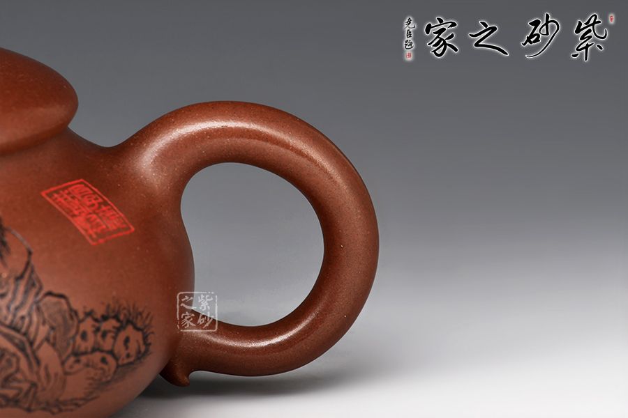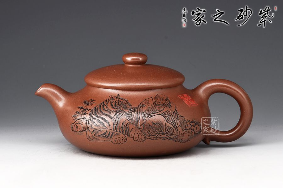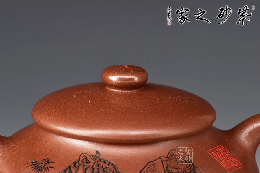 泉石刻繪“清凈修身終果位,隨緣渡眾洗凡心?!闭媾湟粤_漢圖,整壺集實用與藝術(shù)于一體,不可多得!