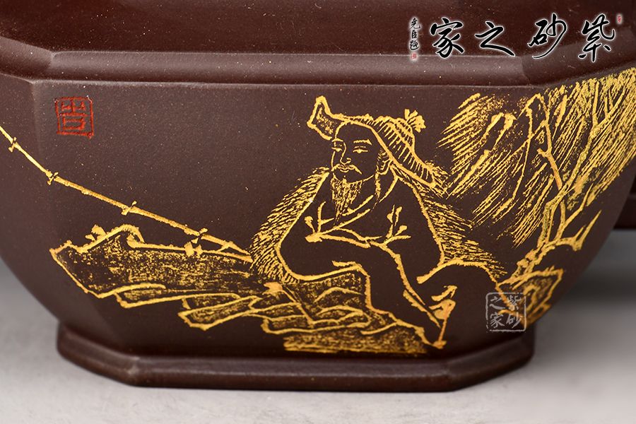 壓蓋與口唇合體,微細(xì)中見(jiàn)神韻,壺身雙面刻繪裝飾,老者垂釣,意蘊(yùn)悠遠(yuǎn),值得賞藏。
