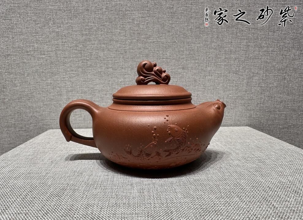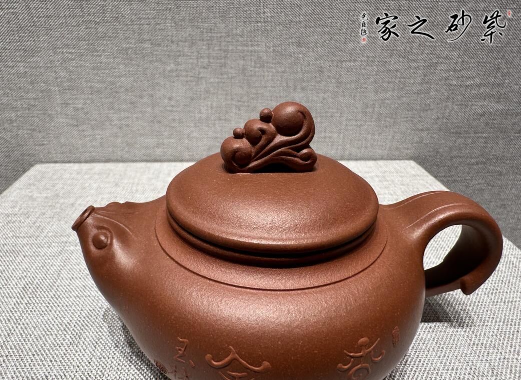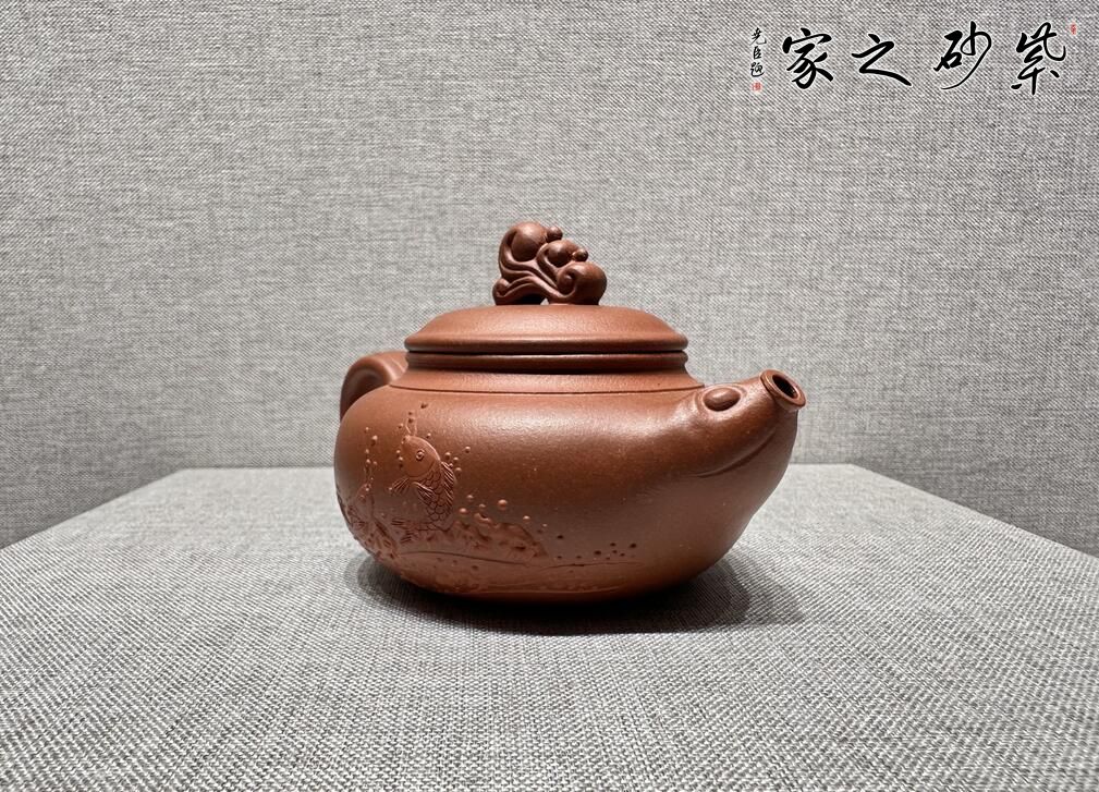 該壺造型主體以傳統(tǒng)<扁仿鼓壺>為基礎(chǔ),用魚水情理念將魚的臆象形態(tài)與壺藝結(jié)合,壺嘴用抽象魚頭,壺把也用抽象的扁尾構(gòu)成,壺鈕為水波浪,壺體用坭繪魚水圖案裝飾,整體自然協(xié)調(diào),情投意合,乖巧有趣,穩(wěn)重潤和。