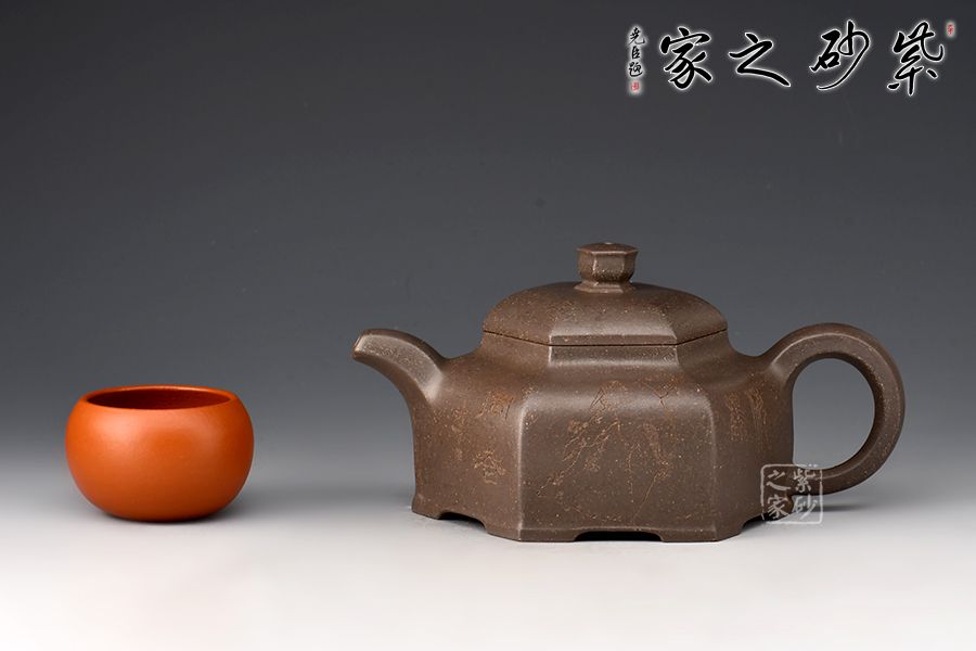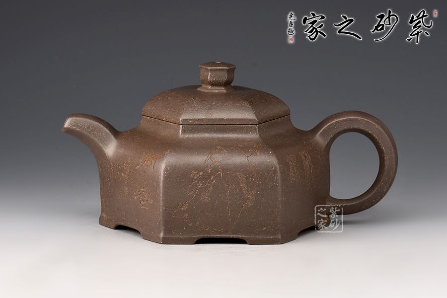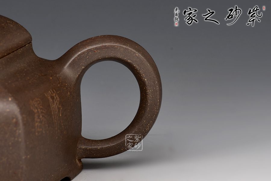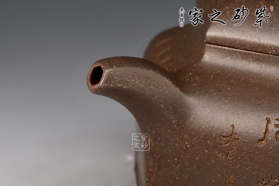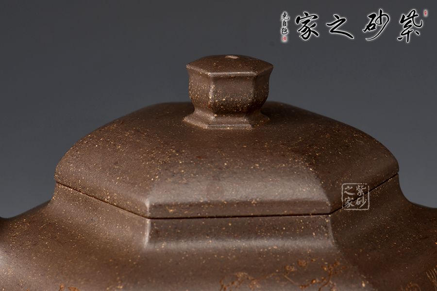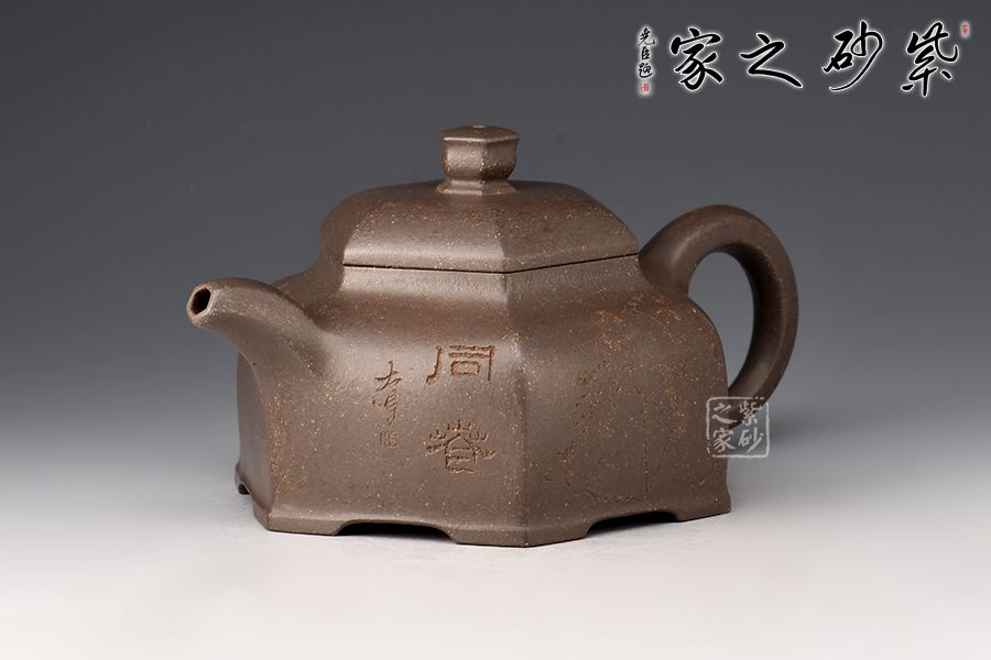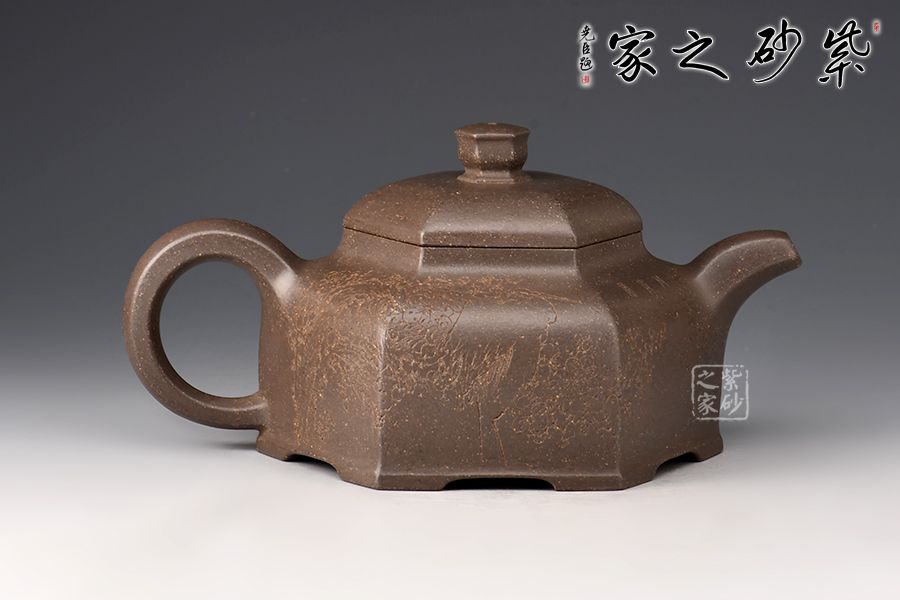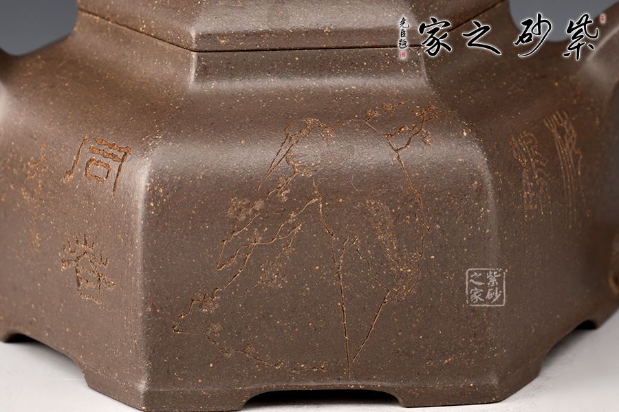 器型簡(jiǎn)潔明了,形制方正,渾樸厚實(shí),是為一款不可多得的六方造型壺,壺身均等分為六等分,