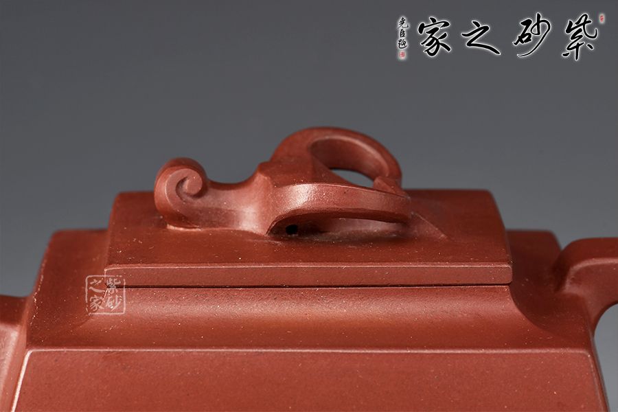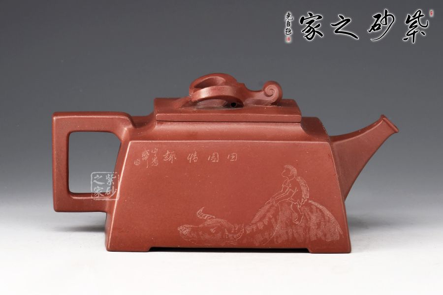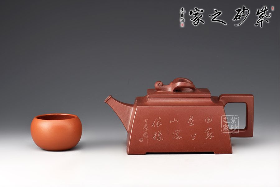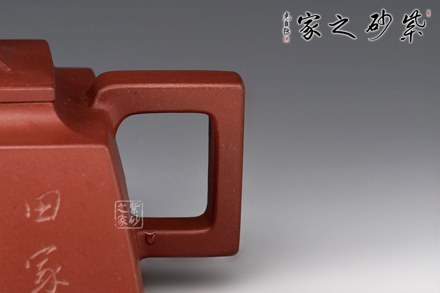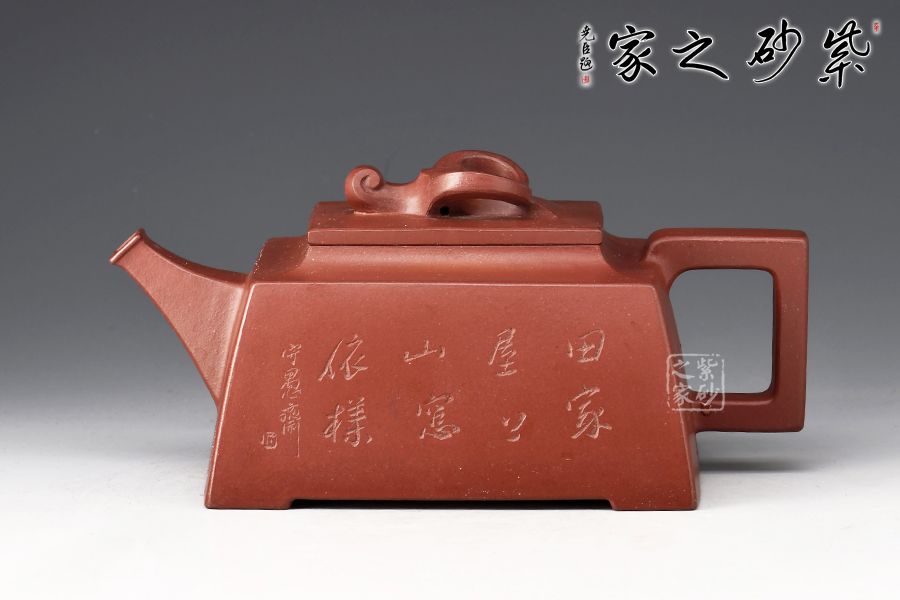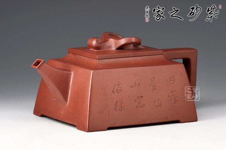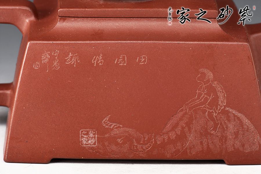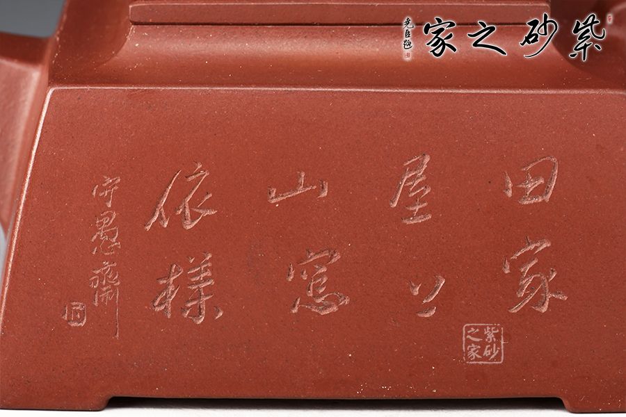 壺身四方,近似梯形,線面挺括,面與面交界處棱線完美,直流嘴出水暴爽,方形把抓握舒適,壺鈕為牛形雕塑,別具匠心,壺身刻繪:田家屋上,山窗依樣。再現(xiàn)曼生壺銘,筆力蒼勁,個(gè)性躍然壺上!