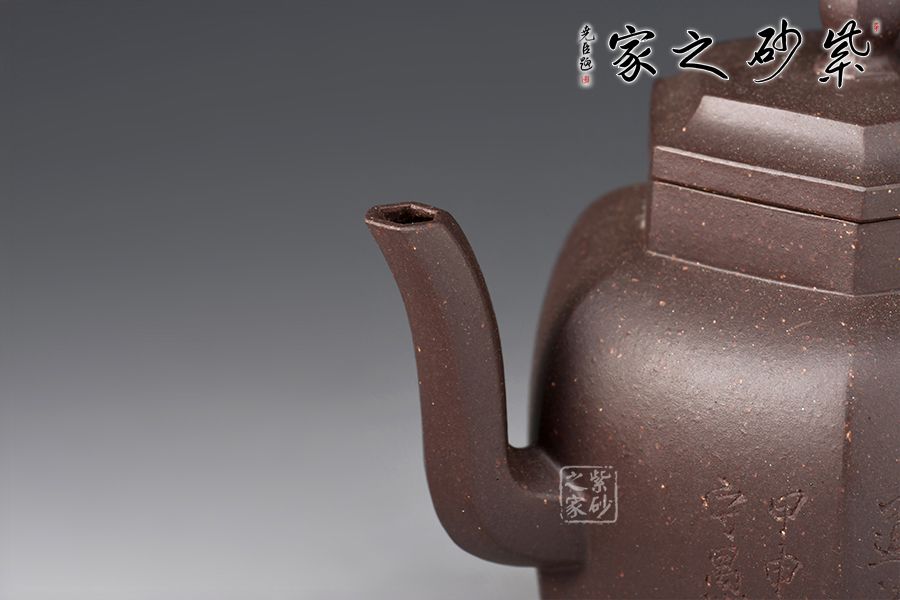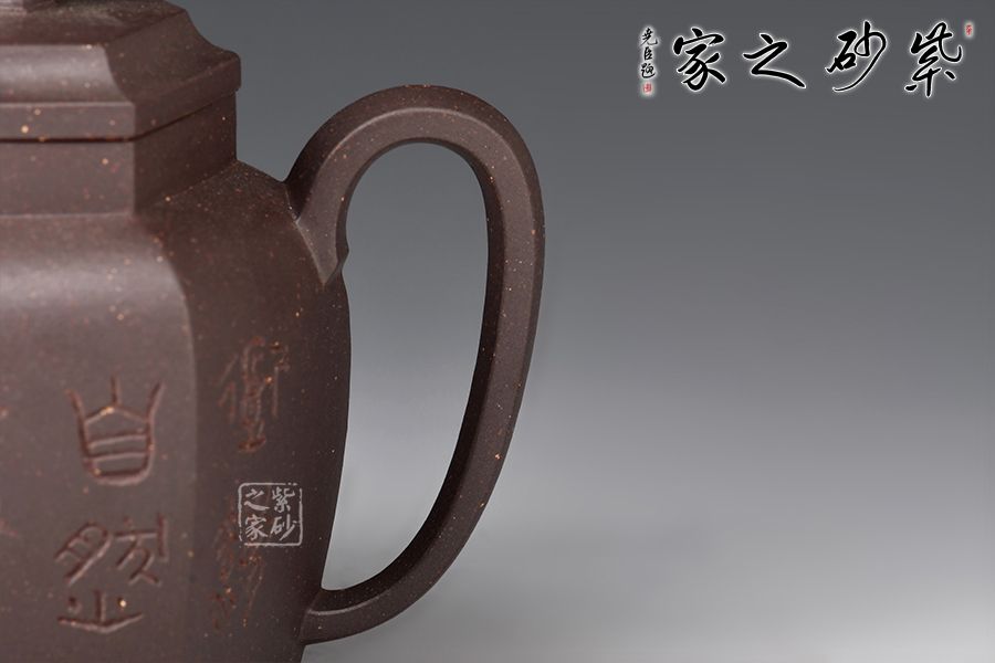 此高燈壺方圓結(jié)合,壺形略似宮燈,身筒較高,壺鈕亭亭玉立,彎流與耳把兩相呼應(yīng),秀氣精巧,壓蓋與壺口嚴(yán)絲合縫,其工藝制作嚴(yán)謹(jǐn),以徒手拍身筒成型,內(nèi)外修飾處理精到,氣度不凡,頗具功力。