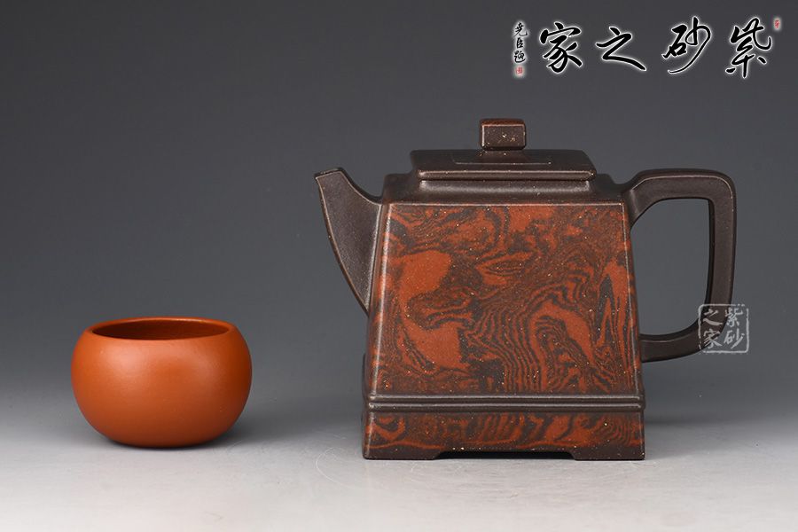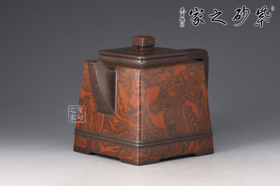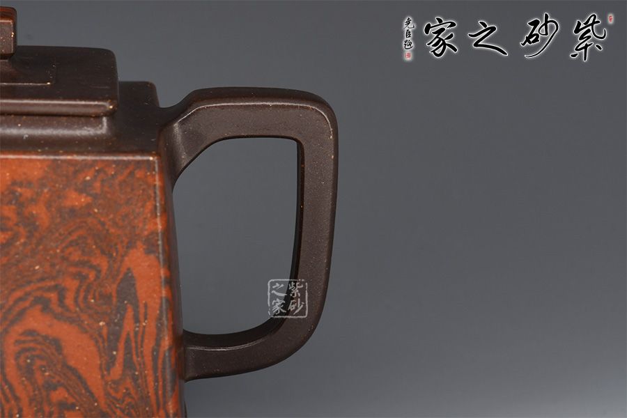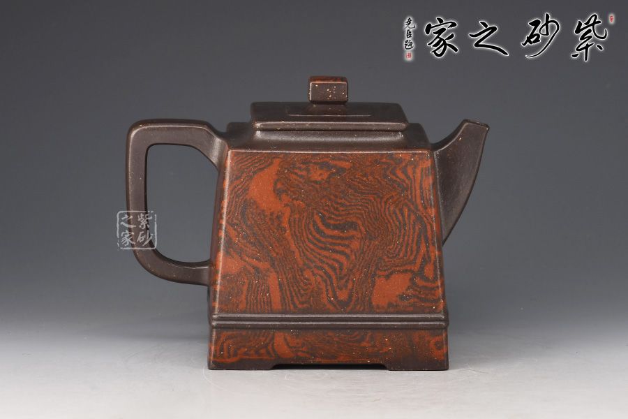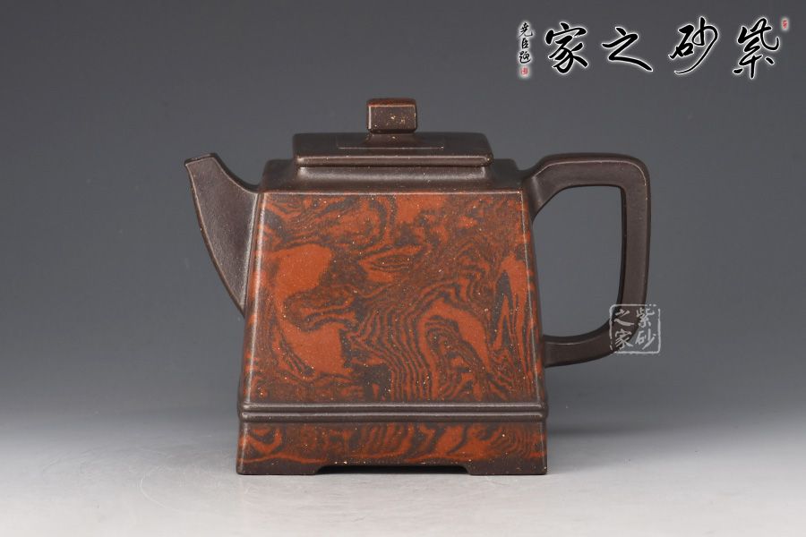 紫砂絞泥是采用兩種或兩種以上不同顏色的紫砂泥,經(jīng)人工揉合、按壓、層疊、鑲嵌等多種手法絞和而成,再通過拍打泥片,并按要求切割泥片、鑲接泥片, 直至打 好身筒,這樣便在壺身上形成不規(guī)則卻十分自然和諧的紋飾圖案,如天際流云、似雨后彩虹;如湖光山色、似大漠原野等等,這些雖在小小的壺面上呈現(xiàn)出虛虛實實的圖象,卻能以小見大地營造出亦真亦幻、自然天成的意境,這正是紫砂絞泥具有的裝飾性。