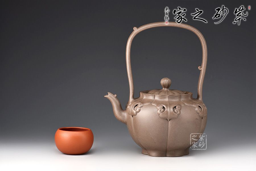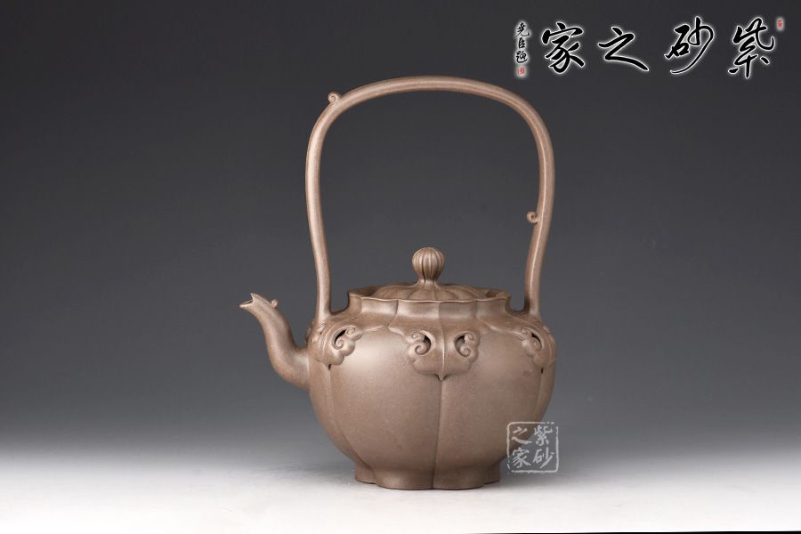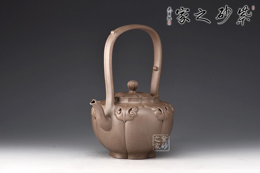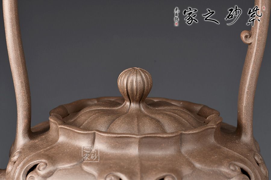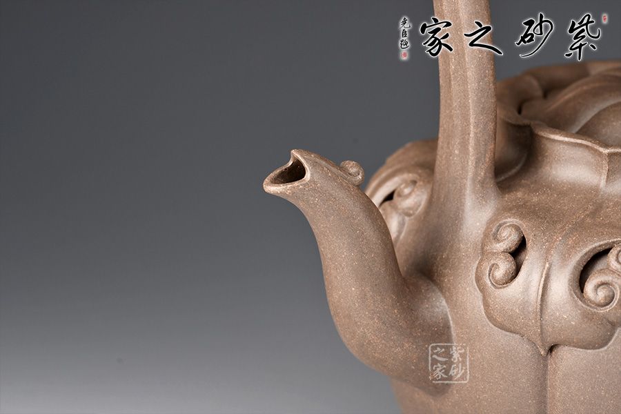 將“云肩”設(shè)計(jì)融入到壺中,相得益彰。壺頸一圈雕琢出如意紋脈,浮八雕效果,加以鏤空工藝,不僅增添立體感,同時(shí)產(chǎn)生強(qiáng)烈的藝術(shù)效果。壺身采用筋紋器的制作手法,花瓣凹凸相間、陰陽調(diào)和,美如裙擺又是含苞之菱花。壺蓋為壓蓋,做工一絲不茍,蓋面與口面嚴(yán)絲合縫。壺蓋為凸起菱花形,壺鈕設(shè)計(jì)成如意形,與壺頸上的如意紋相映襯,是中國古代的一種法器,象征著順心如意、心想事成。