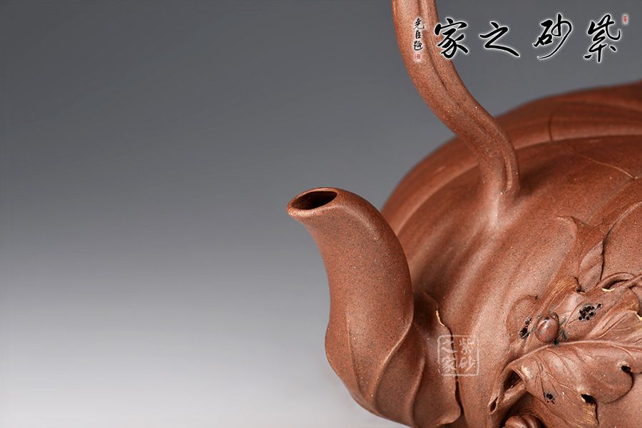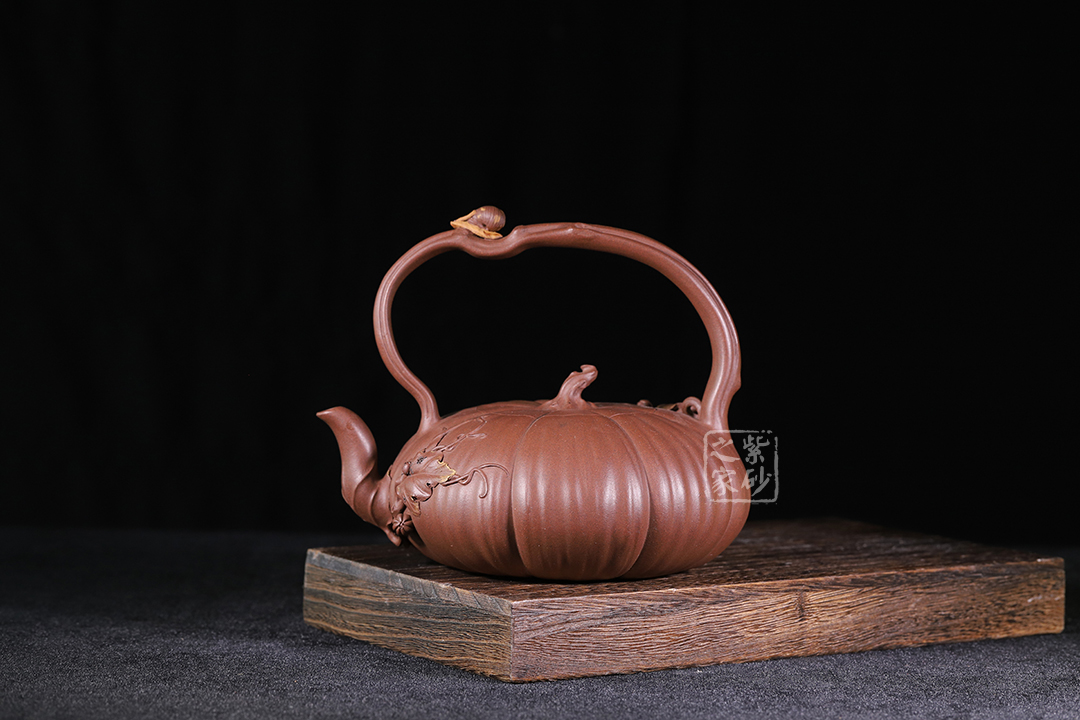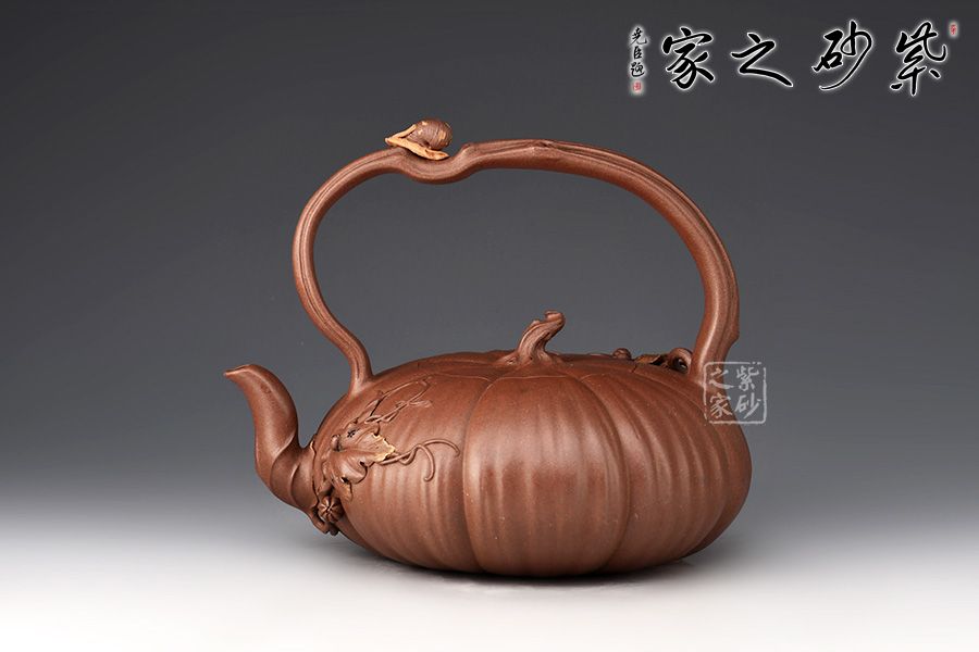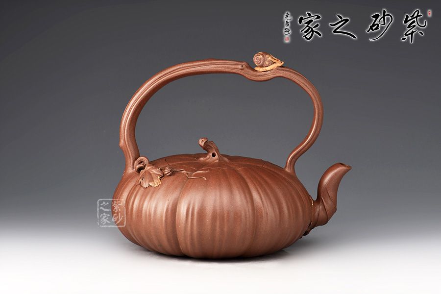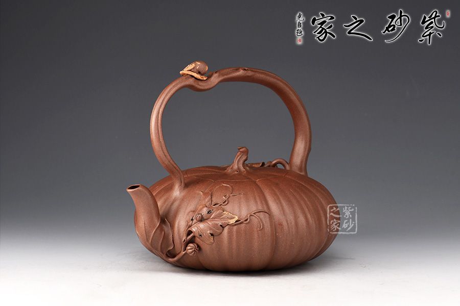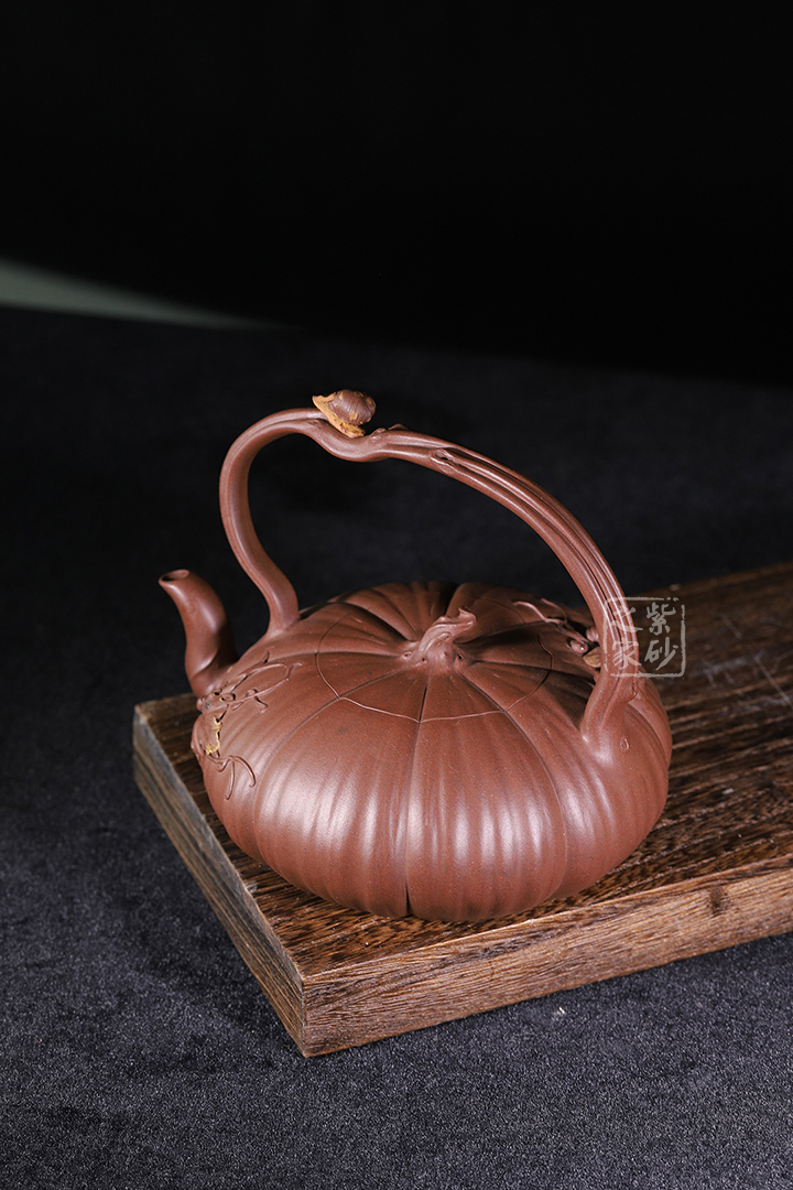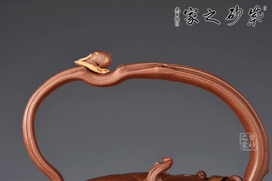 此壺以南瓜為題材,壺身扁而不塌,瓜囊飽滿而富有張力,將南瓜的氣韻展現(xiàn)眼前;瓜葉包裹壺流而出,瓜藤為提梁,一只蝸牛在夕陽(yáng)下爬行,動(dòng)靜結(jié)合。整壺造型端正飽滿,栩栩如生,充分表現(xiàn)出南瓜之神韻,賞用皆宜。