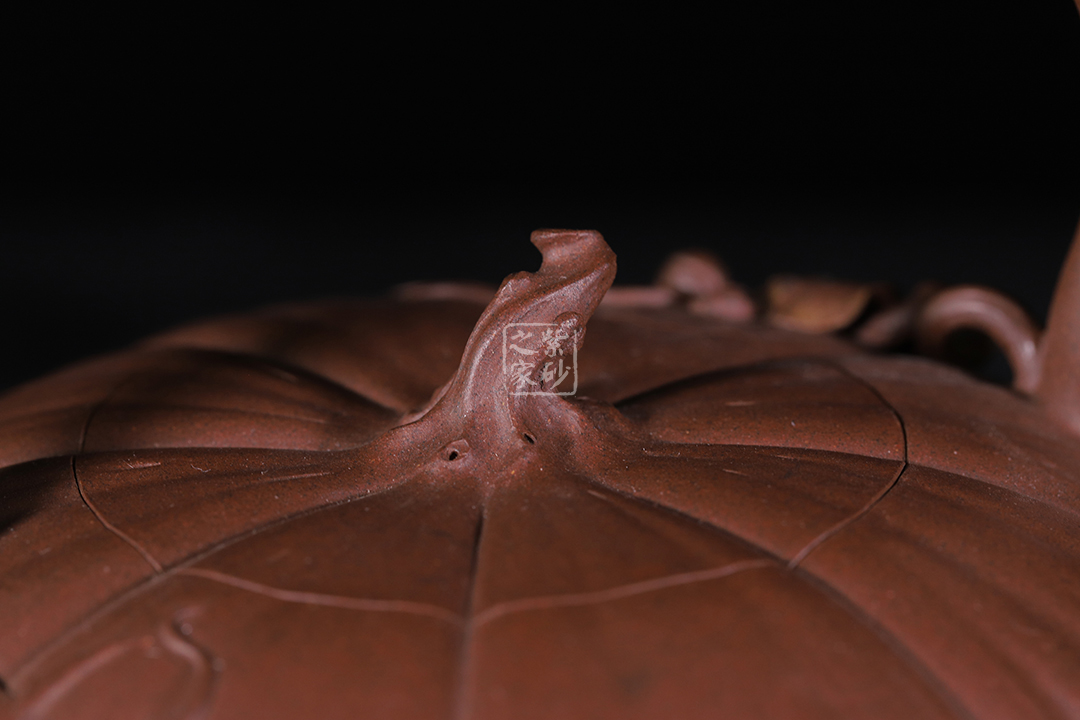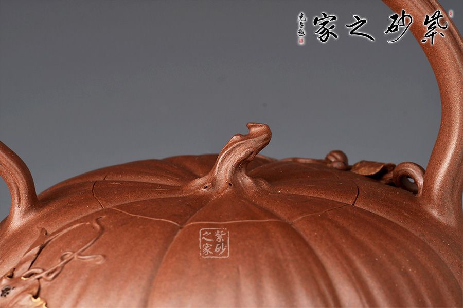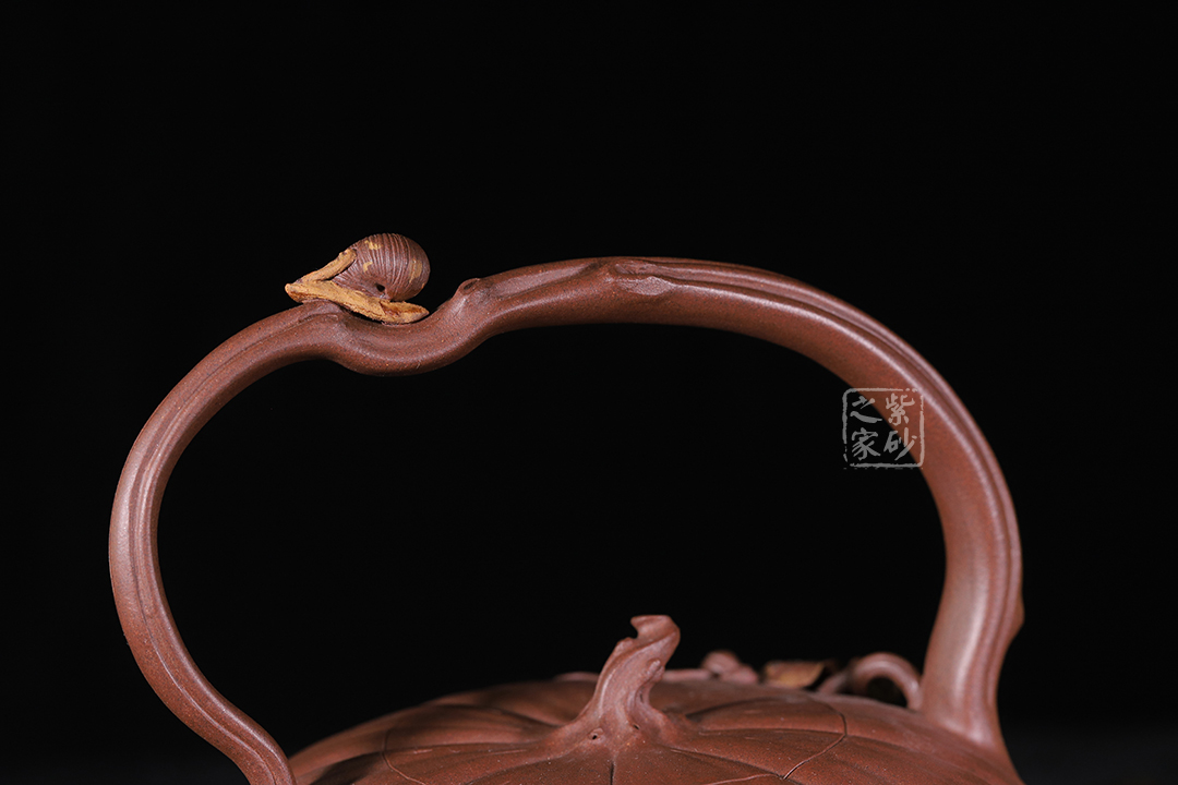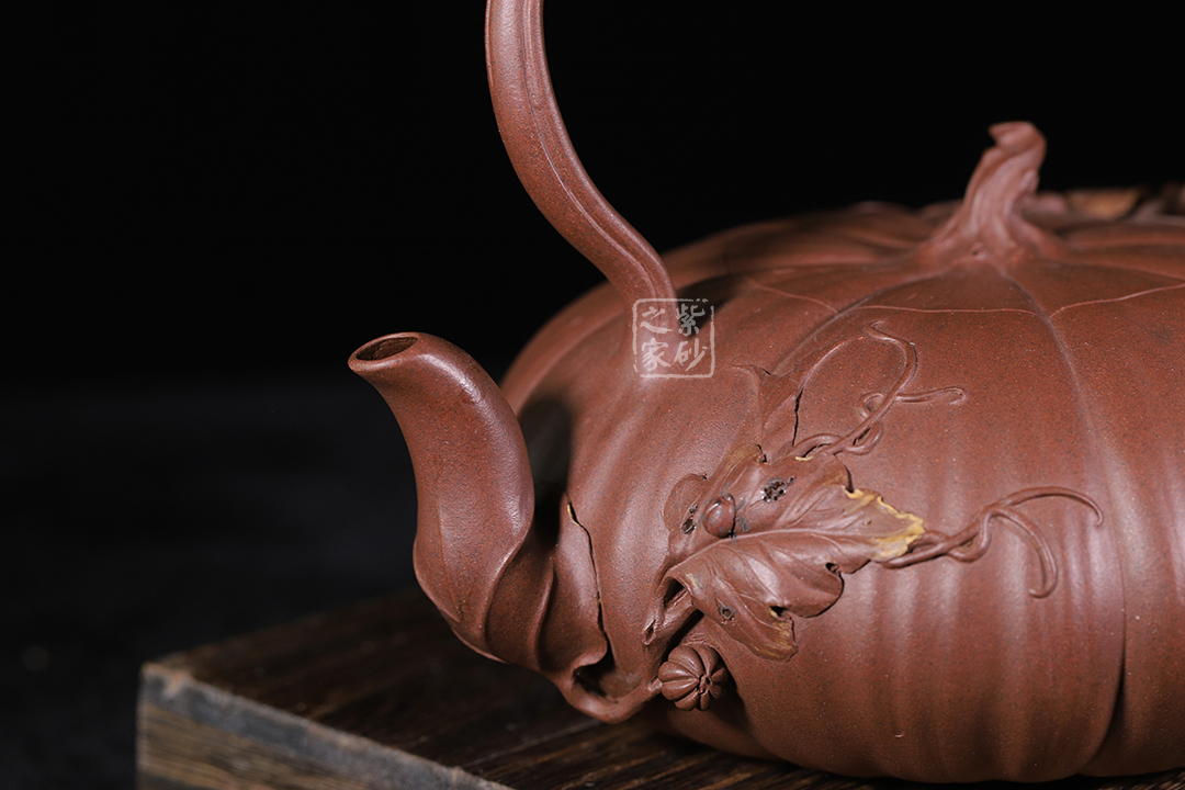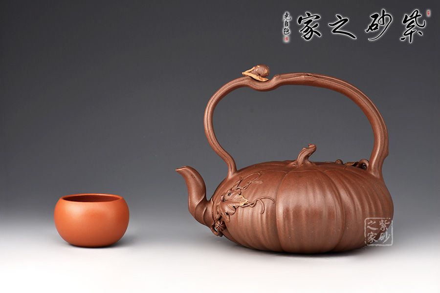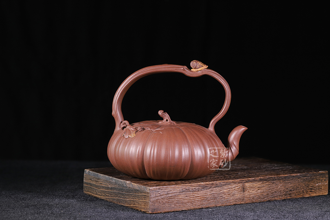 此壺以南瓜為題材,壺身扁而不塌,瓜囊飽滿而富有張力,將南瓜的氣韻展現(xiàn)眼前;瓜葉包裹壺流而出,瓜藤為提梁,一只蝸牛在夕陽(yáng)下爬行,動(dòng)靜結(jié)合。整壺造型端正飽滿,栩栩如生,充分表現(xiàn)出南瓜之神韻,賞用皆宜。