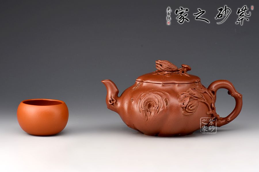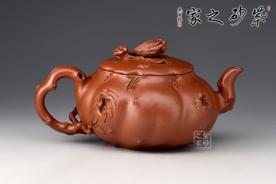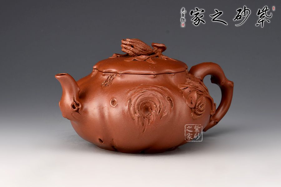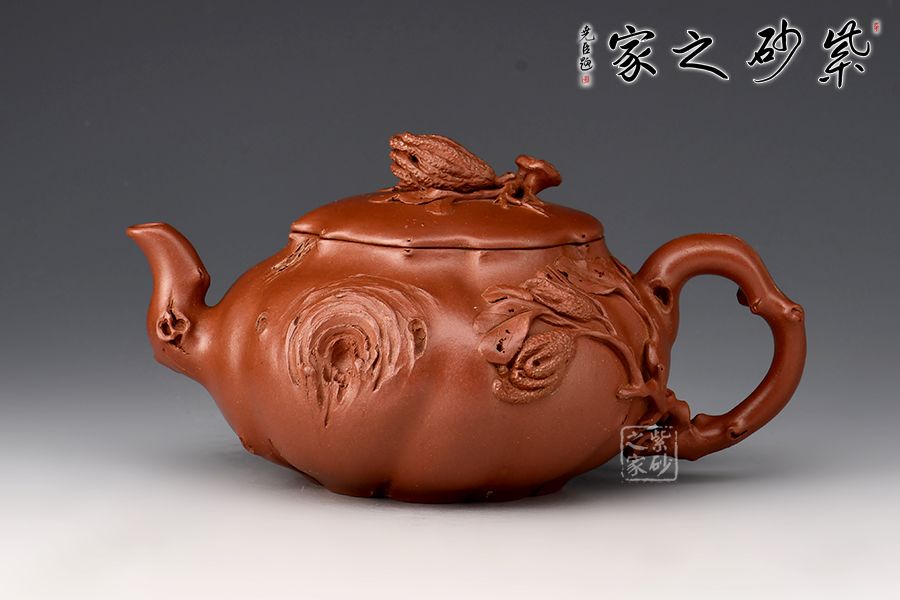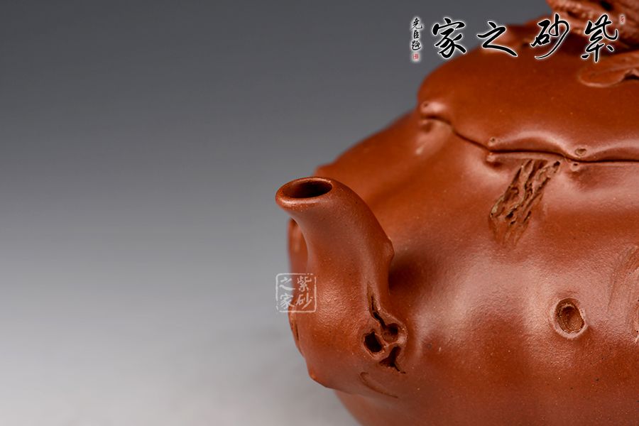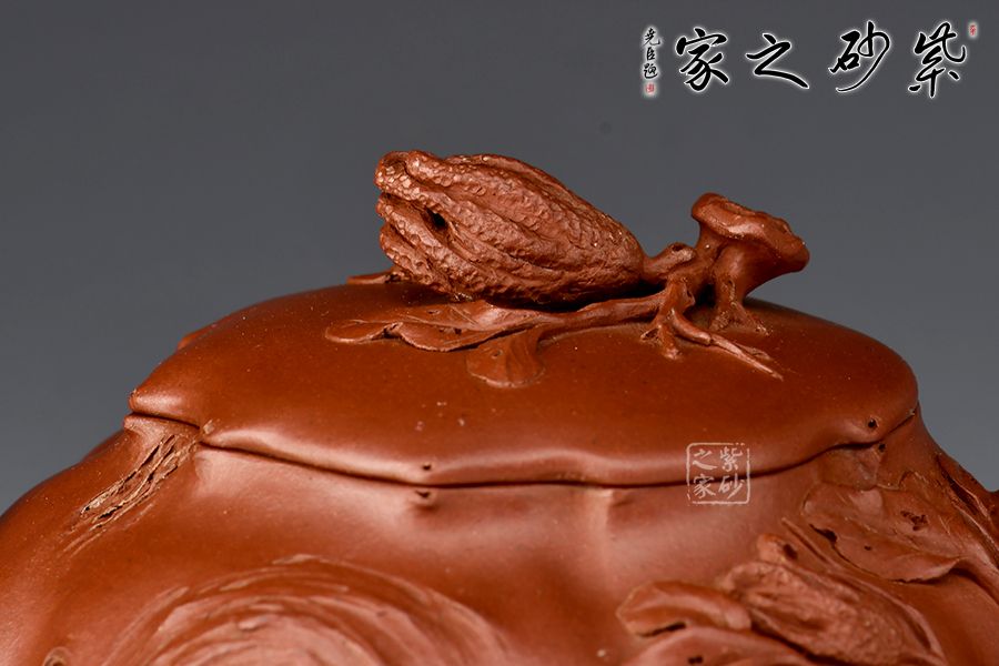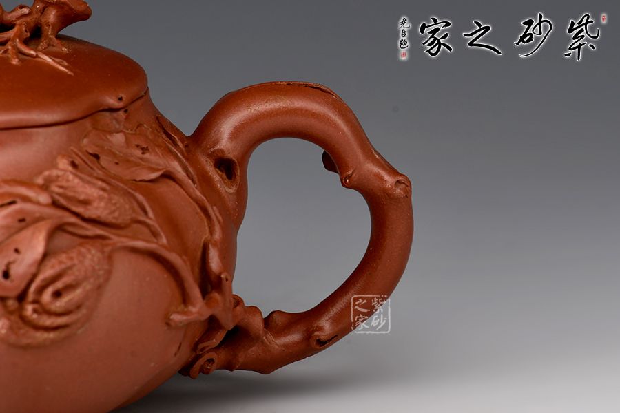 此款佛手樁與供春壺實有異曲同工之妙,壺身皆有如老樹疙瘩般,盡顯得老成,但此款作品壺身的疙瘩卻有一定的規(guī)律可尋,壺把與壺嘴纖細對稱,以佛手為壺鈕不但突出主題,亦區(qū)分出與其他供春壺的不同,可見老師創(chuàng)意之新穎。該壺還采用貼花制壺工藝,于壺嘴處胥出一枝佛手,葉茂實美,耀眼奪目。