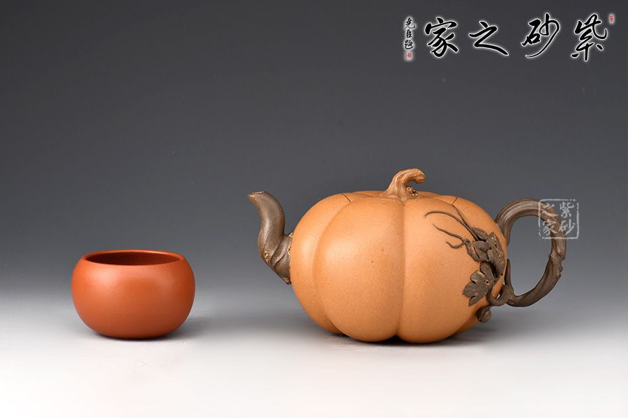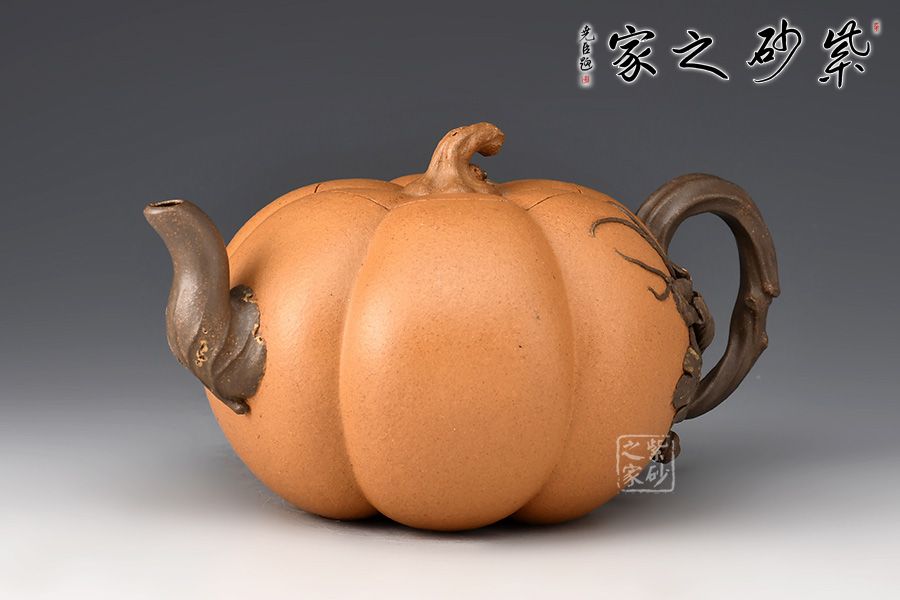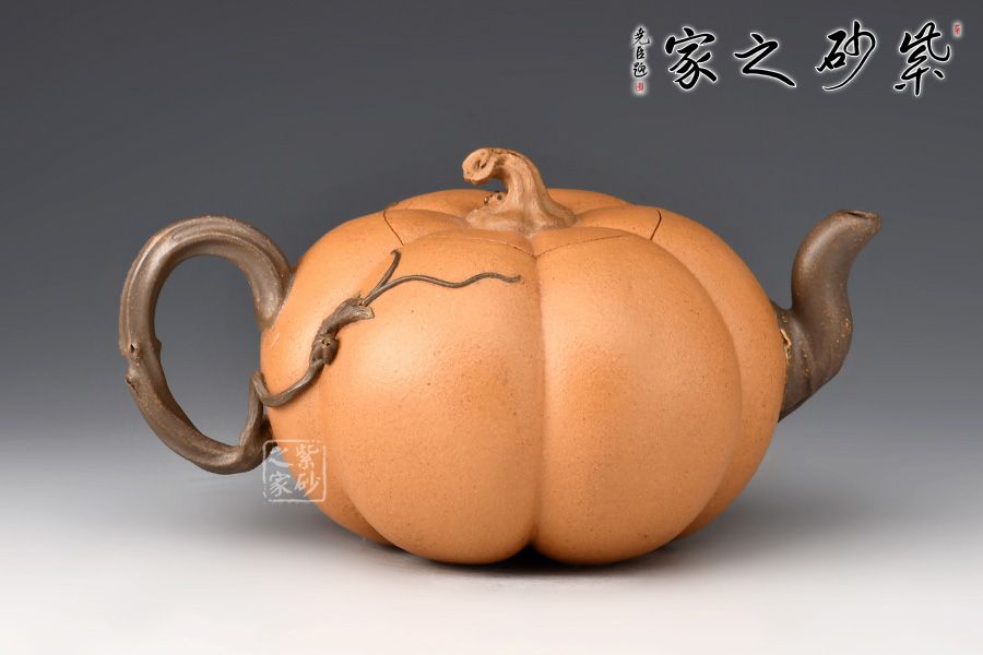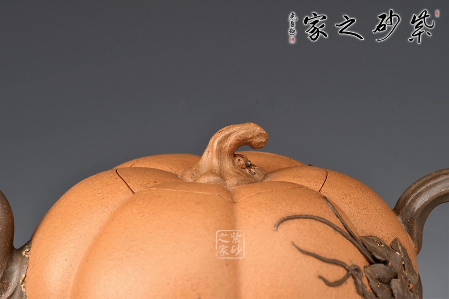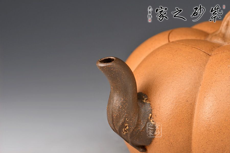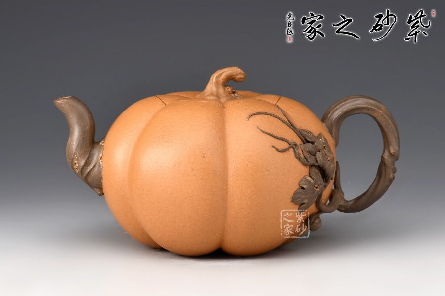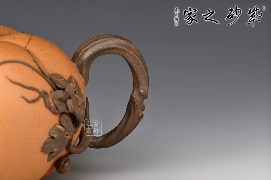 整器仿自然中瓜果的形態(tài)制成,生動自然中表現(xiàn)出一種田園閑趣 。金瓜壺壺身簡練流暢,體態(tài)豐腴,造型巧妙之處,莫過于壺身筋紋,簡潔并富有力度。瓜葉卷成嘴,瓜藤為把,并從把稍處冒出瓜葉藤枝,蜿蜒壺身,藤蔓紋理逼真。此壺融合繪畫配色,雕刻自然細(xì)膩,充滿了美感。