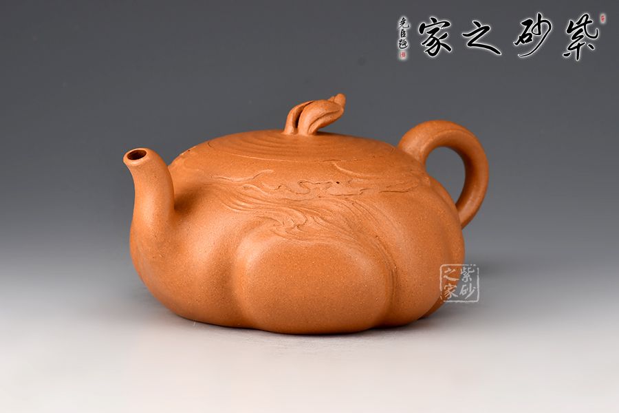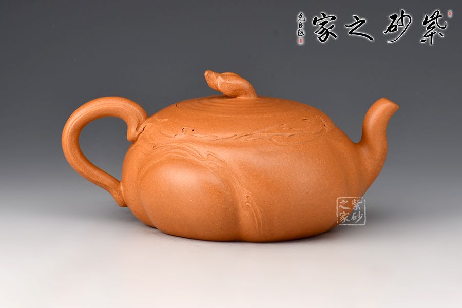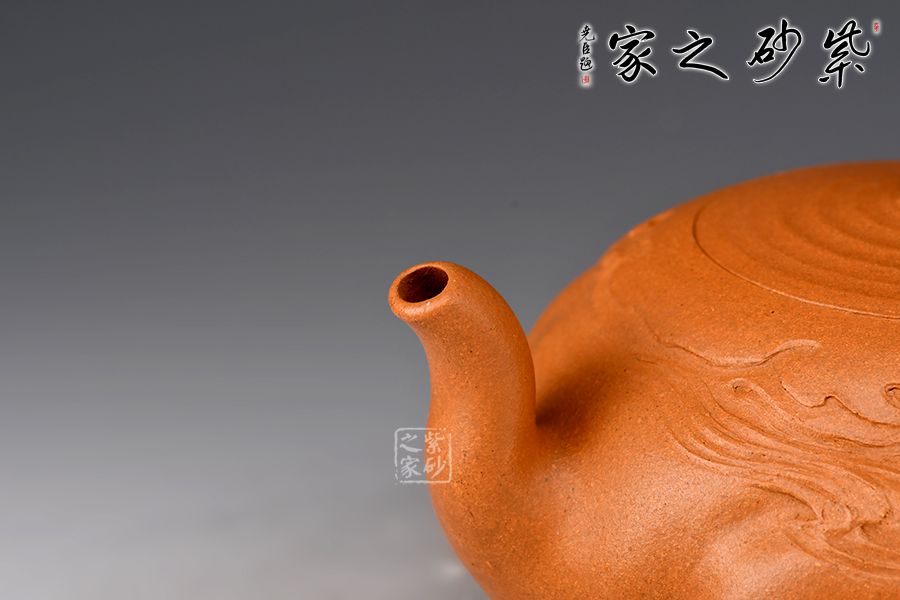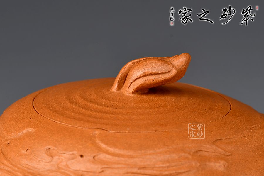 用靈泉壺,感受似水年華。壺身扁圓,三彎嘴,曲折上揚(yáng),把圈略聳而環(huán),呼之對(duì)應(yīng)。嵌蓋融入壺身,渾然一體,水波紋裝飾,動(dòng)感十足。