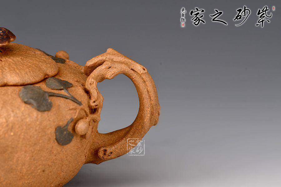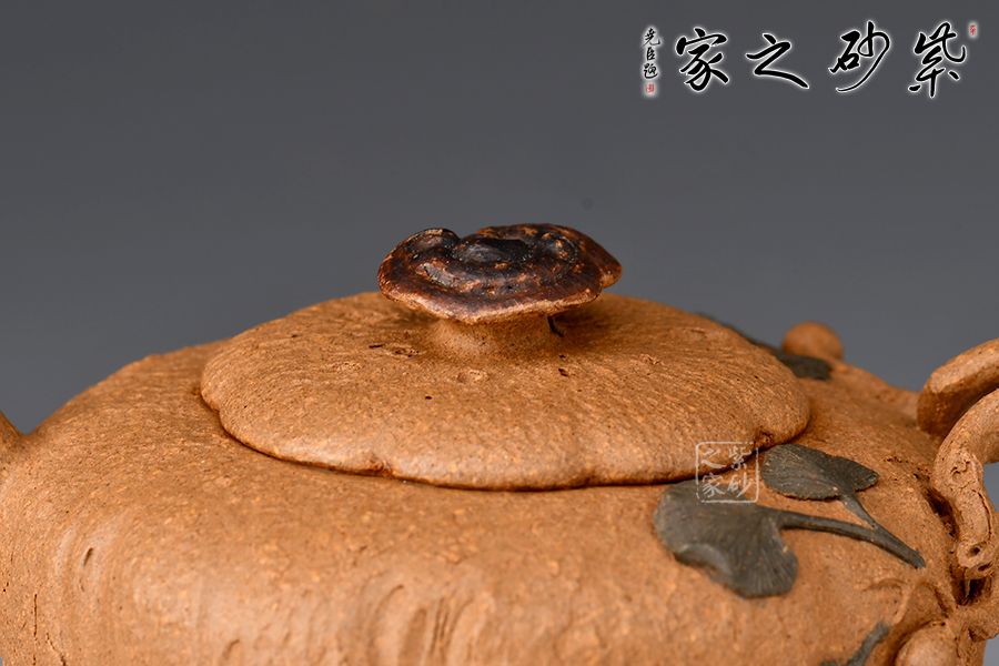 此壺為供春壺,壺蓋嚴(yán)絲合縫,氣密性佳,靈芝為鈕,仿生形象。壺體自然肌理豐富,凹凸不平,韻味獨(dú)特,壺面繪刻銀杏葉,有長壽,多子多福之寓意,整體造型渾圓敦厚,古樸雅拙,推薦入手。