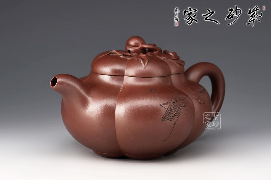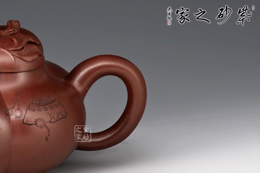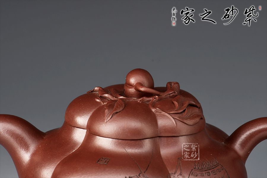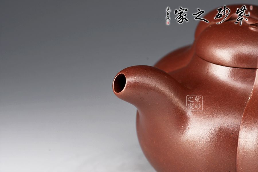 作五瓣筋囊式,等分均勻規(guī)則。壺身鼓腹,囊塊圓渾飽滿,每瓣口與蓋嚴(yán)密相合。彎流作盈巧處理,把從凹瓣中胥出,兩者相得益彰。鈕作塑桃子,葉瓣貼飾于蓋面,韻味質(zhì)樸。