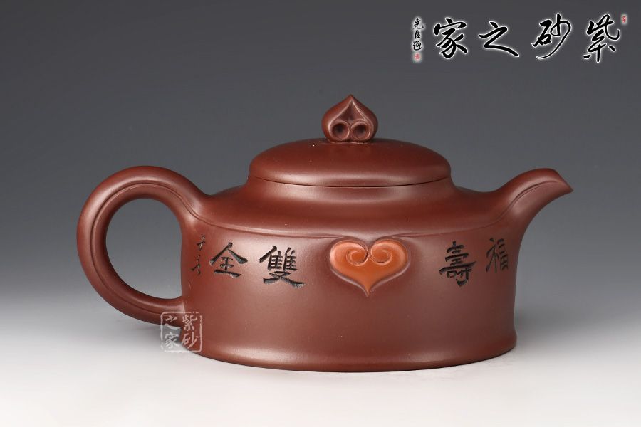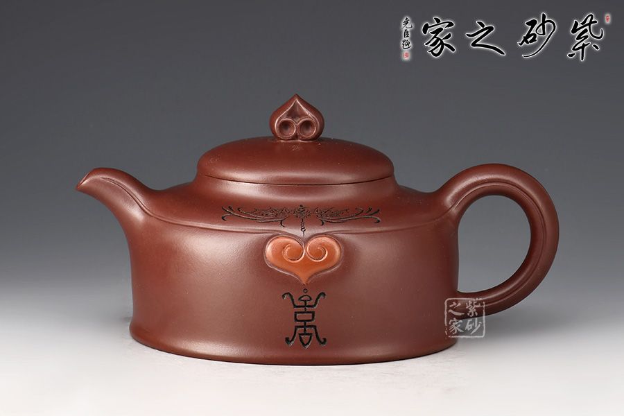 整壺線條流暢,端莊大氣。壺身刻繪裝飾如意紋、蝙蝠,蝠”同“福”,而如意又有著稱心如意的意思,增添壺身美觀的同時,又與壺身主題相呼應,吉祥寓意更加明顯。