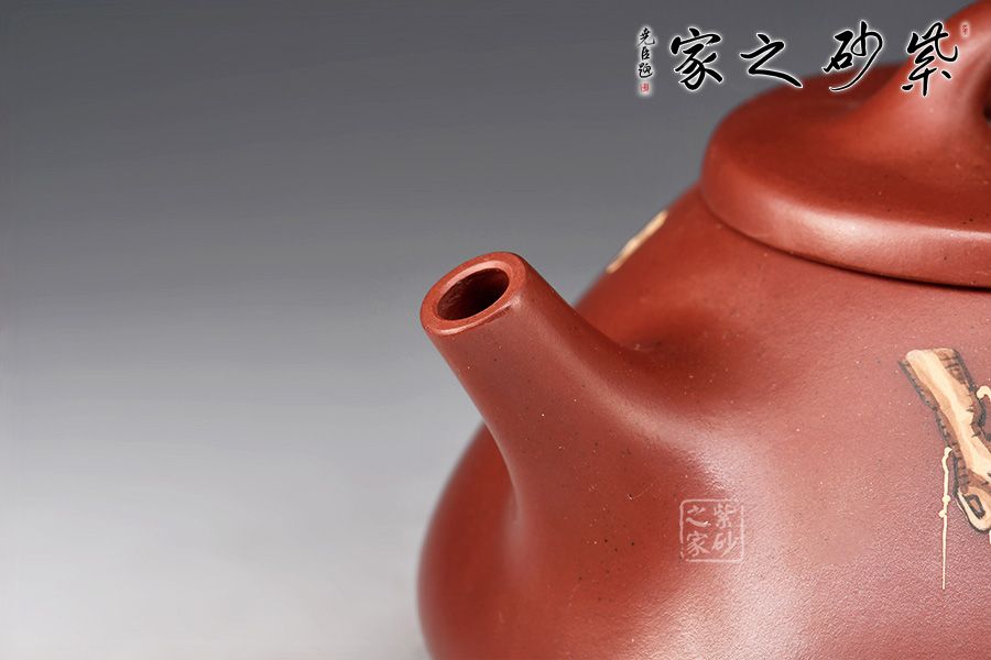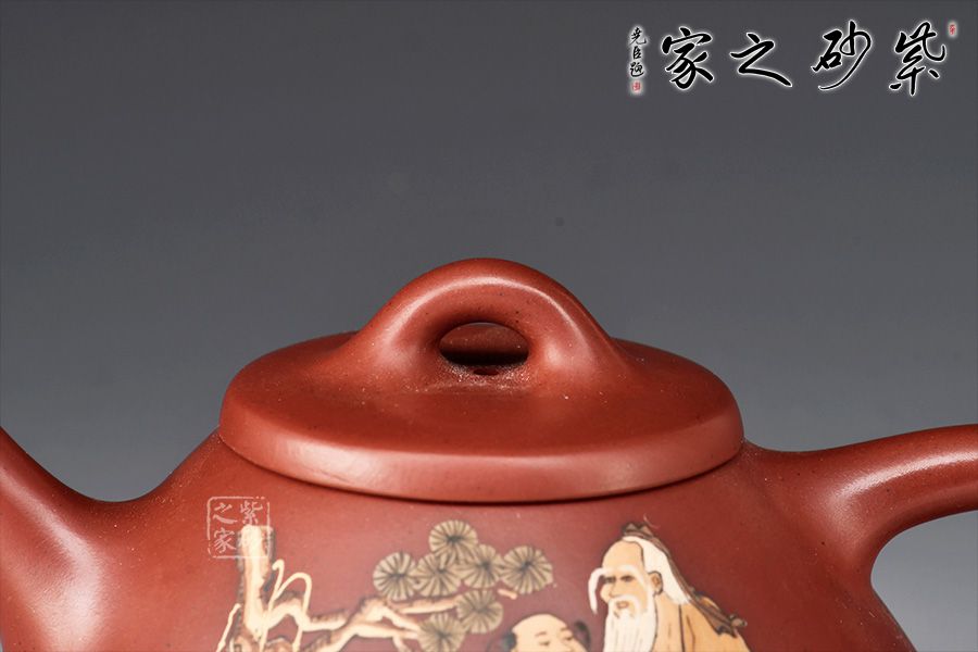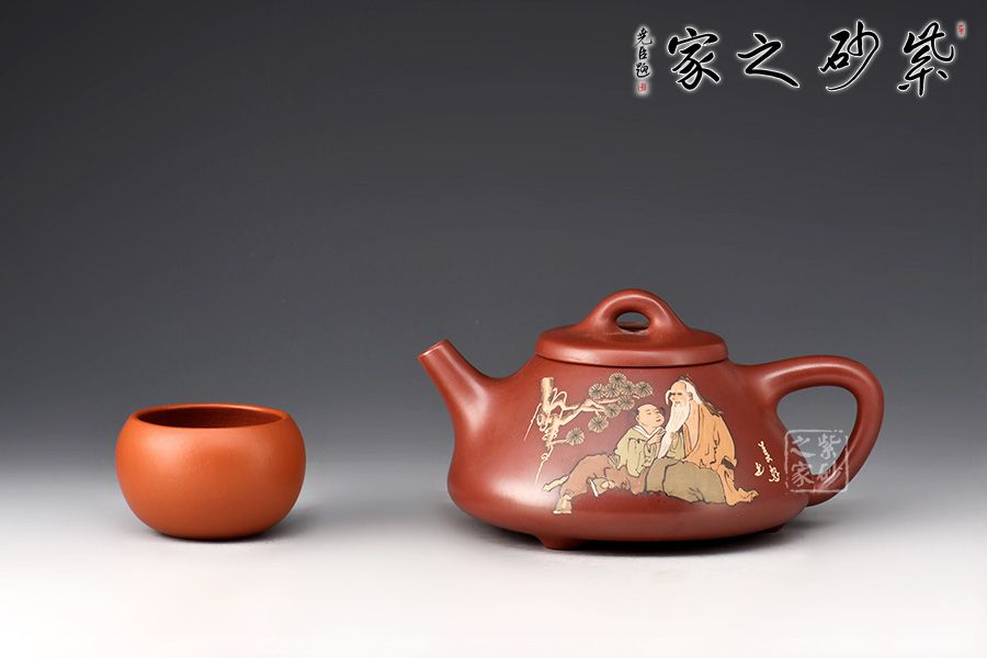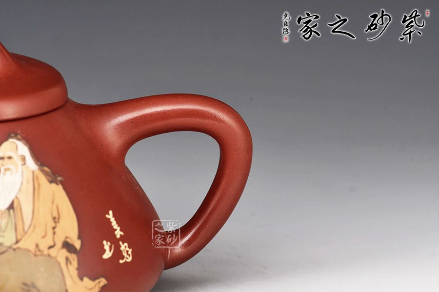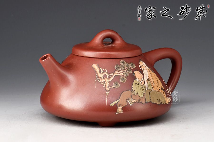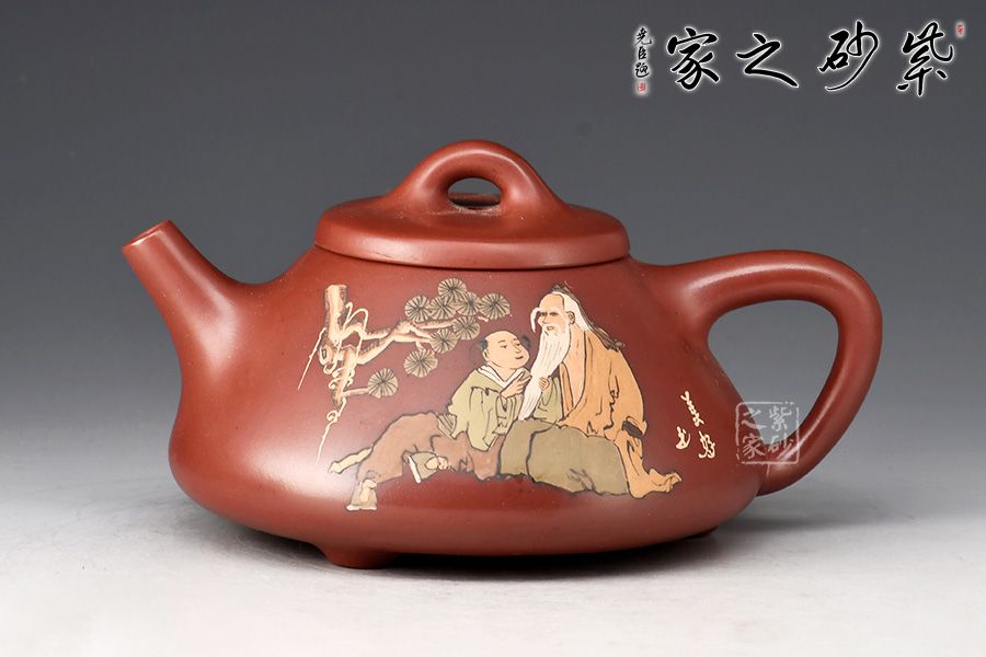 此壺取經典子冶石瓢之型,整體造型簡約大方,壺身呈金字塔形,壓蓋之上以橋鈕裝飾,直流簡而有力,出水順暢,壺把呈倒三角勢,與壺身之型互補,形成和諧的美學效果。壺腹泥繪老者、童子,松樹,工藝精細,佳器一把,賞用藏皆宜。
