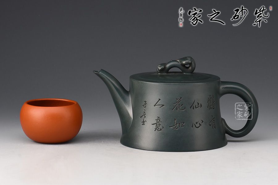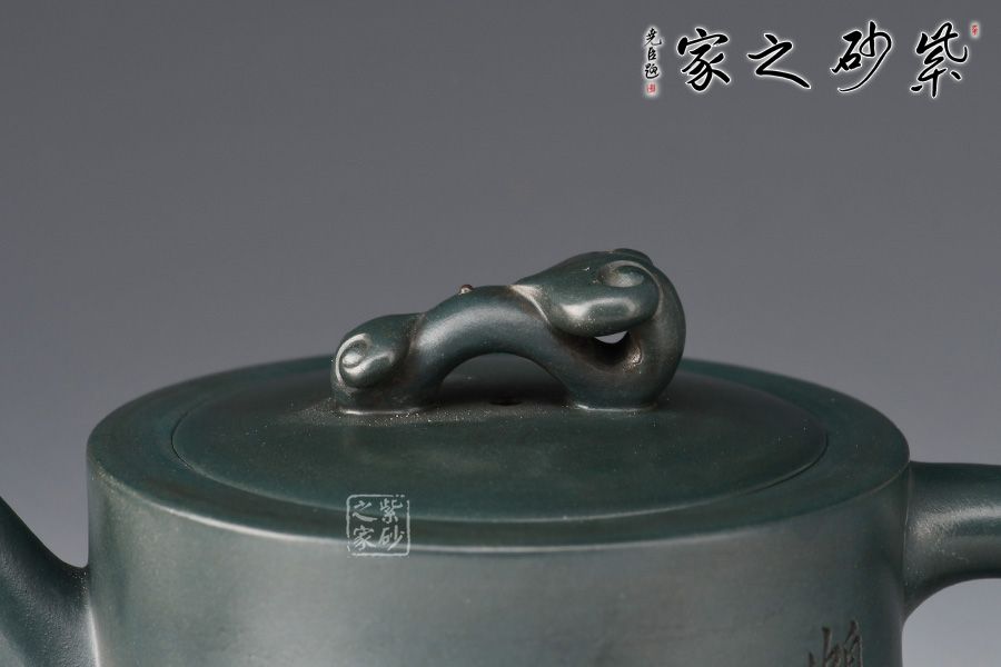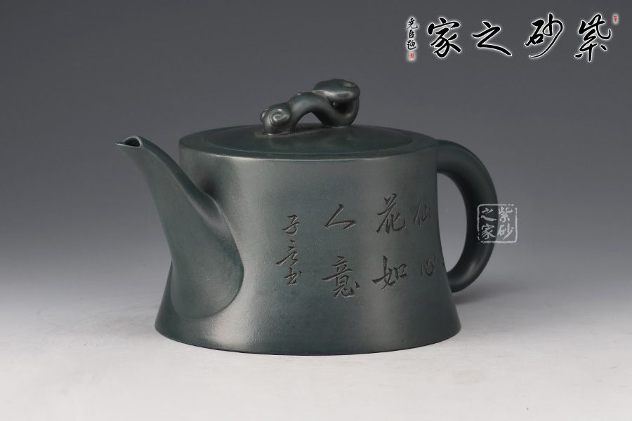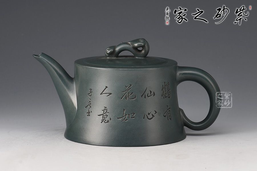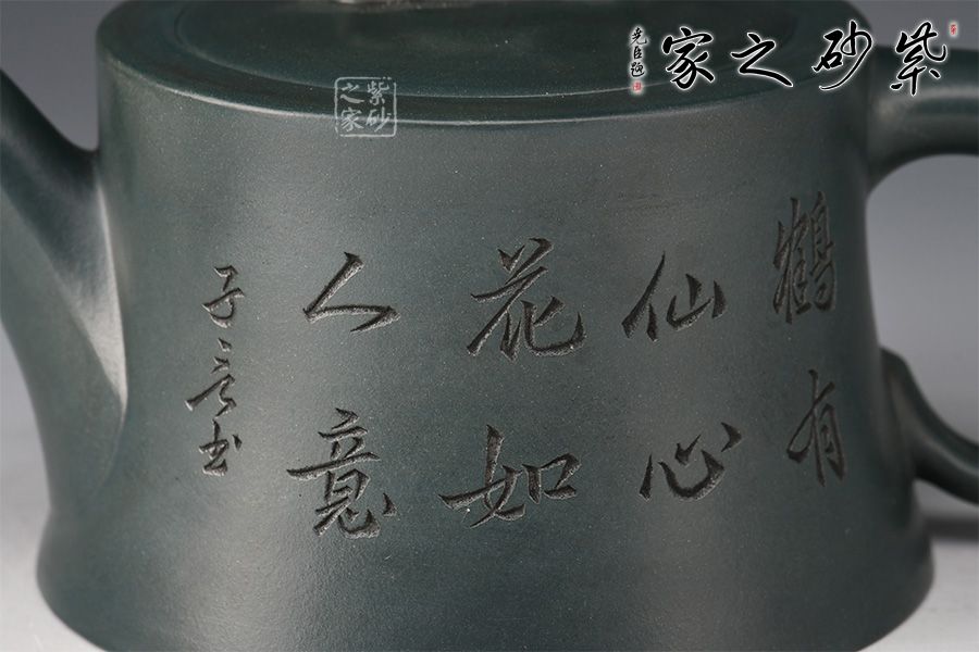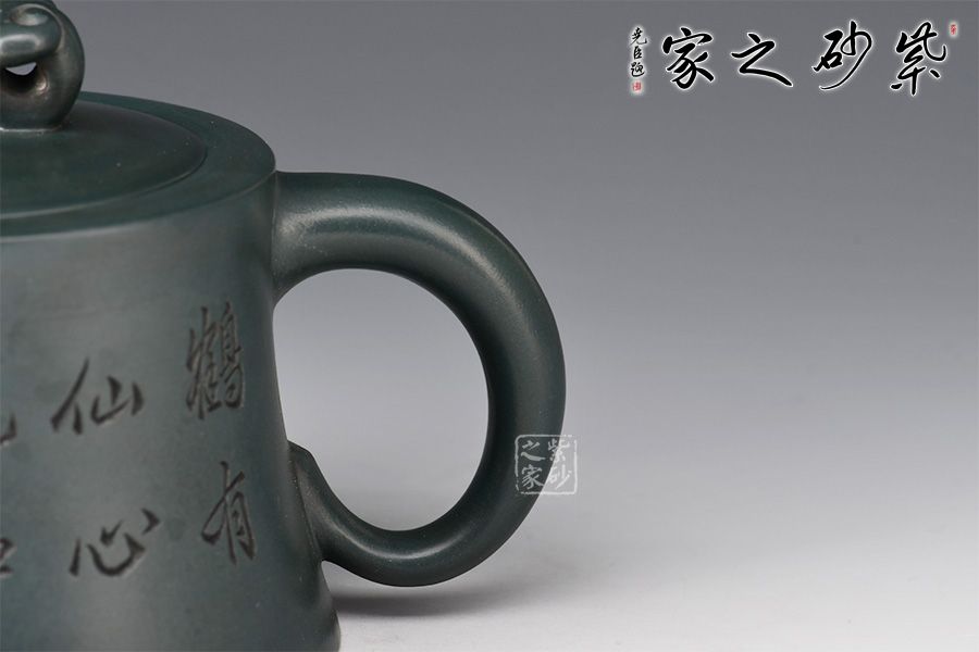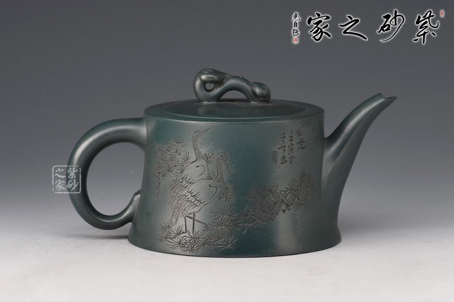 壺身呈柱狀,上窄下寬,線條流暢。壺嘴細長,出水爽利,倒耳把比例精巧,拿捏舒適。嵌蓋設計,嚴絲合縫,玉如意壺鈕,寓意吉祥。此外,壺身雙面陶刻,正面刻繪“鶴有仙心,花如人意”,反面刻繪仙鶴圖,寓意延年益壽。