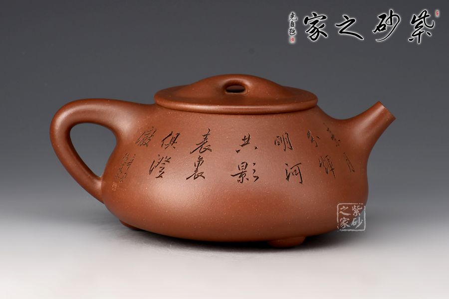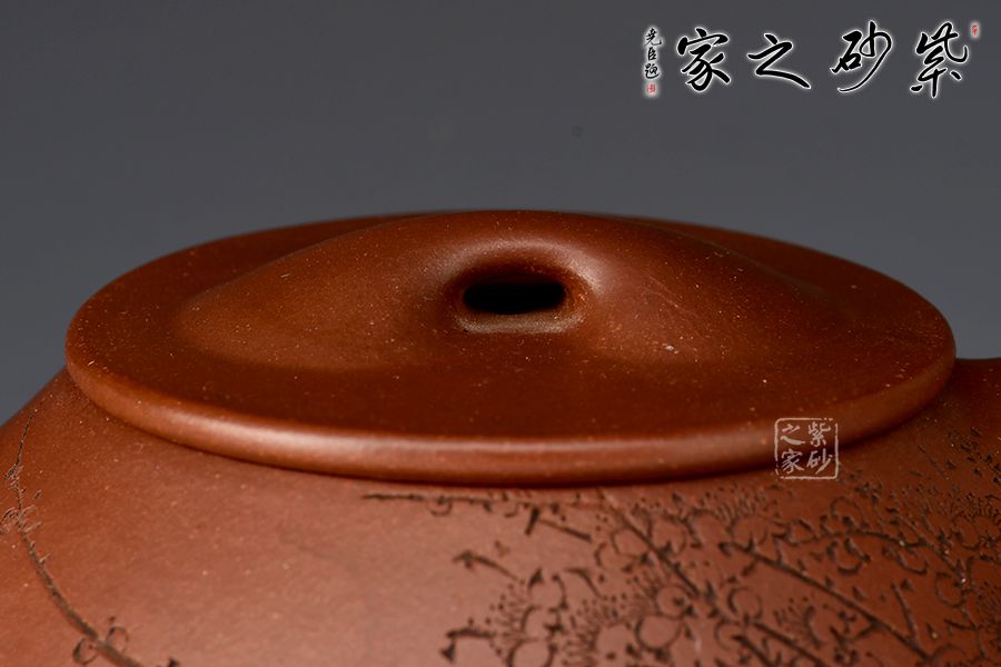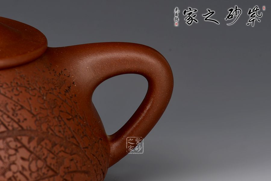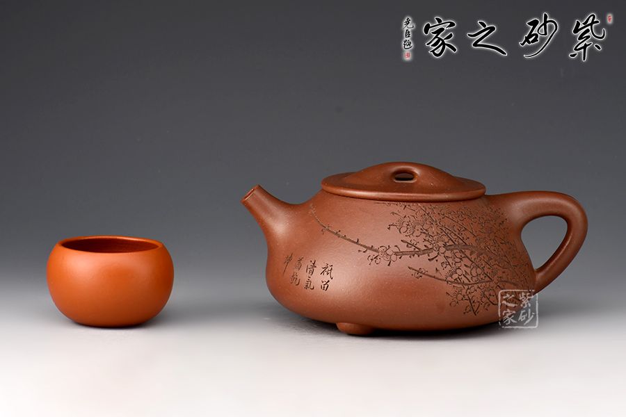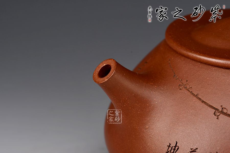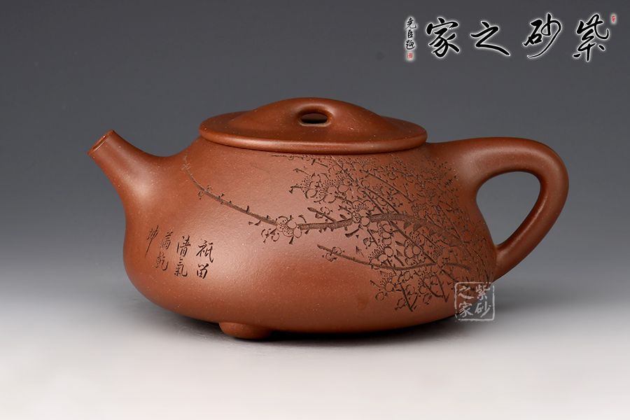 此壺摹古而作,以景舟石瓢為型,壺身呈八字造型,豐潤飽滿,曲線柔和流暢,平壓蓋、橋鈕,拿取自如,直流簡而有力,出水順暢,壺把上豐下斂,與壺身之型形成和諧的美學(xué)效果,底部三足給人以輕靈而穩(wěn)重之感。壺身正面刻梅花綻放之姿,配以“只留清氣滿乾坤”,以表梅之清潤韻香,詩情畫意,茶韻悠悠,觀賞性、實用性俱佳。