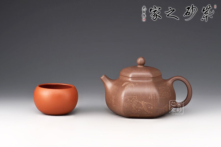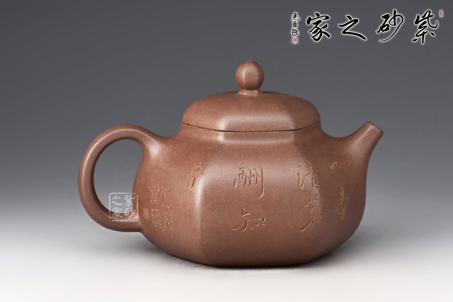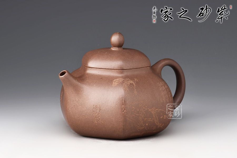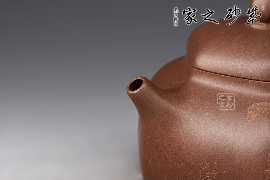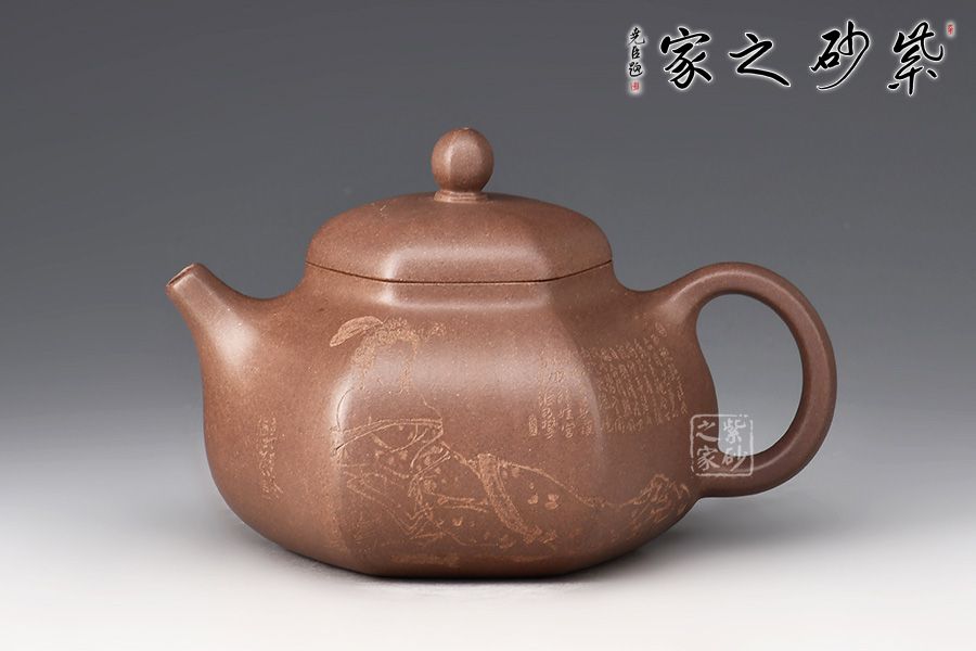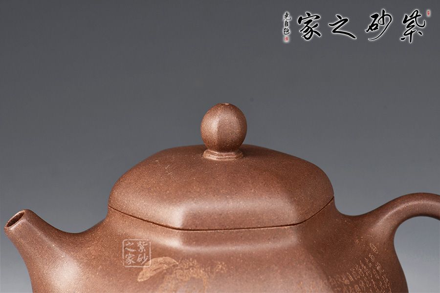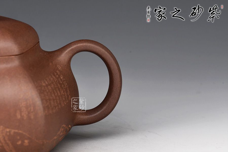此壺乃是在文旦壺的基礎(chǔ)創(chuàng)新上演變而來,壺身各部均分為六面,鑲接成型工藝難度大,點(diǎn)線面清晰明確,線條自壺鈕氣孔處斜斜流瀉而下,各面略鼓出,肌理豐盈而力道渾厚。壺嘴為六方彎流,出水爽利,暗接手法與壺身相連,壺把與壺身相對(duì)應(yīng)。整個(gè)壺型在原有基礎(chǔ)上增加新的創(chuàng)作理念,壺身柔美的線條,上下一氣貫通,構(gòu)思巧妙而制工細(xì)。細(xì)膩的材質(zhì),簡練的線條,這便是紫砂帶來的魅力。此外,壺身刻繪裝飾,工藝不凡。