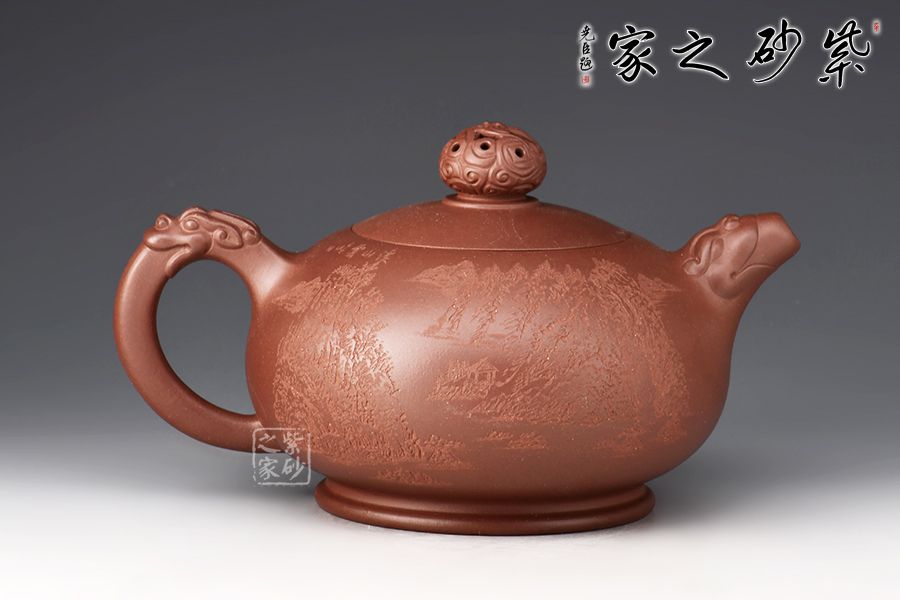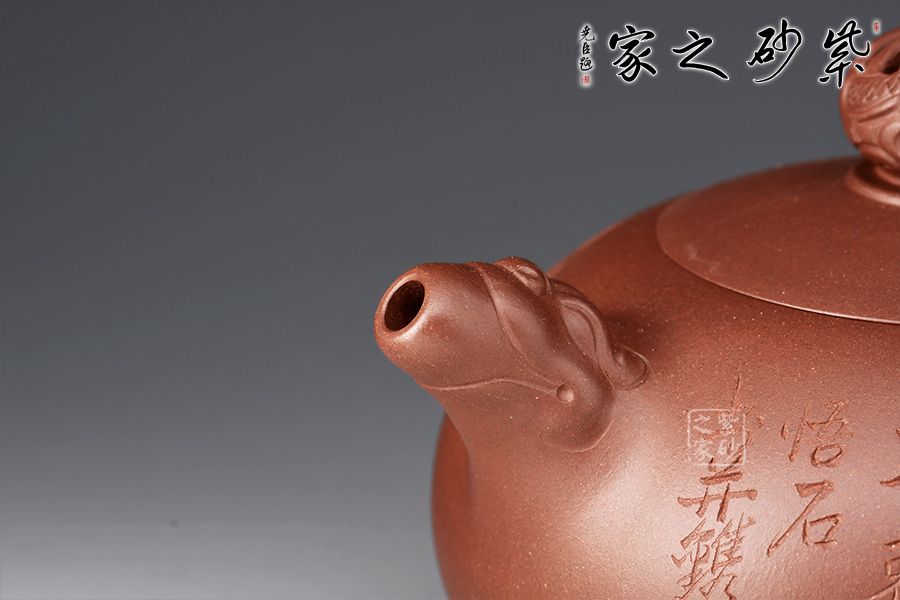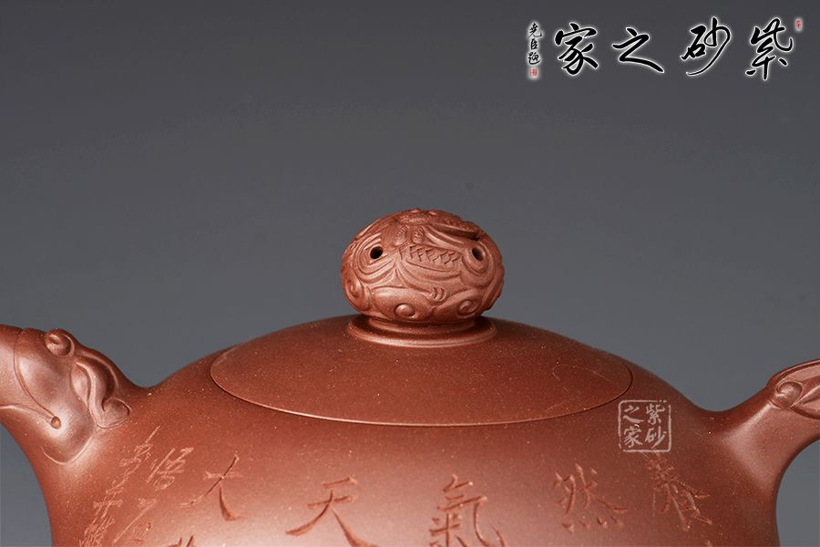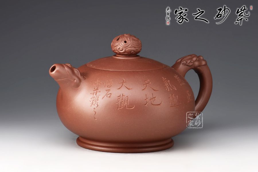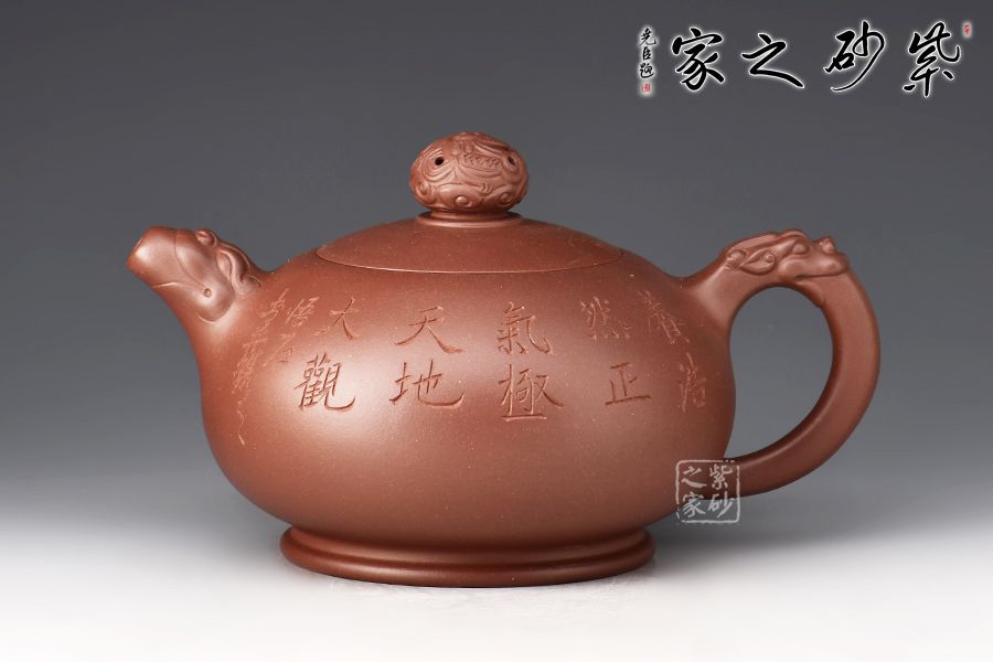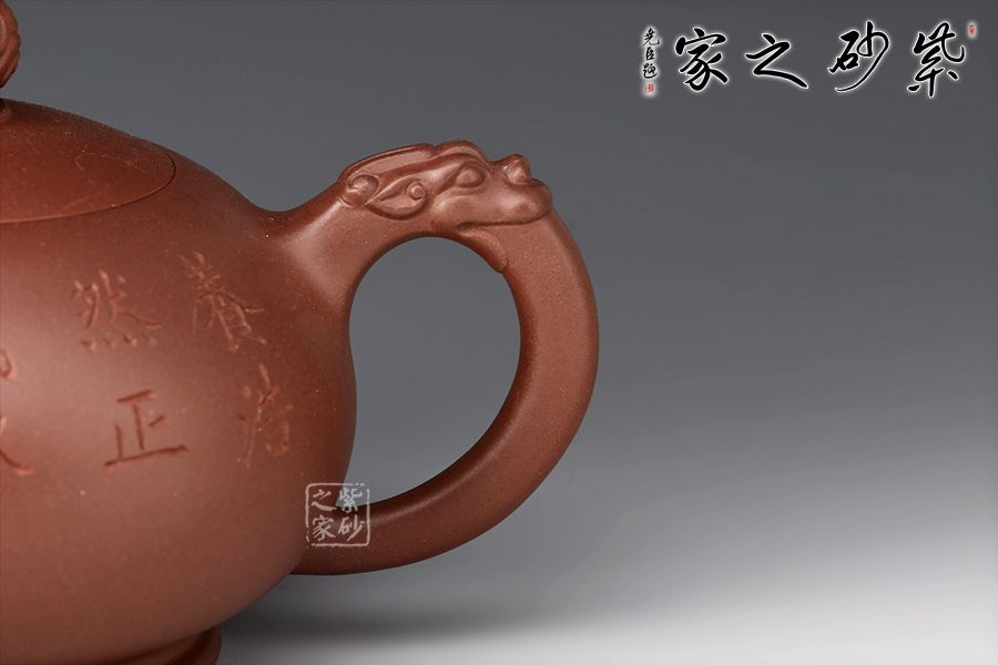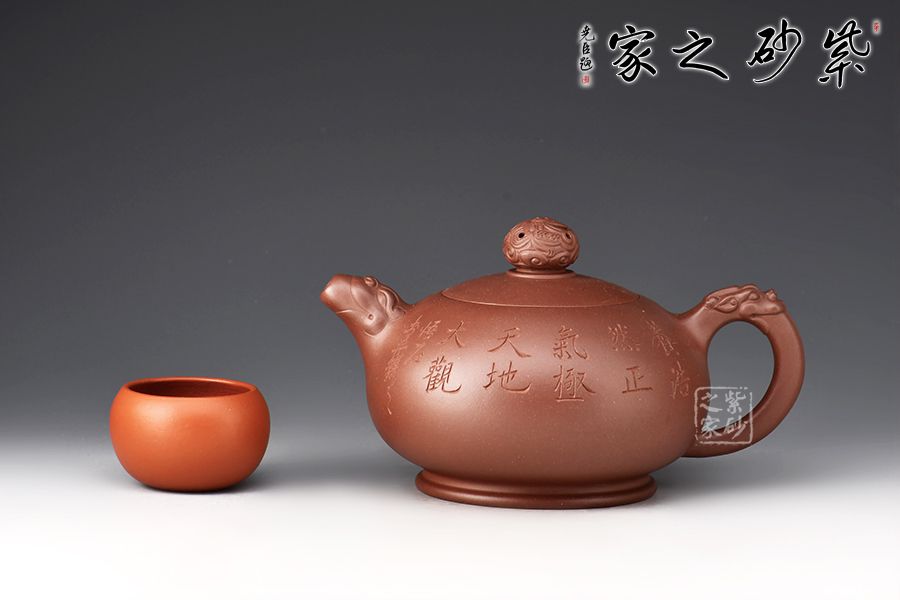天龍鼎珠壺造型雅致,古韻十足,壺把如蛟龍躍起,壺嘴為龍嘴,吐出甘霖灑向大地,大氣磅礴,壺鈕則為一顆大的龍珠,壺身飽滿,上刻:養(yǎng)浩然正氣,極天地大觀,充滿哲思。