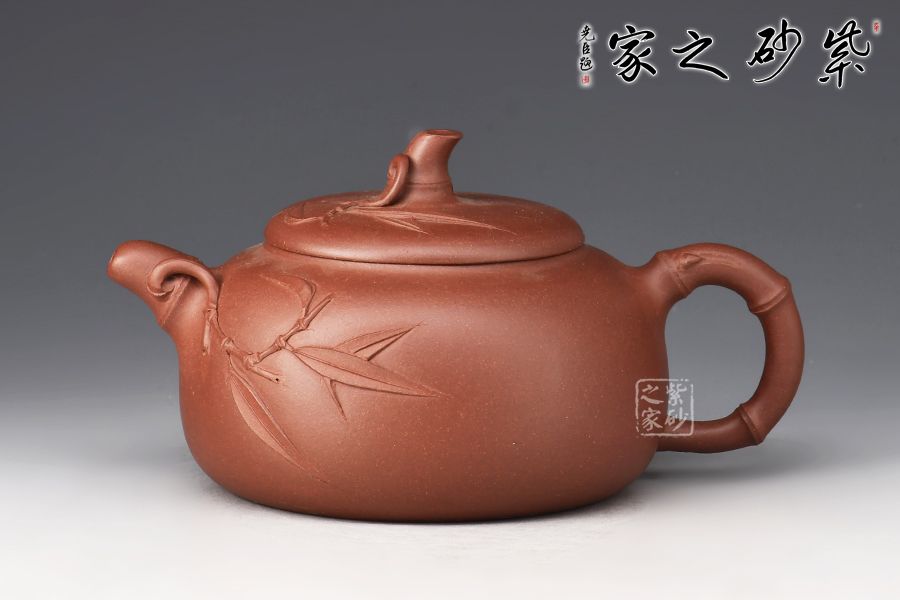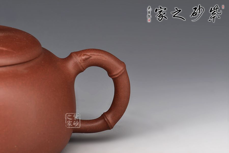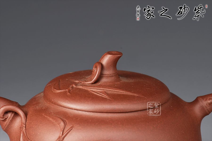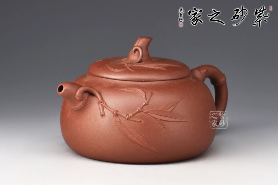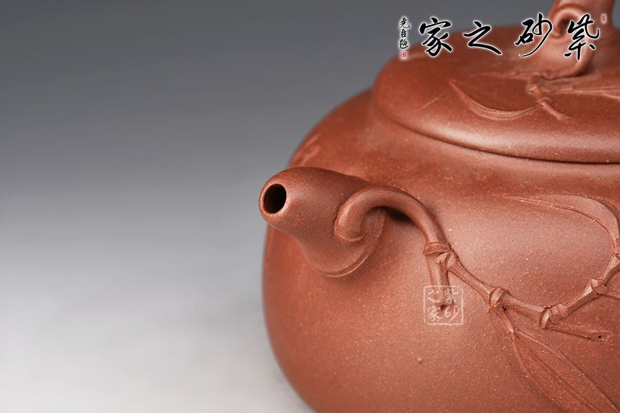 此壺名為竹鼎,以竹元素入壺。壺嘴、壺鈕以及壺把皆為竹節(jié),壺身圓潤挺括,造型優(yōu)雅。壓蓋以及壺流處伸展竹葉栩栩如生,給整潔光亮的壺身平添了一絲清新逸趣,可見老師貼花工藝之精湛。此壺扁腹大口蓋,黃金容量290cc,極為實用!