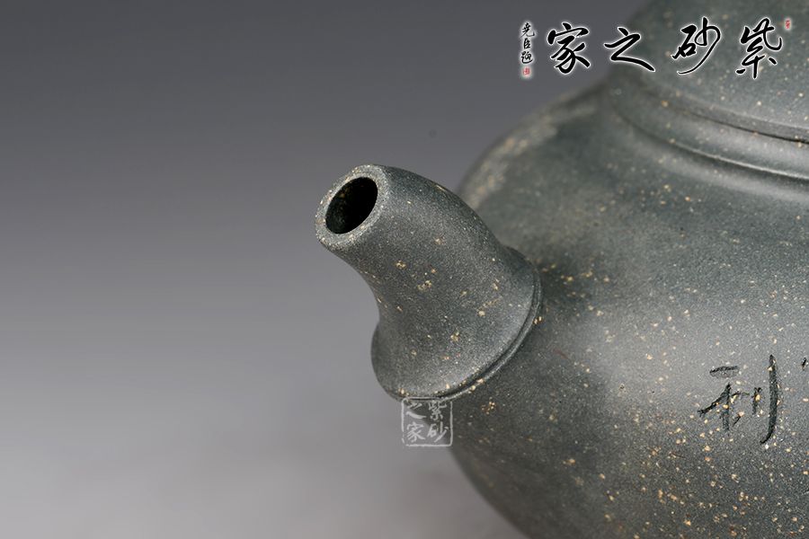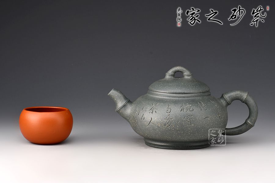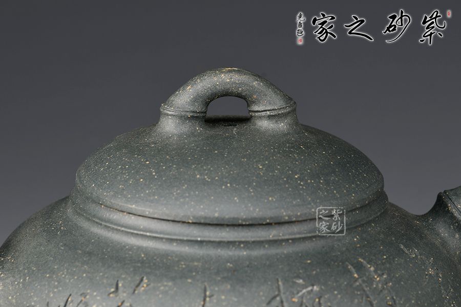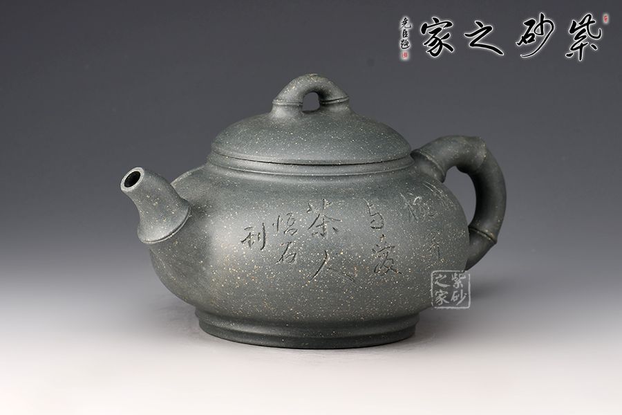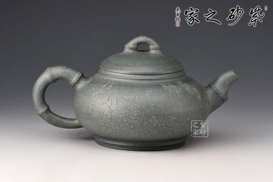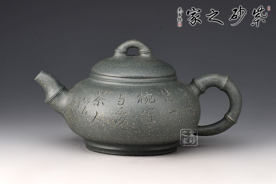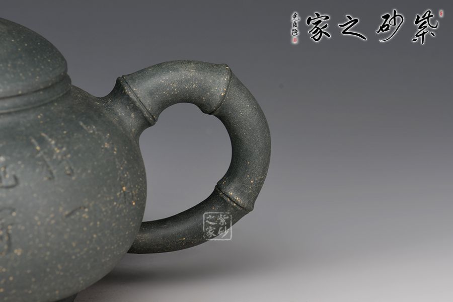 此壺以竹入壺,壺嘴、壺鈕和壺把皆為竹節(jié)裝飾,壺身扁圓飽滿,壺蓋微鼓,橋型鈕上的竹節(jié)對(duì)稱,線條雅致,大口蓋,投茶特別方便,壺底使整壺的氣韻向上,壺身刻繪:無(wú)由持一碗,寄與愛(ài)茶人,大愛(ài)無(wú)疆,好詩(shī)好壺好工好料,力薦!