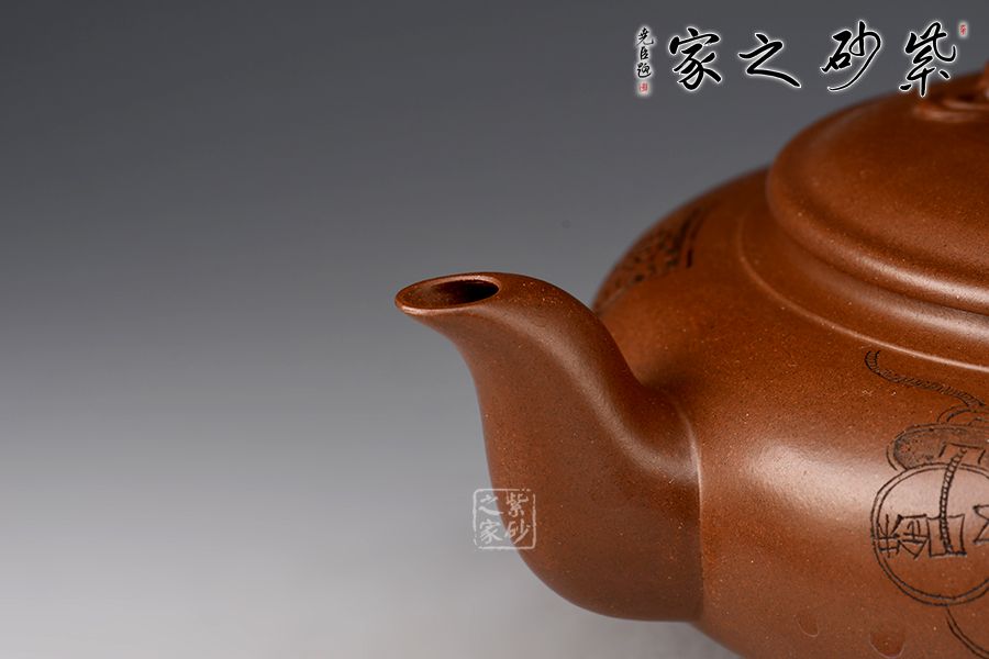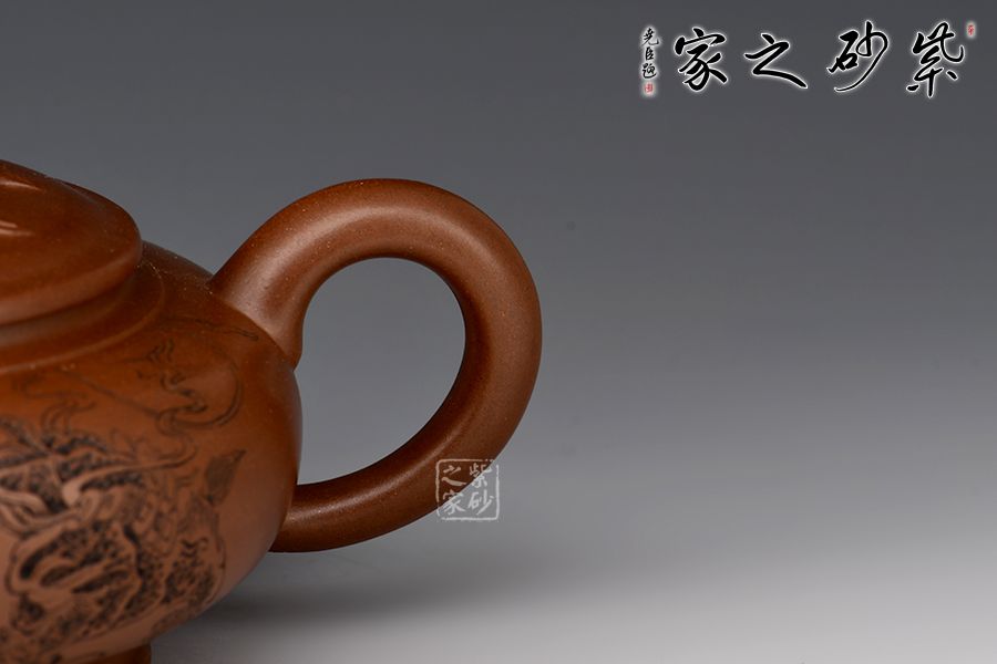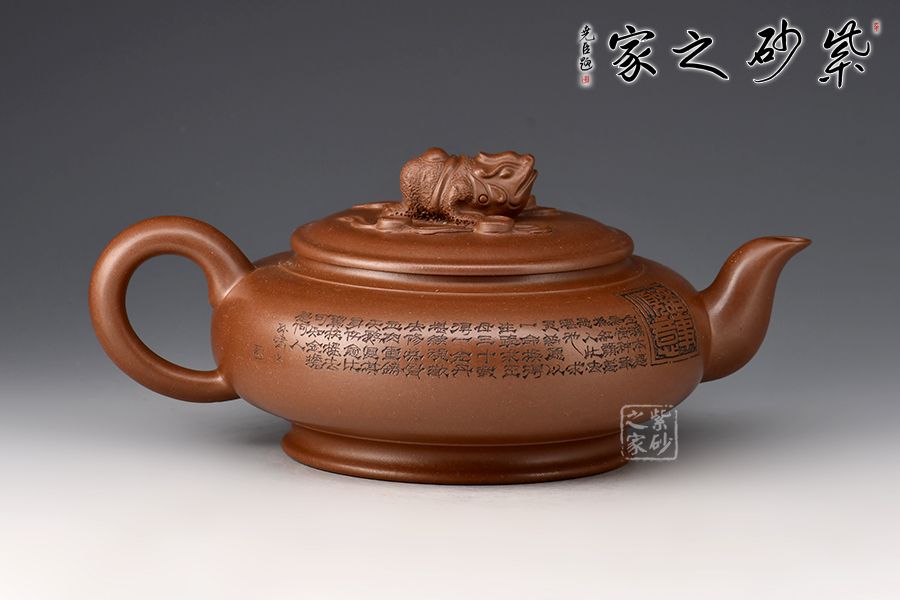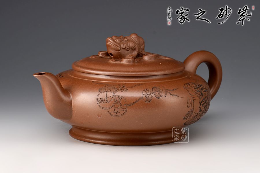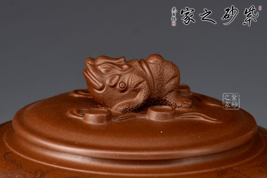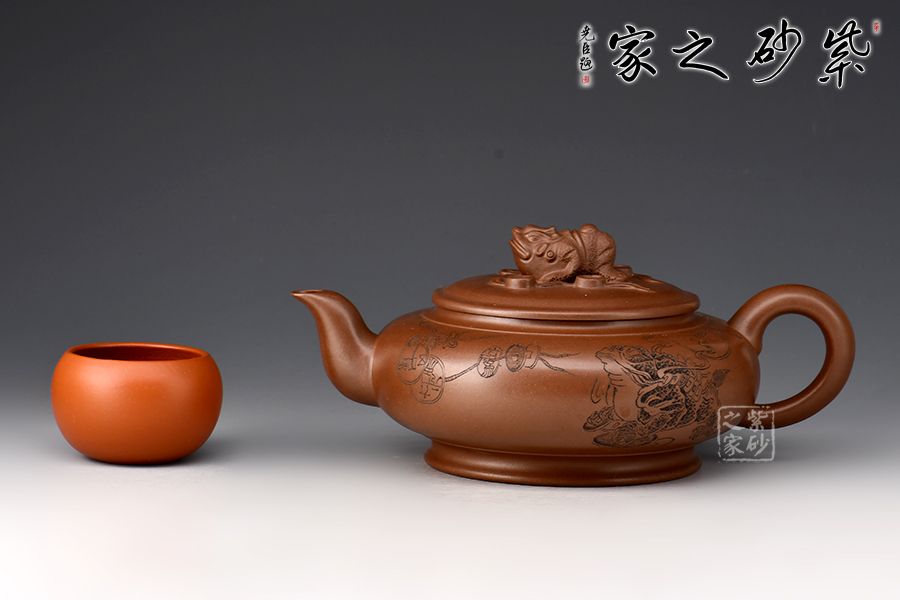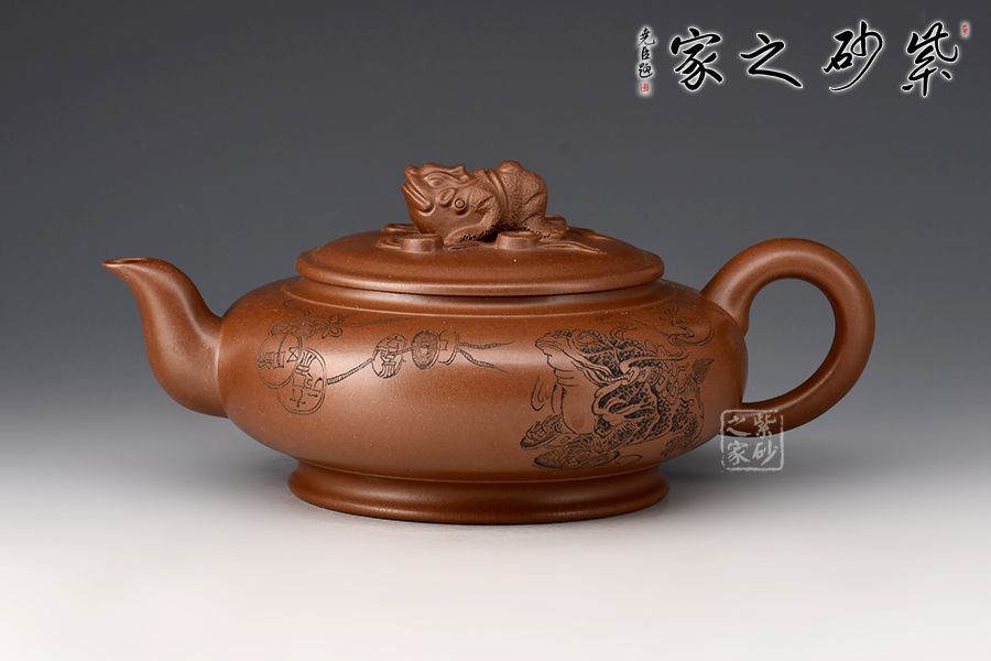 此壺壺身略扁,壺鈕為一只金蟾,彎流線條流暢,出水爽利,耳把與流壺相應(yīng)和,壓蓋設(shè)計(jì),整體協(xié)調(diào)統(tǒng)一,壺器與主題相符合,代表著納福祝福,祥和的福運(yùn)。