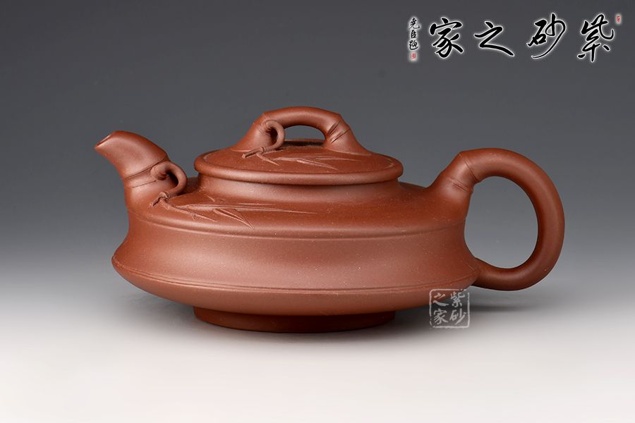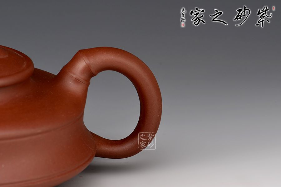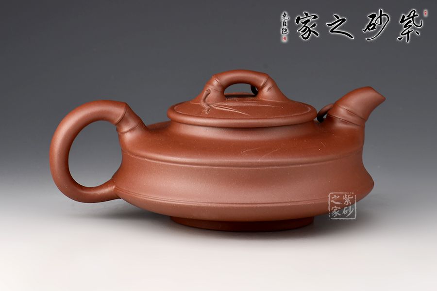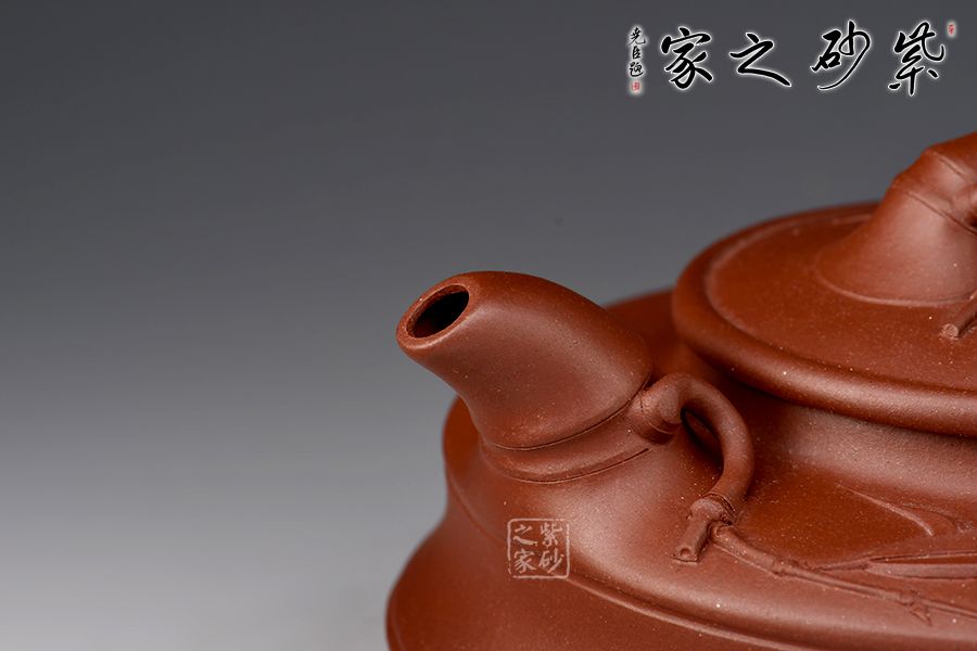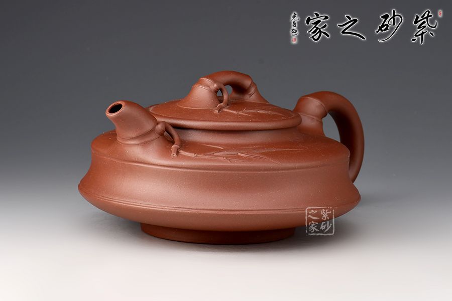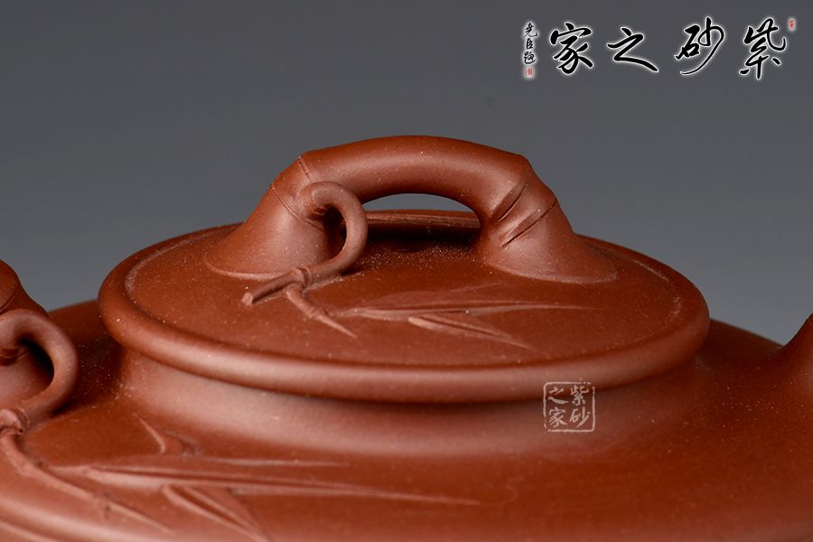 造型扁一分,制作難十分!這把扁竹鼓無(wú)愧技巧與藝術(shù)兼?zhèn)涞募炎?!竹鼓又稱竹筒鼓、升筒鼓。此壺壺身扁圓,形似兒童擊鼓傳花的花鼓,肩部有兩條圓環(huán),平壓蓋使此壺工整凸顯技藝之精湛。流、把、鈕均為竹節(jié)造型,協(xié)調(diào)流暢,壺鈕和壺流處貼花的手法胥出兩枝竹葉,栩栩如生,自然風(fēng)趣。整壺扁平,簡(jiǎn)約中凸顯細(xì)膩,平穩(wěn)中彰顯大氣。
