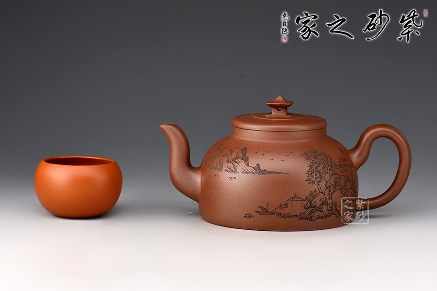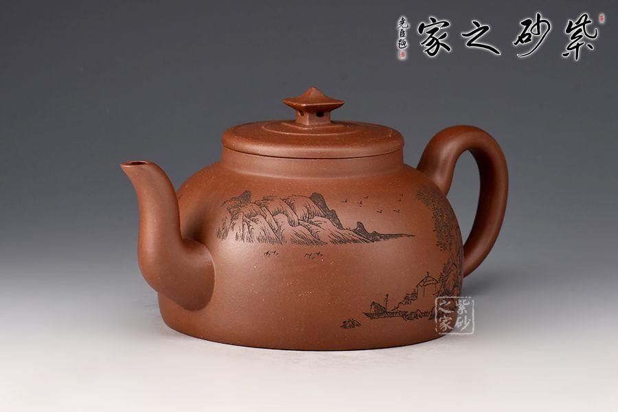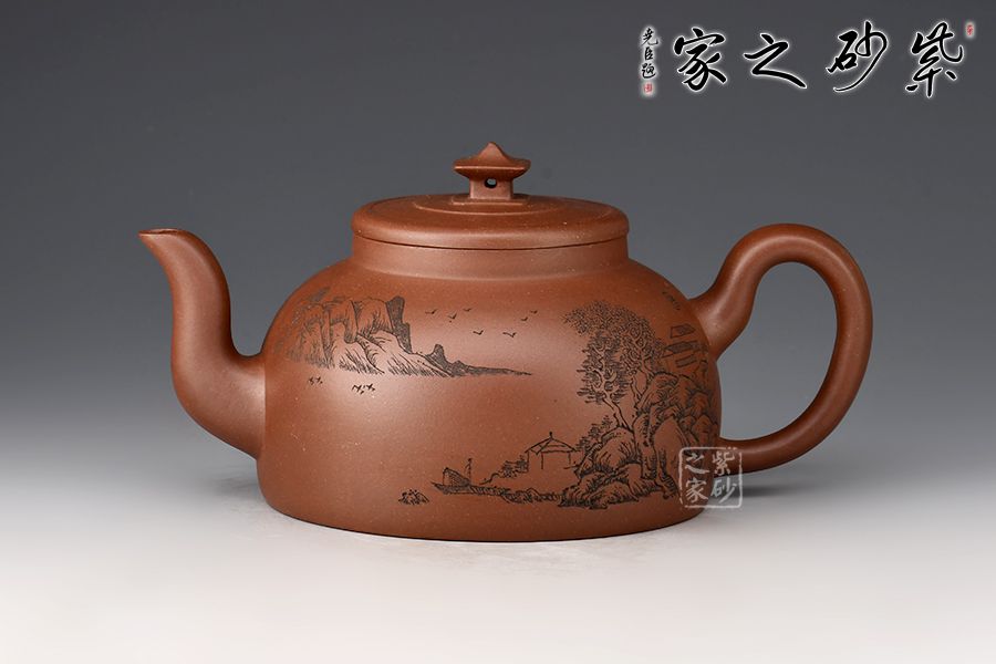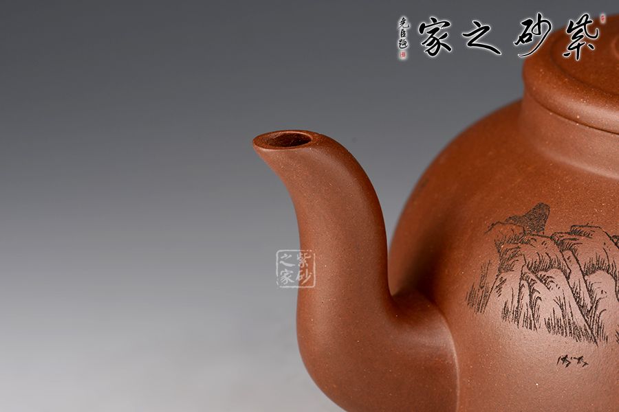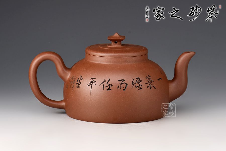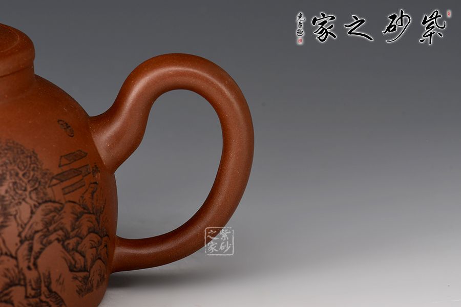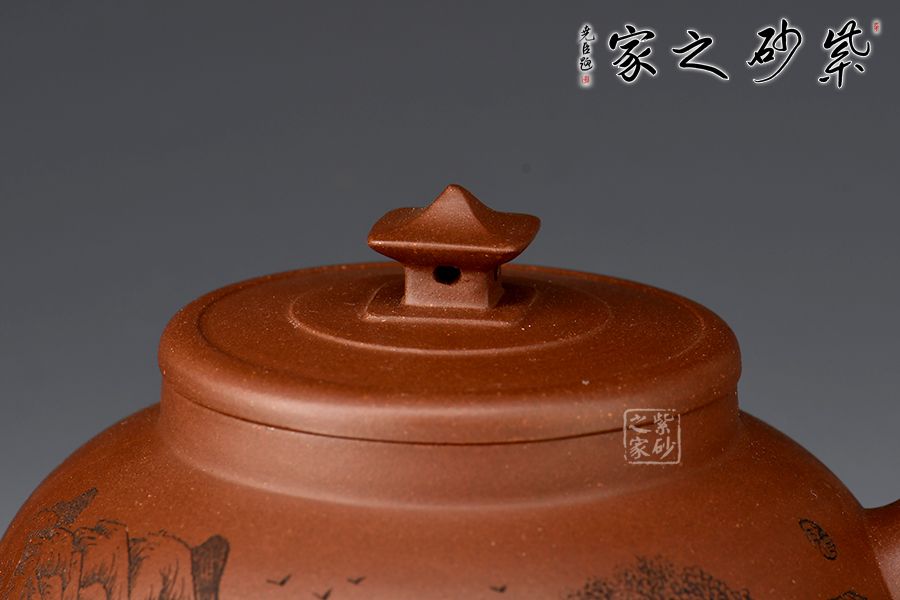 此壺壺身半圓,彎流線條流暢,自壺身蜿蜒而出,耳形把粗細過度自然,此壺的最大亮點在于亭臺樣壺鈕,照應(yīng)主題“玉亭”,平蓋與壺口嚴絲合縫,大口蓋,投茶方便。壺身刻繪“一蓑煙雨任平生”,可見作者灑脫之志趣!