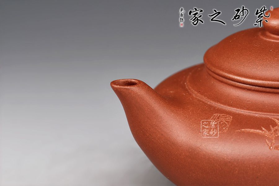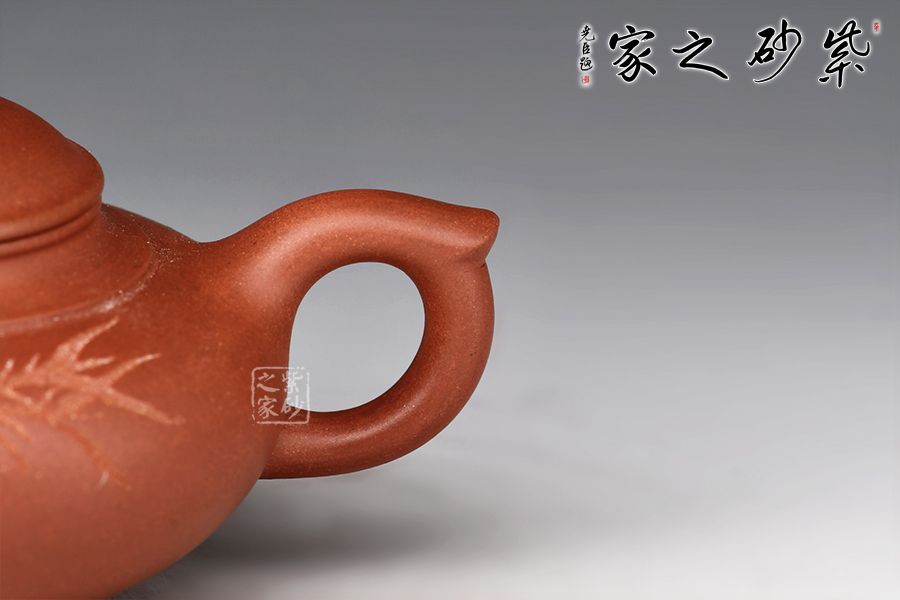 此款扁櫻壺在笑櫻的基礎(chǔ)上略加改變,壺身略扁,但扁而不塌,壺流與壺身渾然一體,好似一氣呵成,圈把與流兩相呼應,協(xié)調(diào)雅致。扁竹壺鈕為縮小版的壺身,拿捏舒適。