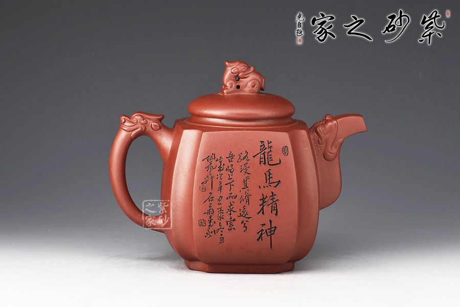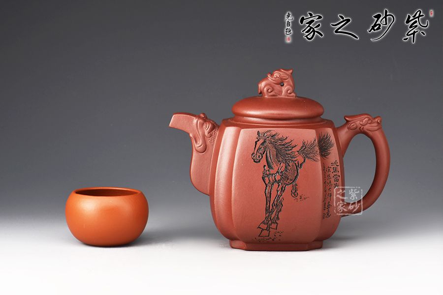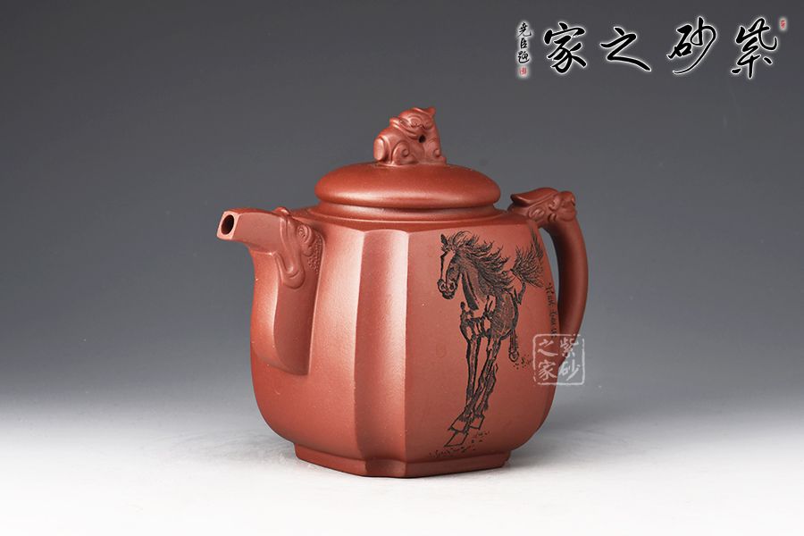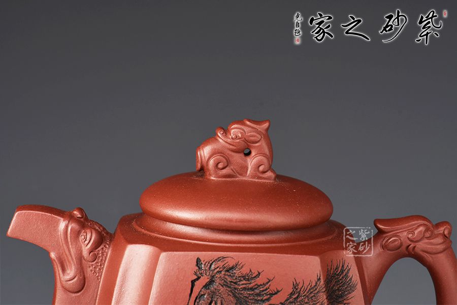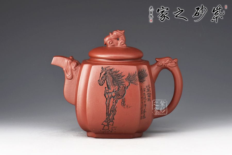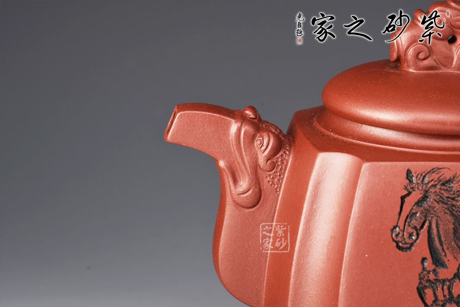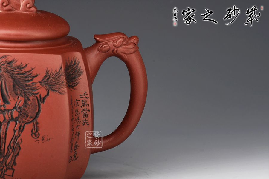 壺取“龍行天下”為名,龍是中華民族的圖騰,是我們國家精神的象征。此壺造型神形氣韻兼?zhèn)?,壺把、壺嘴及壺鈕皆有龍的元素,一壺三龍,霸氣十足。壺身刻繪一馬當先圖,另一面刻繪“龍馬精神”,給此壺賦予了深層次涵義。
